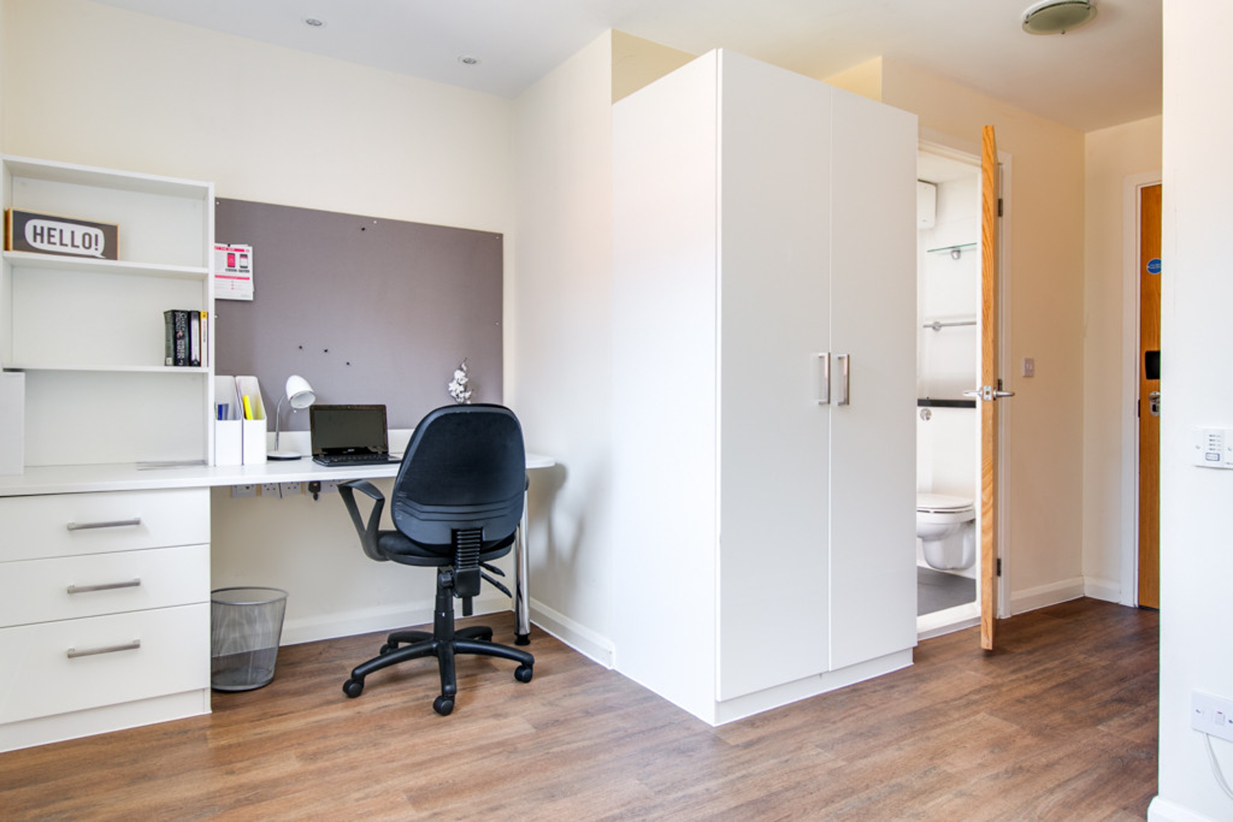 The most affordable of the self-contained studios. Enjoy your own fully fitted kitchenette, shower room, small double bed, plenty of storage, and study area.