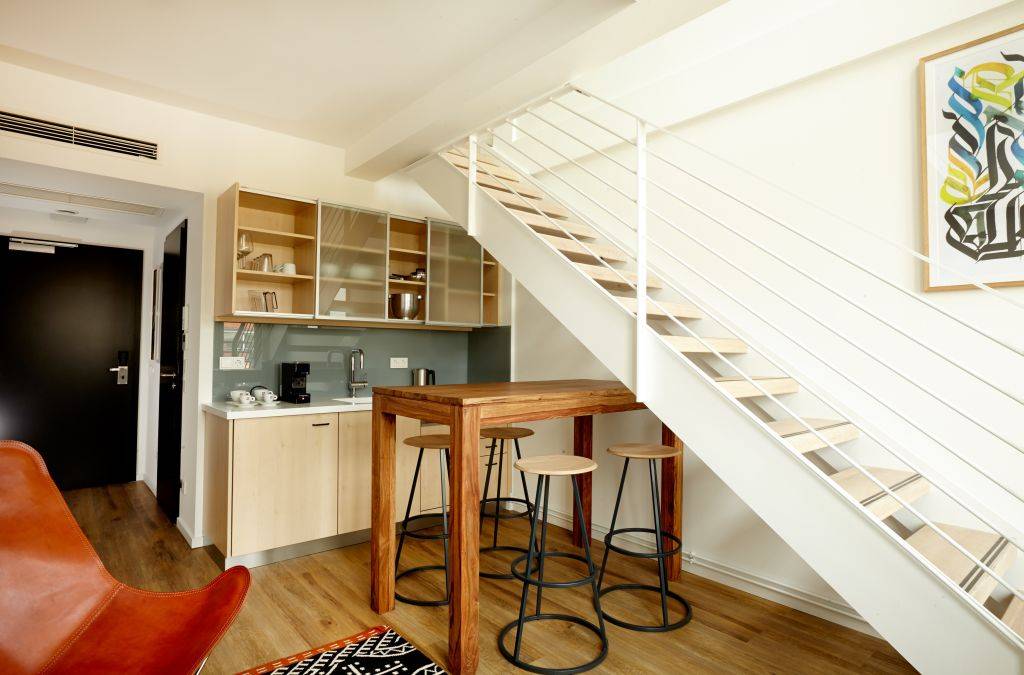 The 2-storey Design Studio Apartment offers a homely feeling with the right mix of elegance and high standard of living. The ground floor features a functional kitchen with dining area and borders on a fashionable living room with flat screen TV and a comfortable sofa bed for guests to enjoy a restful sleep. From the living room a staircase leads up to a partly glazed mezzanine, where there is no doubt to feel at home in the sleeping area on the gallery.Highlights: – Modern, spacious studio apartment – Large bathroom with shower – Large fitted kitchen with dishwasher – Double bed – Skylight, with the possibility to look at the starry sky at night – Desk with lamp – Comfortable armchair – Sofa bed – Kitchen table – Contact person 24/7 in the house – Free WLAN – Weekly cleaning including bed linen and towel change- Welcome Package with some coffee pads and body care productsIn addition, there is the possibility to use all facilities available in the house, such as washing machine room, breakfast buffet, bicycle rental. However, these services are charged separately.Notice: Displayed prices and data are not final, and should be used for informative purpose only. They are not contractual or binding. Energy pass This building is not subject to EnEV.