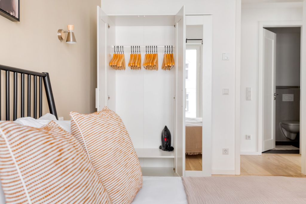 This furnished apartment is located in Schöneberg, centrally-located in Berlin and one of the city’s most vibrant neighborhoods. Eclectic Schöneberg is known for its hip boutiques and the thriving nightlife scene centered around Nollendorfplatz. There’s also a diverse culinary scene, with plenty of international options. The neighborhood is also home to Kaufhaus des Westens, a massive luxury department store with an entire floor dedicated to gourmet foods. Another local gem is Hans-Baluschek Park, a lovely green space where you can take a long walk or play sports with friends. Schöneberg is served by several S-Bahn, U-Bahn and bus lines.