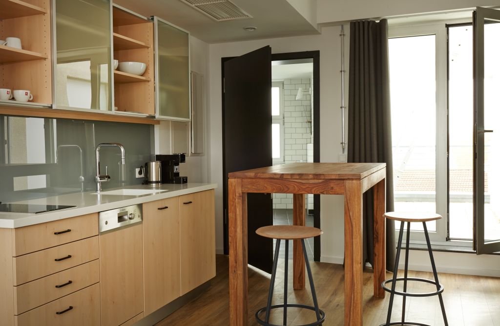 The spacious studio was completely renovated and furnished in 2015. It is characterized by its high-quality equipment and a small terrace with a view over Berlin. The studio offers a very homely feeling and impresses with a smart room concept.Highlights:- Modern, spacious studio apartment- Large bathroom with shower and window- Large fitted kitchen with dishwasher- double bed- desk with lamp- Comfortable armchair- kitchen table- Contact person 24/7 in the house- Free WiFi- Weekly cleaning including bed linen and towel change- Welcome Package with some coffee pods and personal care productsIn addition, there is the possibility to use all facilities in the house such as washing machine room, breakfast buffet, bike rental. However, these services are charged separately.Notice: Displayed prices and data are not final, and should be used for informative purpose only. They are not contractual or binding. Energy pass This building is not subject to EnEV.
