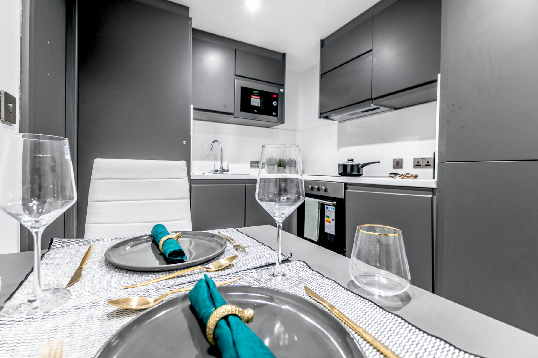 This private luxury studio comes complete with a fully fitted modern kitchenette, a three quarter sized bed, and a large en-suite bathroom. You will have plenty of space in this large studio which is a brilliant 22m2! You will also have residents only access to the private cinema room, gaming lounge, private hire dining room, fully equipped fitness suite, panoramic landscaped roof terrace as well as contemporary loungess.