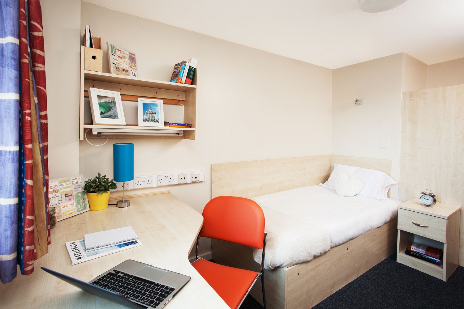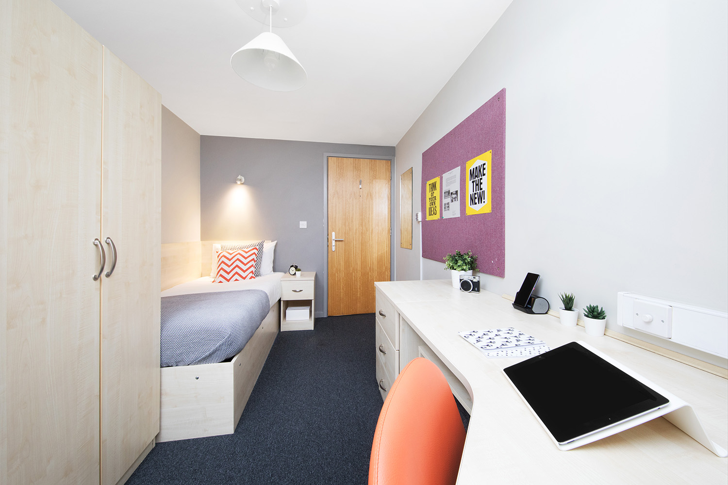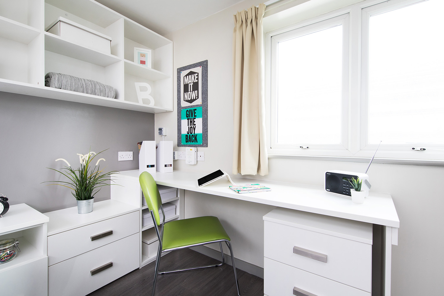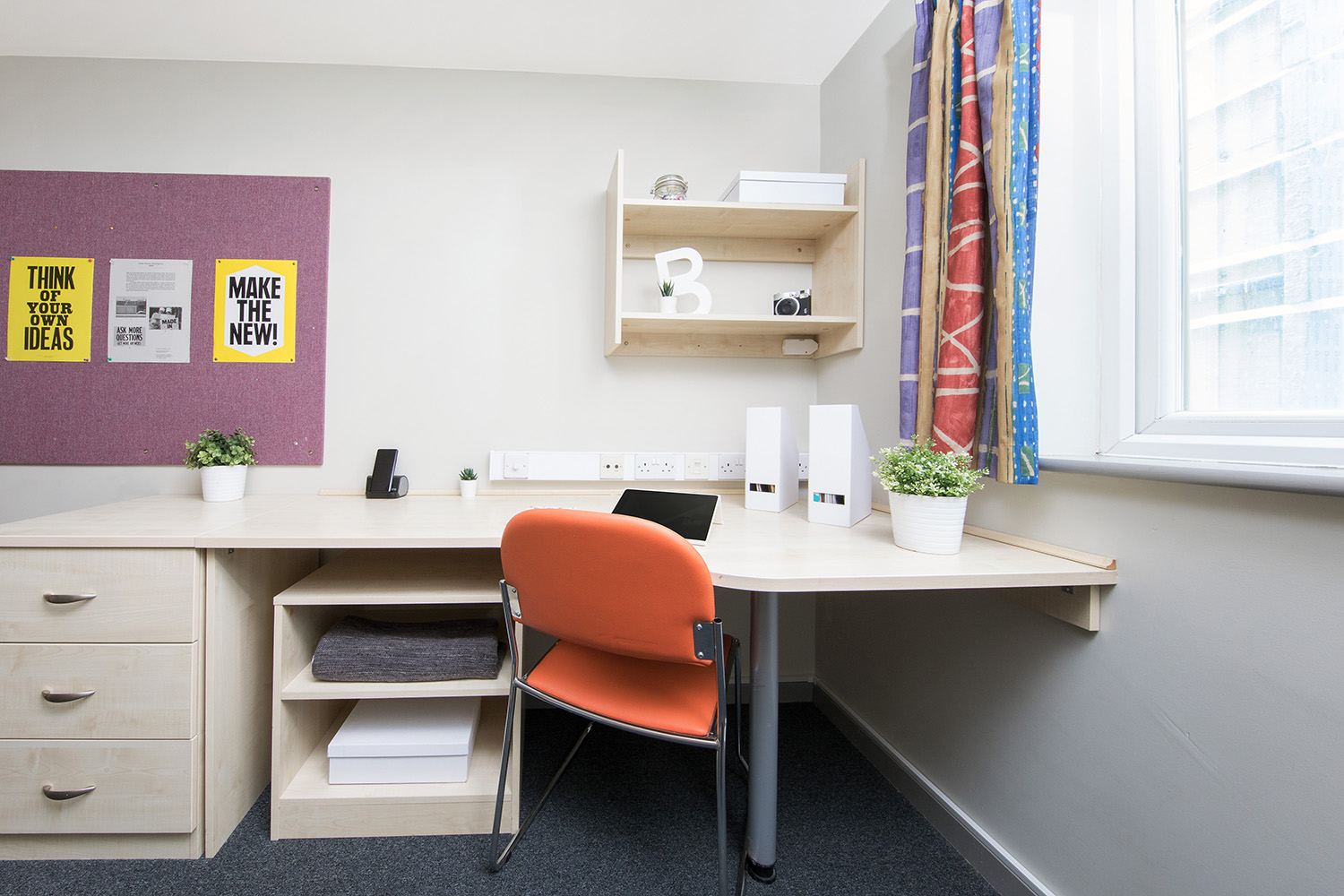 Non en-suite rooms are ideal if you are happy to share a bathroom and fully fitted kitchen with your flatmates. Our non en-suite rooms have a comfortable bed, a wardrobe, plenty of additional storage for your belongings and a Wi-Fi connected study space.
