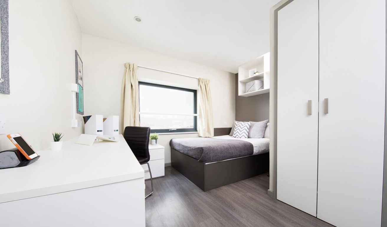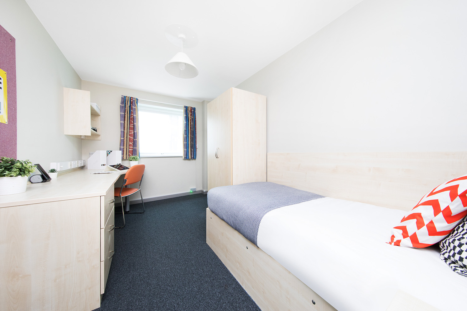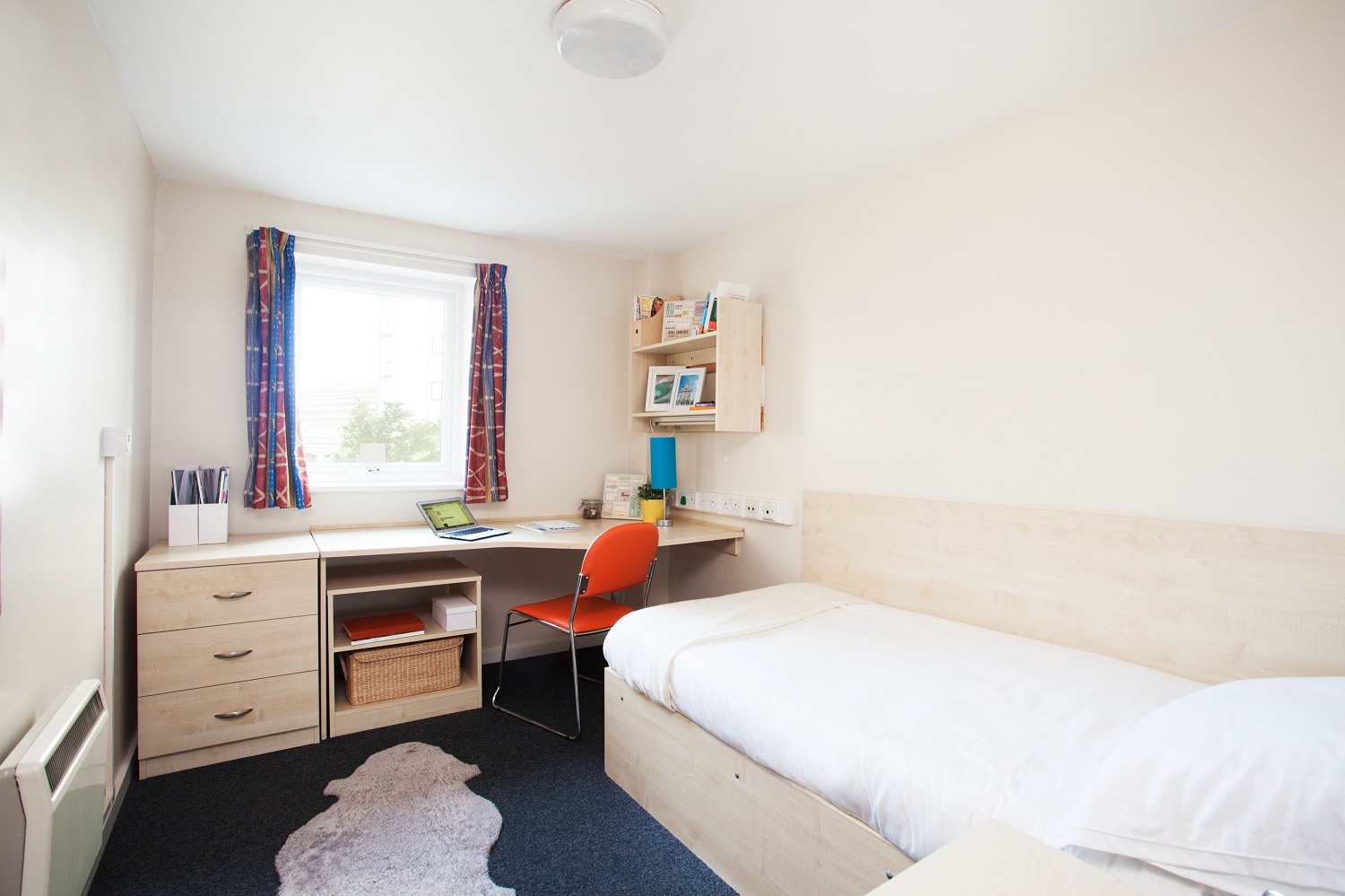 Non en-suite rooms are ideal if you are happy to share a bathroom and fully fitted kitchen with your flatmates. Our non en-suite rooms have a comfortable bed, a wardrobe, plenty of additional storage for your belongings and a Wi-Fi connected study space.
