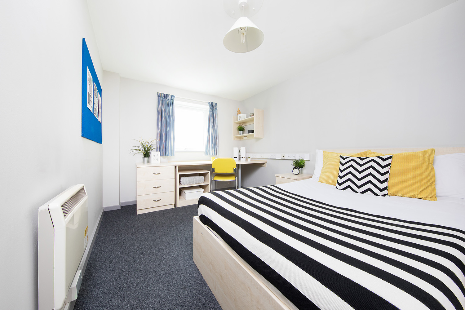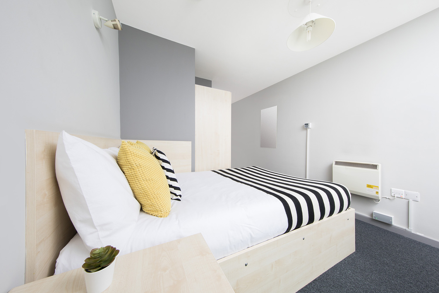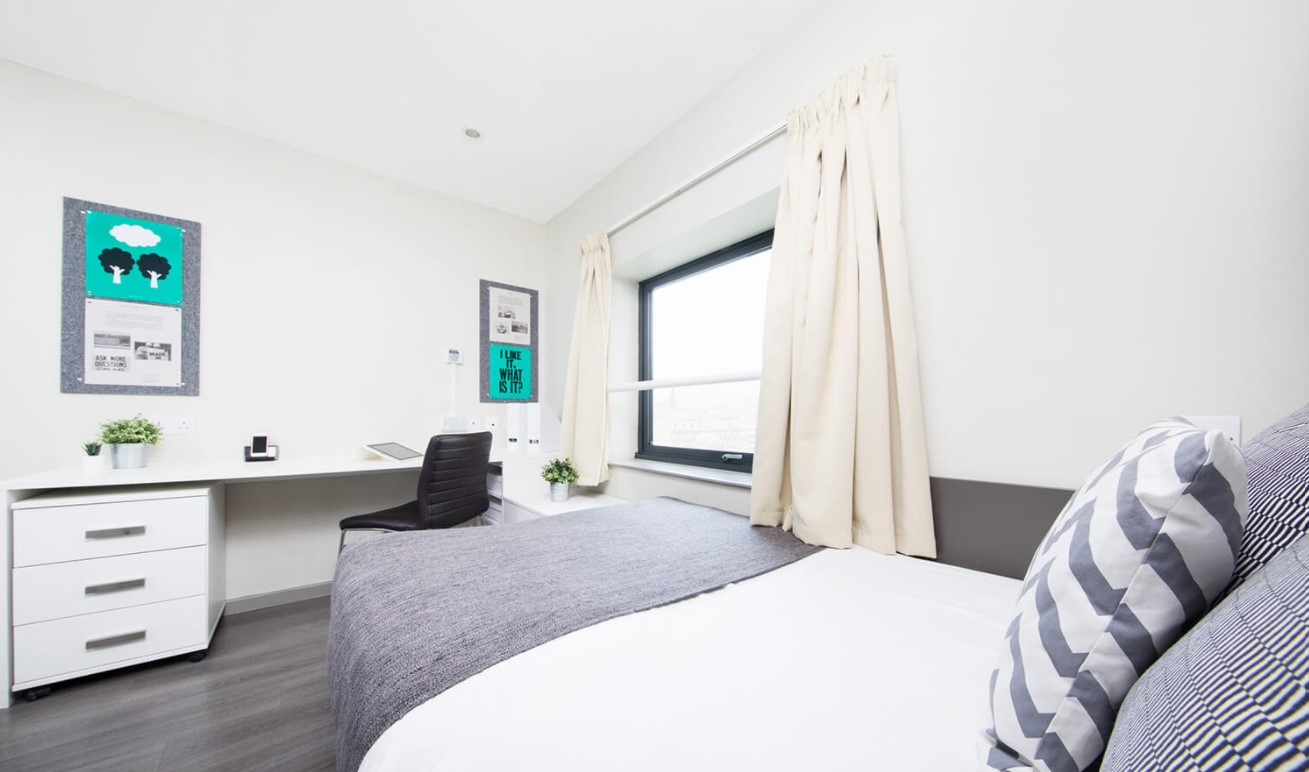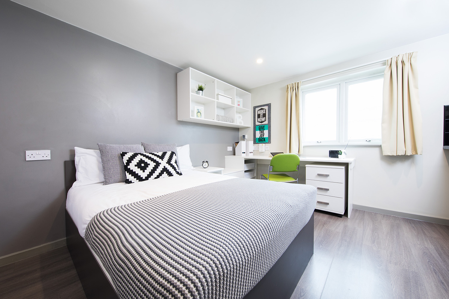 Non en-suite rooms are ideal if you are happy to share a bathroom and fully fitted kitchen with your flatmates. Our non en-suite rooms have a comfortable bed, a wardrobe, plenty of additional storage for your belongings and a Wi-Fi connected study space.