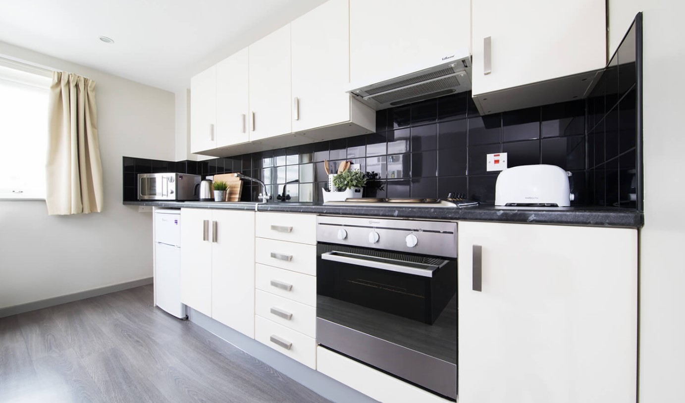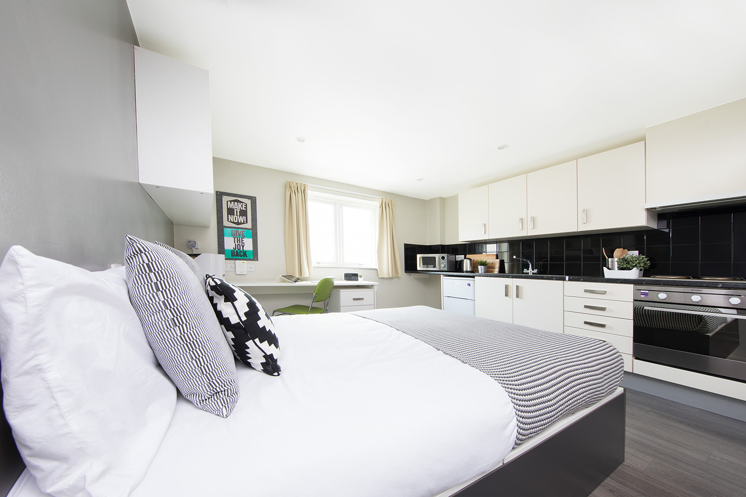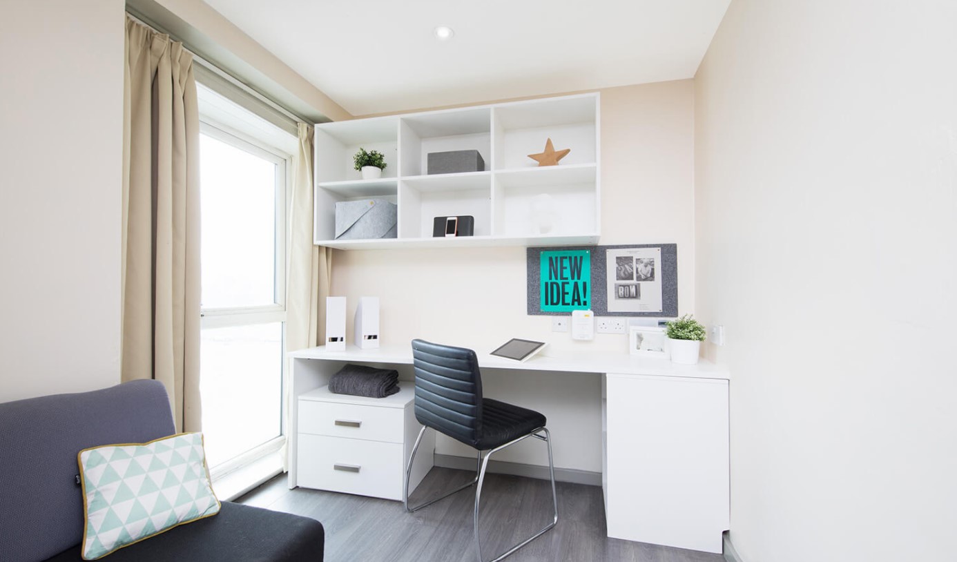 Our studio rooms are perfect for students looking for more privacy. You will have your own en-suite bathroom and fully fitted kitchen, as well as a comfortable bed, a wardrobe, plenty of additional storage for your belongings, and a Wi-Fi connected study space.