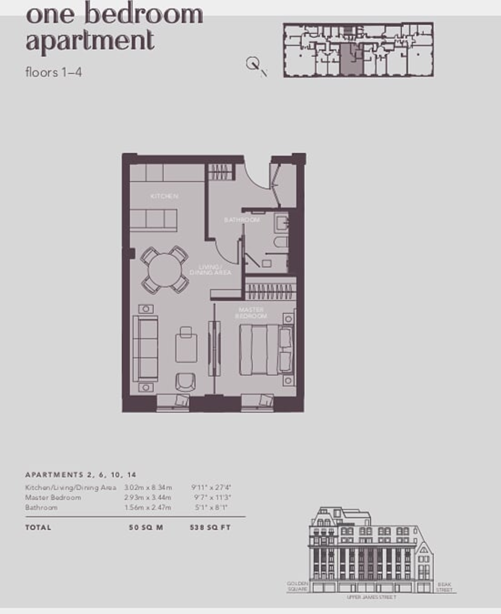 The apartment offers an oasis of calm and a place to retreat.Every inch of space has been specified for maximum enjoyment, with the foundations of the building – high ceilings and large windows – enhanced by an intelligent arrangement of internal space. Plush textiles are layered with contemporary finishes to envelop residents in modern-day luxe.There is a modern living room with dining for two. To add to your comfort there is a flat-screen TV.The fully equipped kitchen area is complete with an oven, microwave oven, induction hob with concealed extraction unit, integrated fridge freezer, integrated dishwasher all for your use. All the pots, pans, and utensils needed to make a simple meal are provided.The apartment has one bedroom with one double bed. Sleep well surrounded by fine wallpapers and soft furnishings that reflect the woolen and yarn heritage of Golden Square. The flat has 1 bathroom, equipped with a shower.Notice: Displayed prices and data are not final, and should be used for informative purpose only. They are not contractual or binding. Energy pass This building is not subject to EnEV.