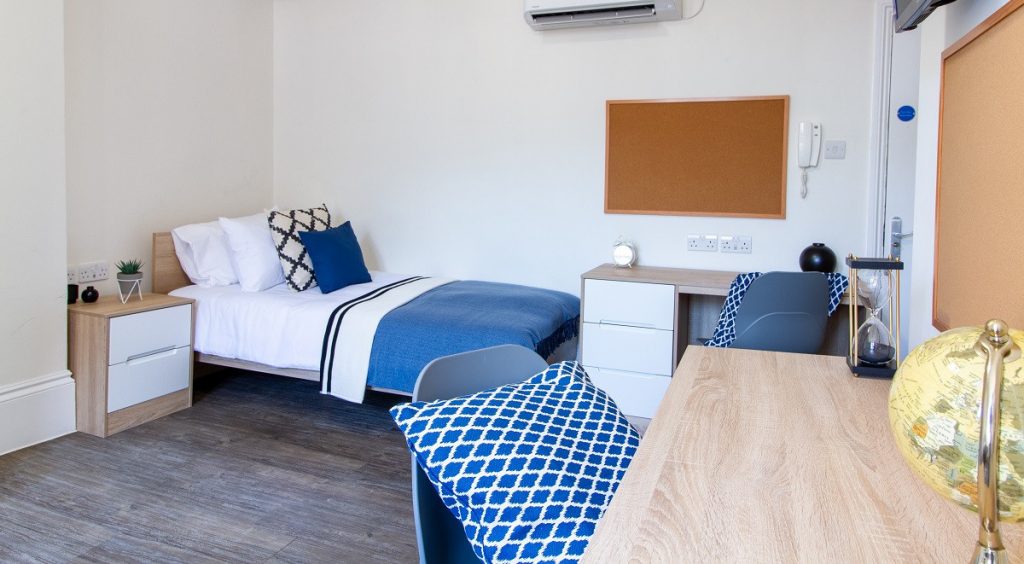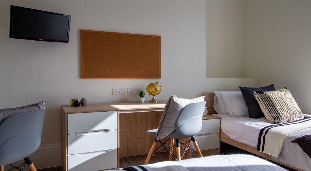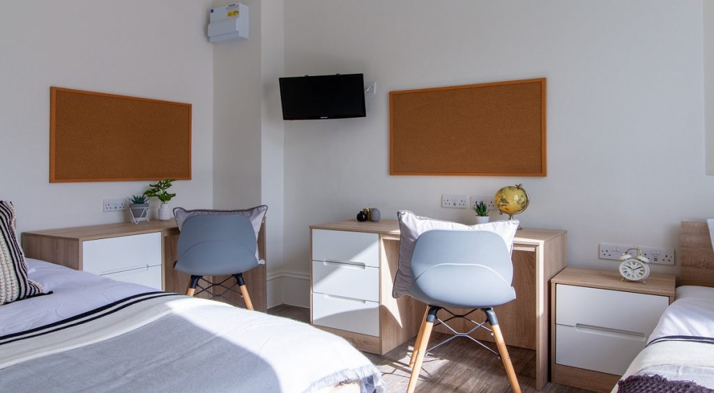 A spacious self-contained shared studio measuring approx 23m² with two single beds. All of our Bronze Twin Studio have a private kitchenette and a modern en-suite bathroom as well as study desks and plenty of storage.