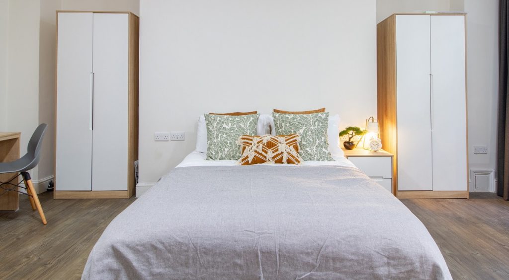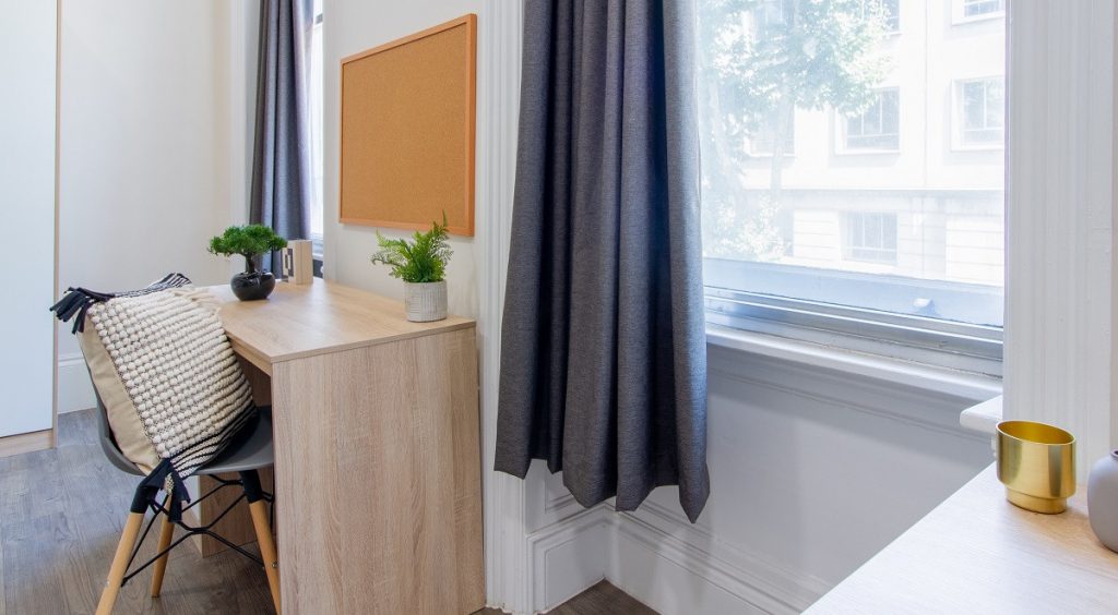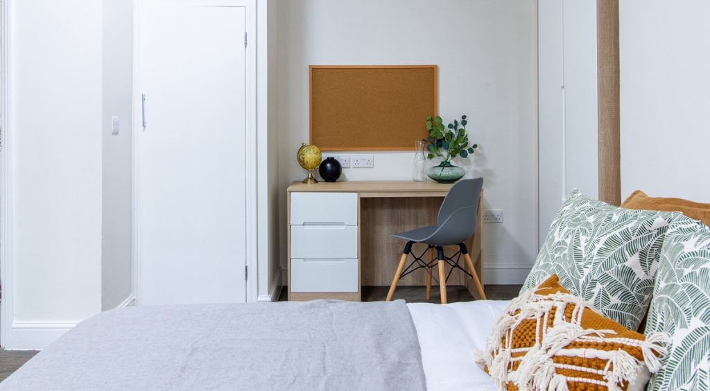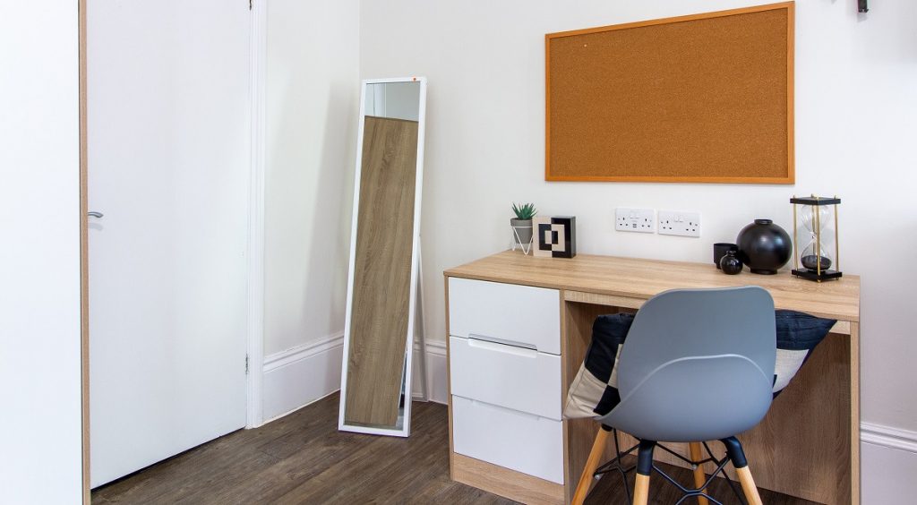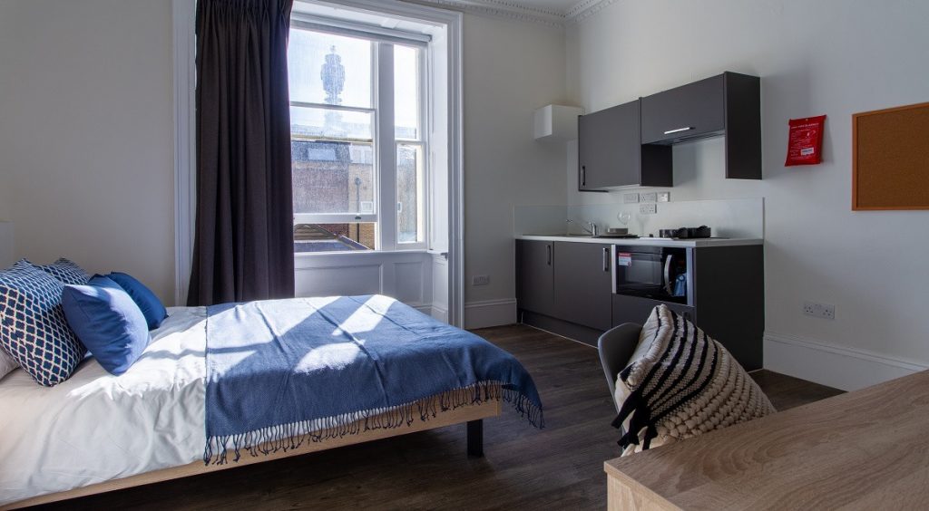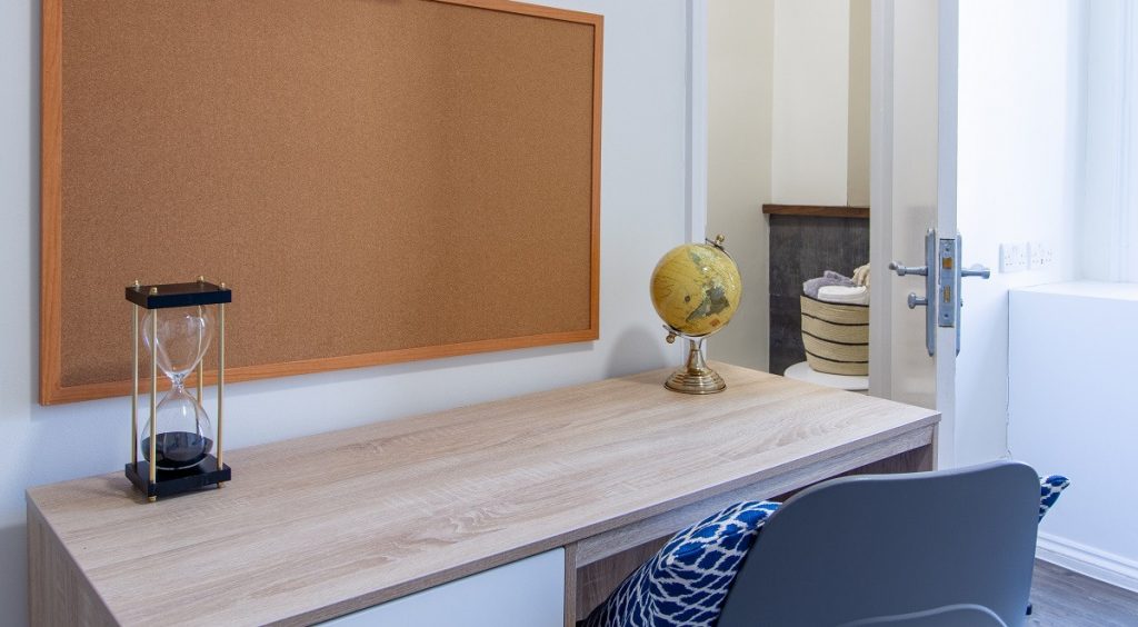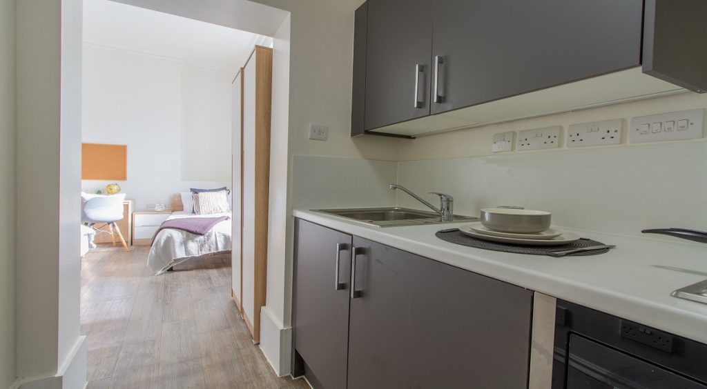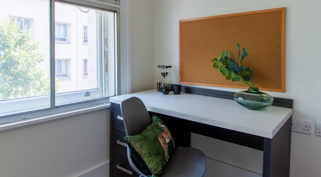 The Gower Studio is a an open plan bedroom measuring around 17-18m² with either a double or 3/4 size bed, study desk and plenty of storage. The studio has a modern en-suite bathroom and your own kitchenette within the room.