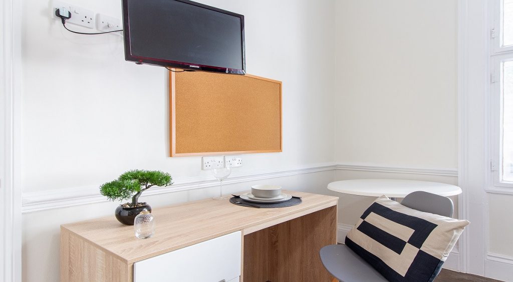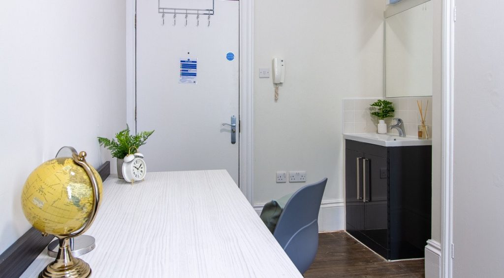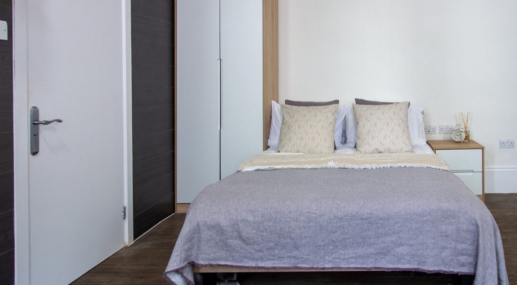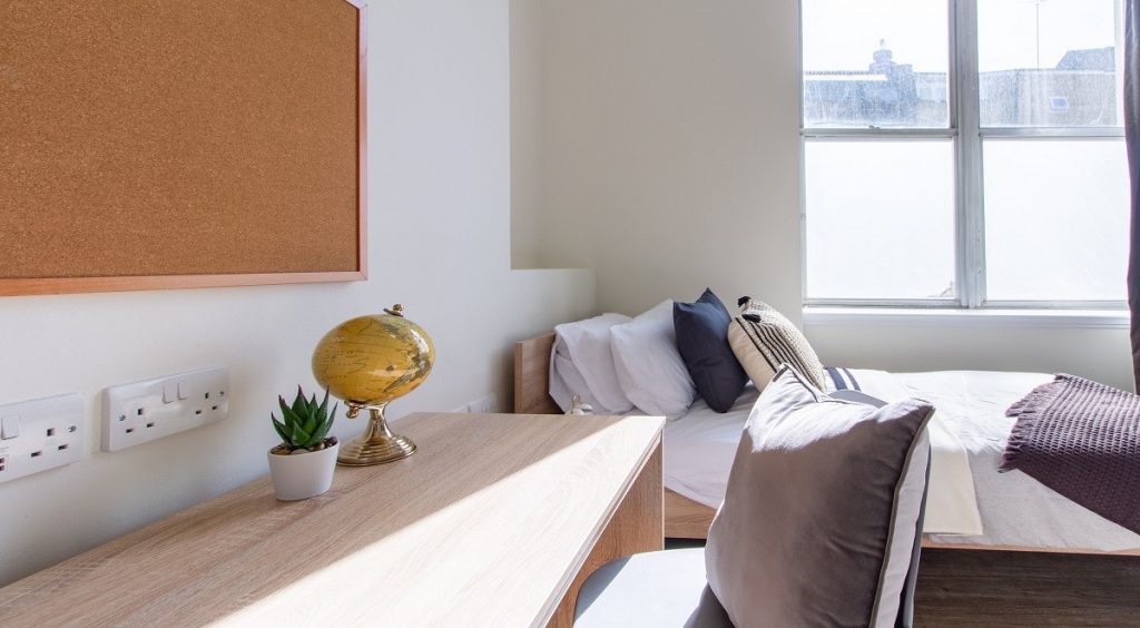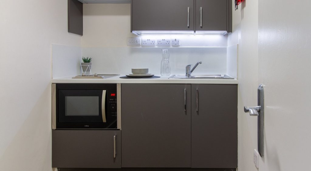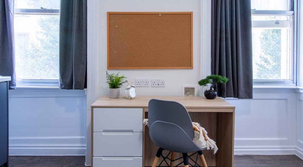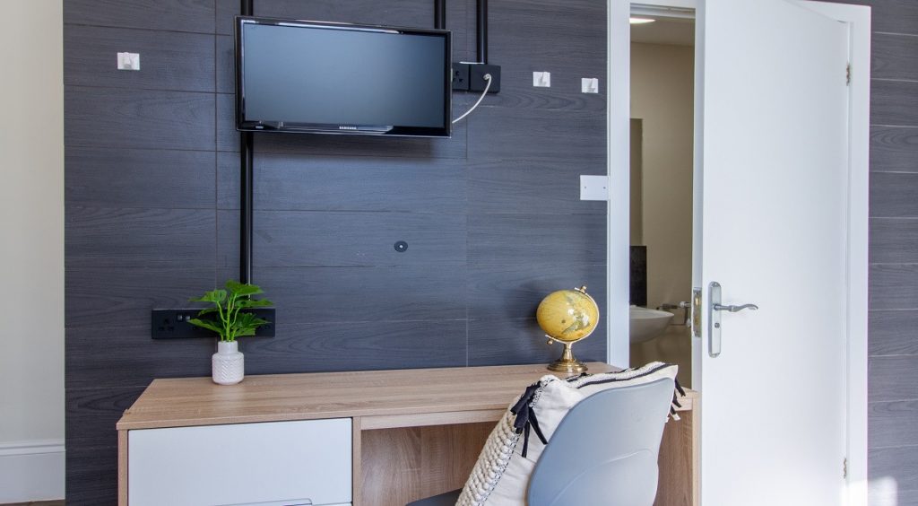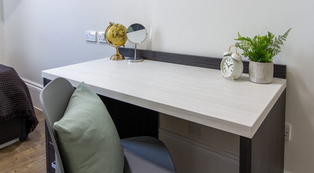 The Gower Studio is a an open plan bedroom measuring around 17-18m² with either a double or 3/4 size bed, study desk and plenty of storage. The studio has a modern en-suite bathroom and your own kitchenette within the room.
