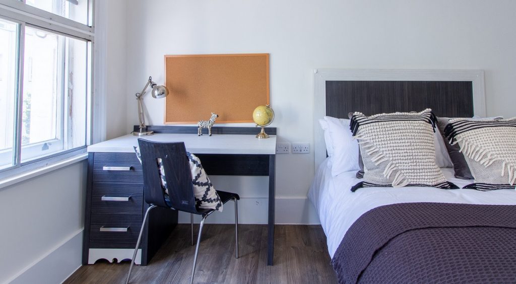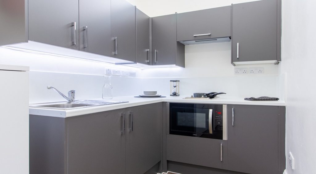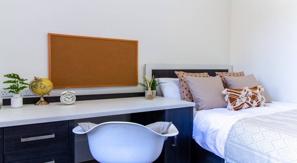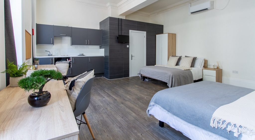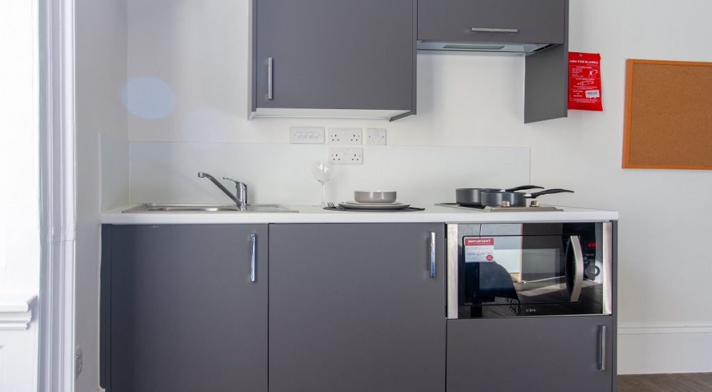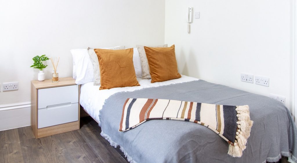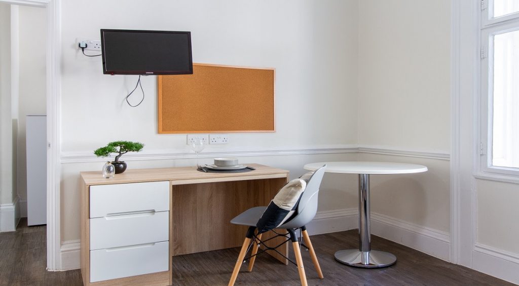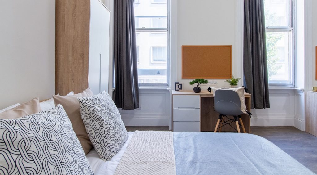 The Gower Studio is a an open plan bedroom measuring around 17-18m² with either a double or 3/4 size bed, study desk and plenty of storage. The studio has a modern en-suite bathroom and your own kitchenette within the room.