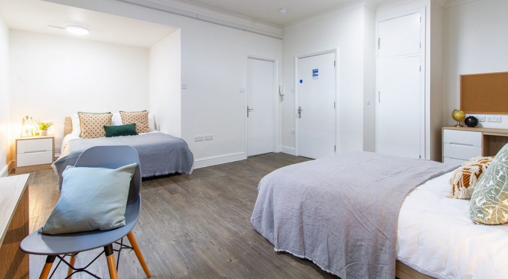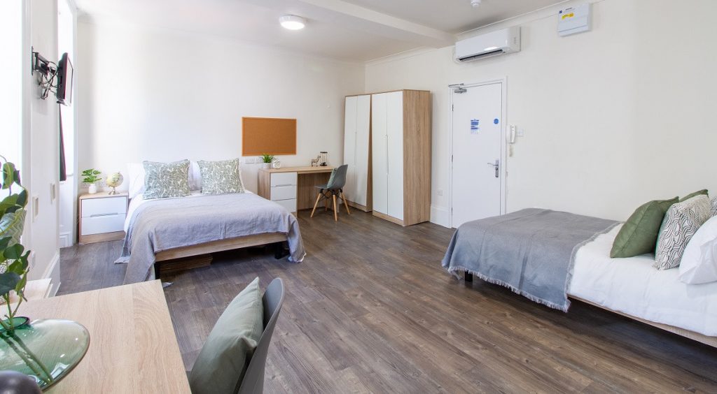 A spacious self-contained shared studio measuring approx 25-27m² with two 3/4 beds. All of our Gold Twin Studio have a private kitchenette and a modern en-suite bathroom as well as study desks and plenty of storage.