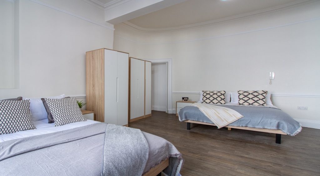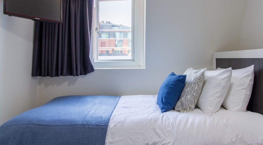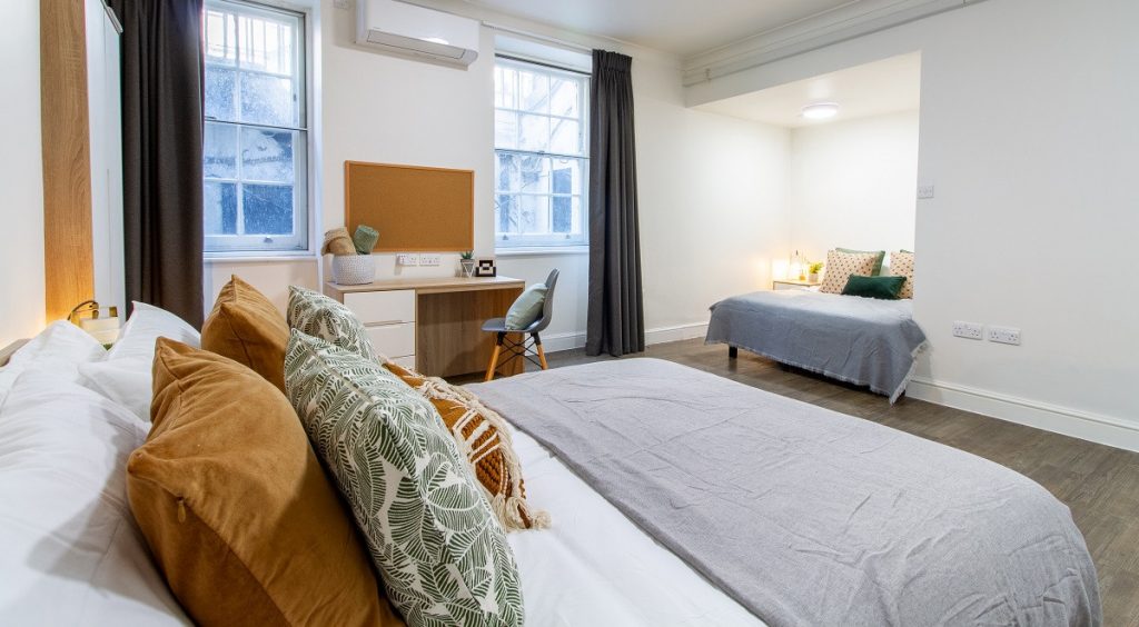 The Deluxe Twin Apartment is the largest room in the building measuring 52m², with two double beds in the large, shared room. The apartment is fitted out with contemporary furniture and with a large private kitchen with integrated appliances and a modern ensuite bathroom, the apartment is the height of luxurious student living. With unlimited 100Mbps wifi and newly refurbished common areas, outdoor courtyard, comfortable snug and on site laundry. Available for single occupancy.