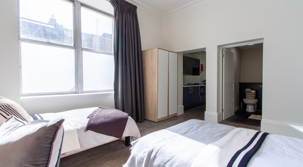 A spacious self-contained shared studio measuring approx 25-27m² with two 3/4 beds. All of our Bloomsbury Twin Studios have a private kitchenette and a modern en-suite bathroom as well as study desks and plenty of storage.