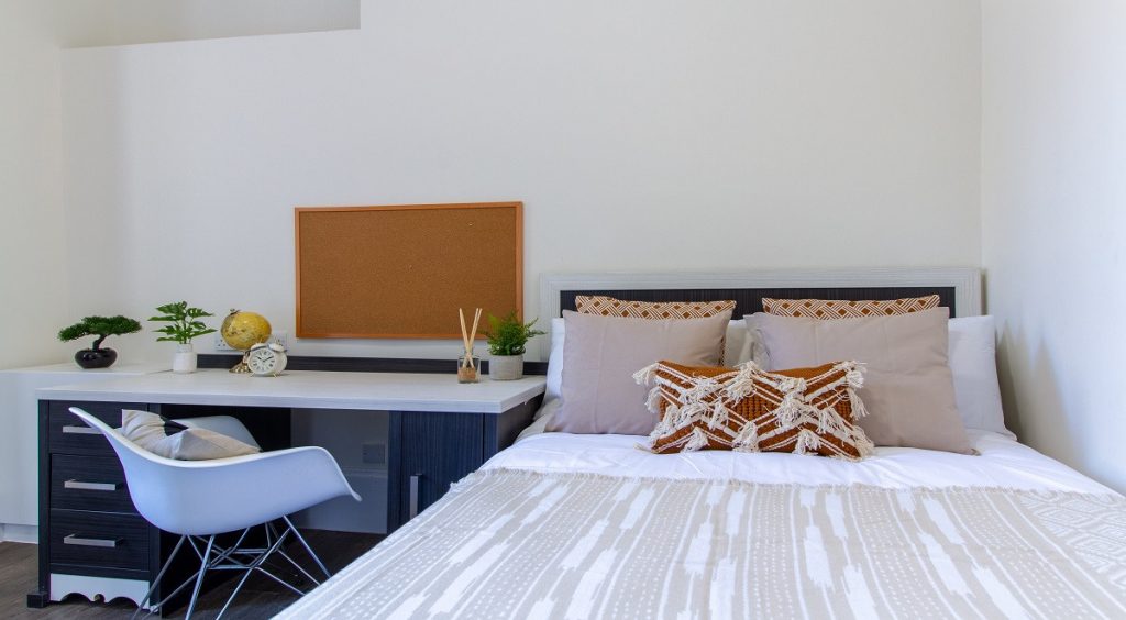 Platinum Twin Studio is a shared studio with two 3/4 sized beds or two double beds in a large, comfortable bedroom. The studio has an ensuite bathroom and kitchenette within the room with study desks and plenty of storage.