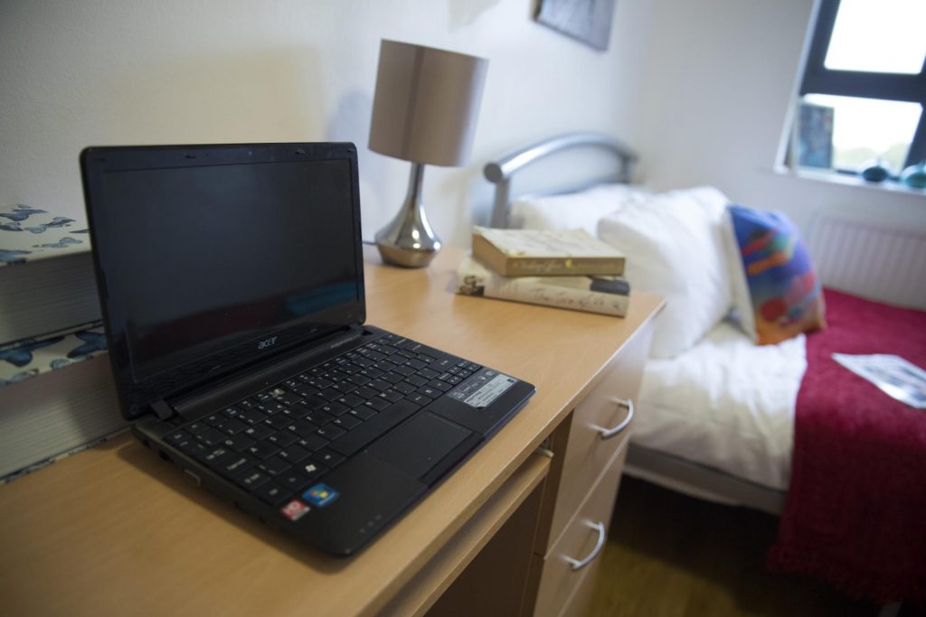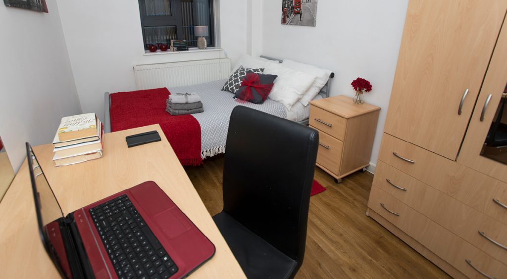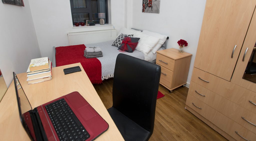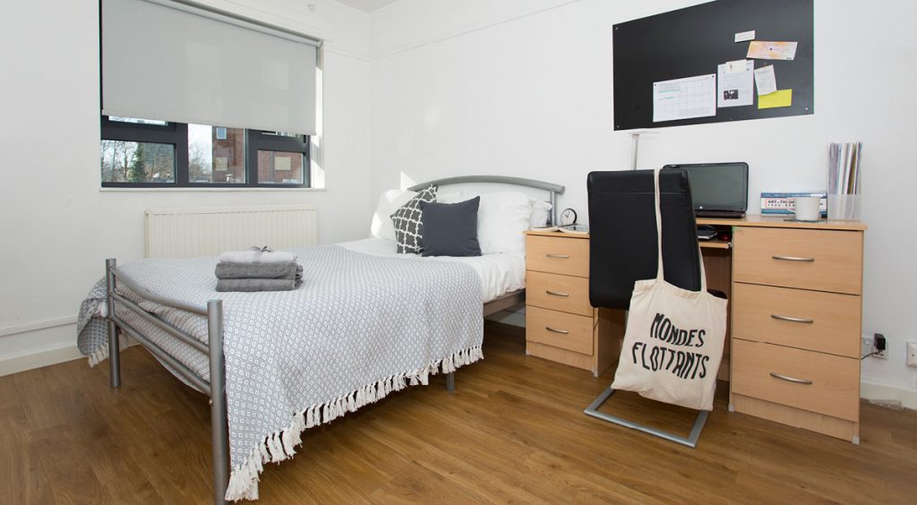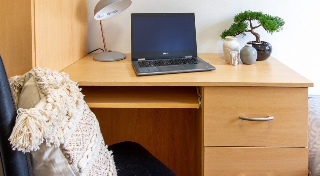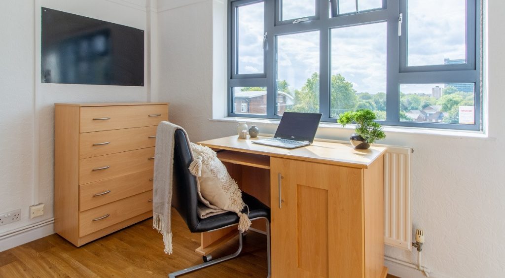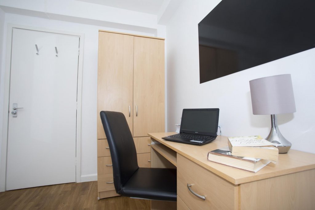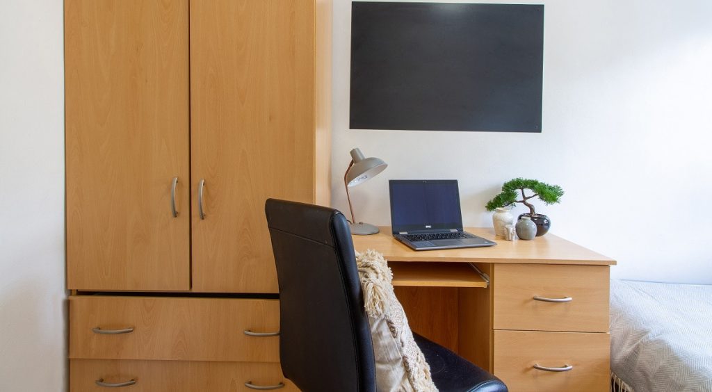 Check out our cabin style single bedroom, perfect if you want your own space with bags of storage. With a built-in wardrobe and storage unit in the bed, you can really utilise the space you’ve got! With your very own study desk and 100Mbps WiFi, you can crack on with your studying in peace and chill out later. The Essential Room does what it says on the tin, with everything you need in one cosy room. You’ll also get access to the fabulous shared kitchen and bathroom facilities, where you can mingle with your new pals.