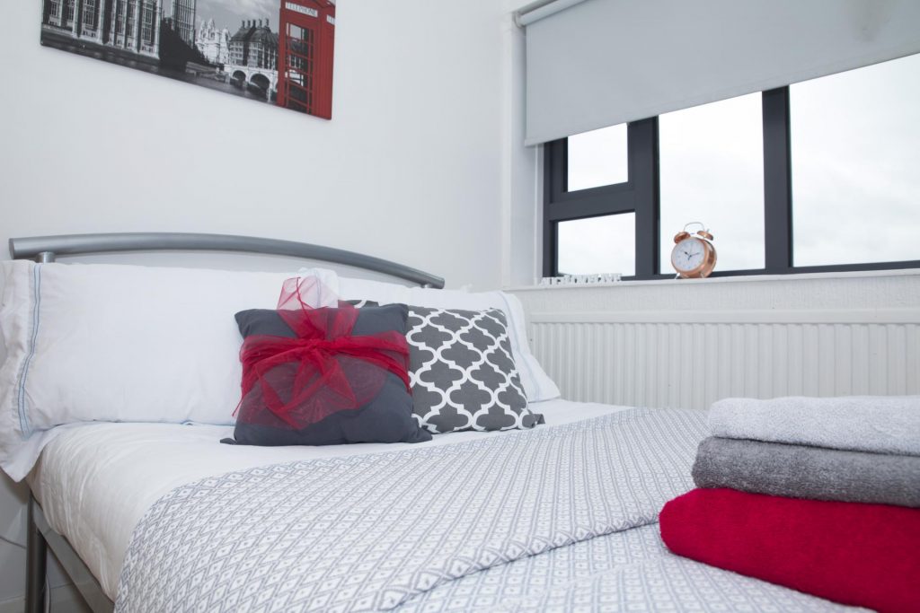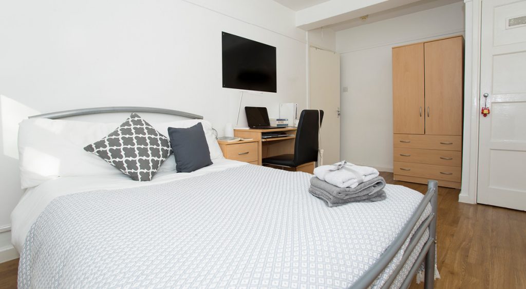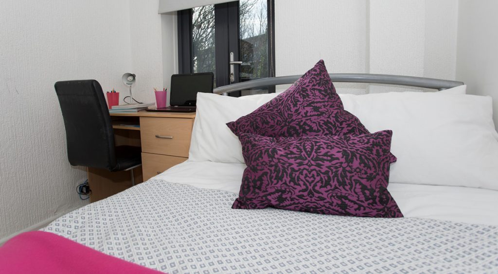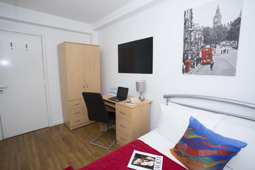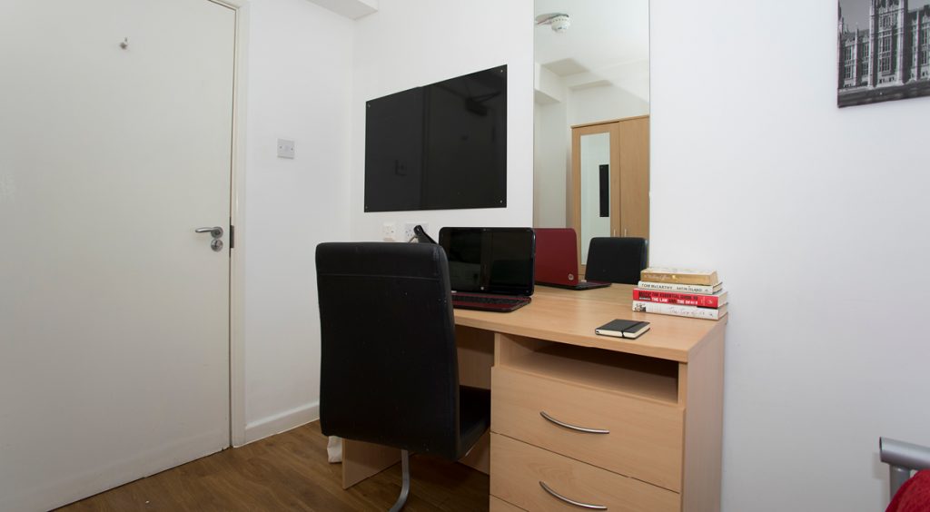 This lower ground bedroom is within a shared flat, and offers some gorgeous views from your window, with plenty of space too! Sink into your comfy ¾ bed and crack on with uni work at your very own study desk with no distractions. With a shared lounge and kitchen area you can chill out with your mates, watch TV, and cook up a storm! You also get 100Mbps WiFi throughout the building, so you can stream to your heart’s content, whether it’s online shopping or uni work!