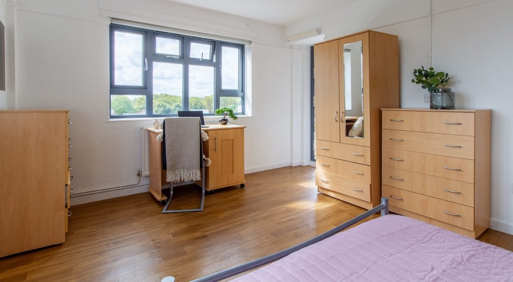 Our shared flat gives you the perfect opportunity to make some new pals! Each cosy room has a comfy ¾ bed, a study area, and a wardrobe for all your bits and bobs! The shared kitchen area has a breakfast bar and a TV, perfect for chilling out after a day of studying. You also get 100Mpbs WiFi throughout the building, ideal for a Netflix binge, as well as a shared shower room and toilet.