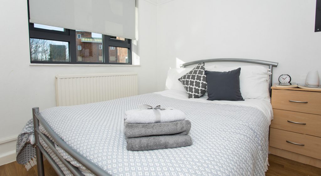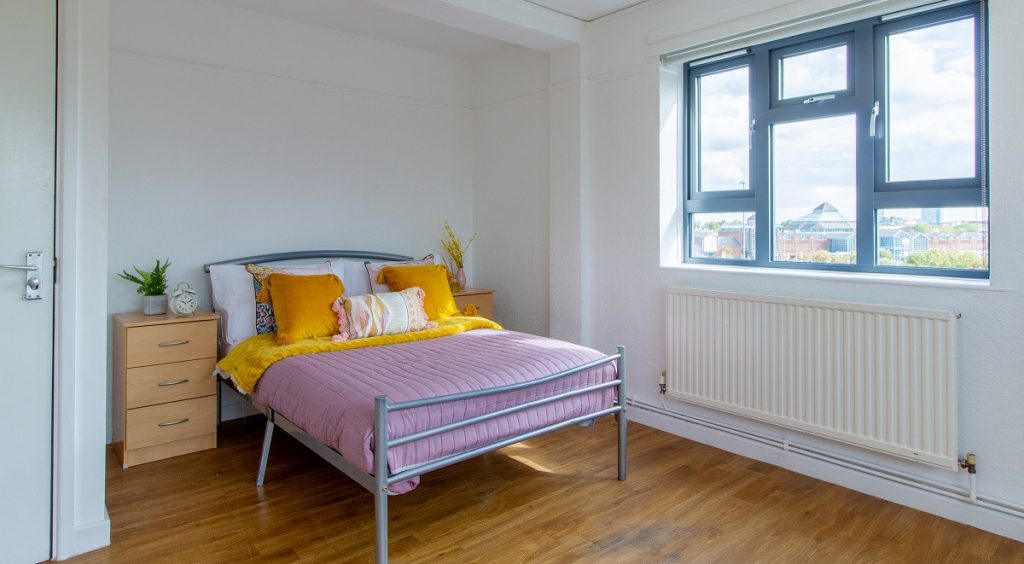 Ready to make some new pals? Each room in this modern shared flat has a comfy ¾ bed, perfect to sink into after a long day at uni! Crack on with work at your very own study desk and keep all your bits and bobs in a handy wardrobe! Your snazzy shared kitchen area has a breakfast bar and a TV, perfect for chilling out and having a laugh with your mates. 100Mpbs WiFi is also included throughout the building, ideal for a Netflix binge. The shared flat also includes a shared shower room and toilet.