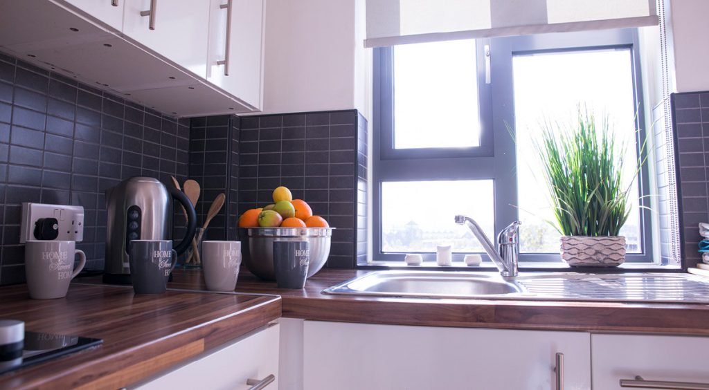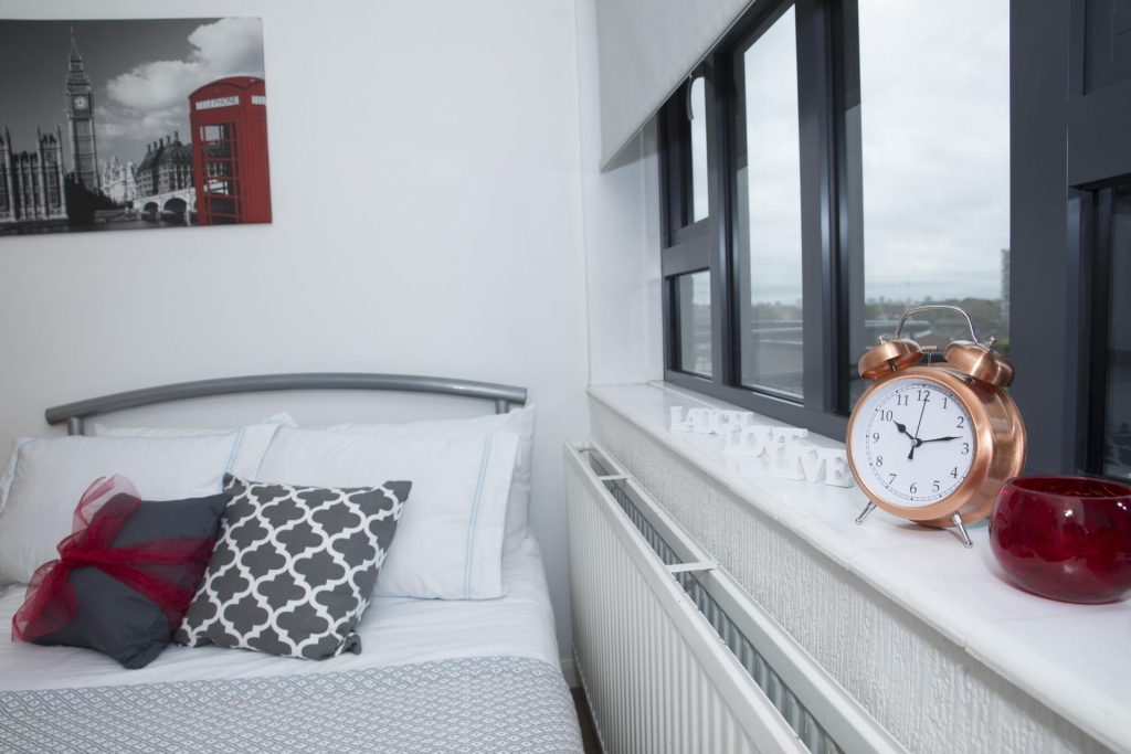 Our classic 5 bed has everything you need in one room! Snuggle into your ¾ bed after a long day at uni and get a fabulous night’s sleep. You get the comfort of studying at your very own desk and a handy wardrobe for all your bits and bobs. Get ready to chill out with your pals in the shared facilities, consisting of a snazzy kitchen area with a breakfast bar, TV, shower room and toilet. With 100 Mbps WiFi throughout the building, you can crack on with that all-important uni essay with ease.