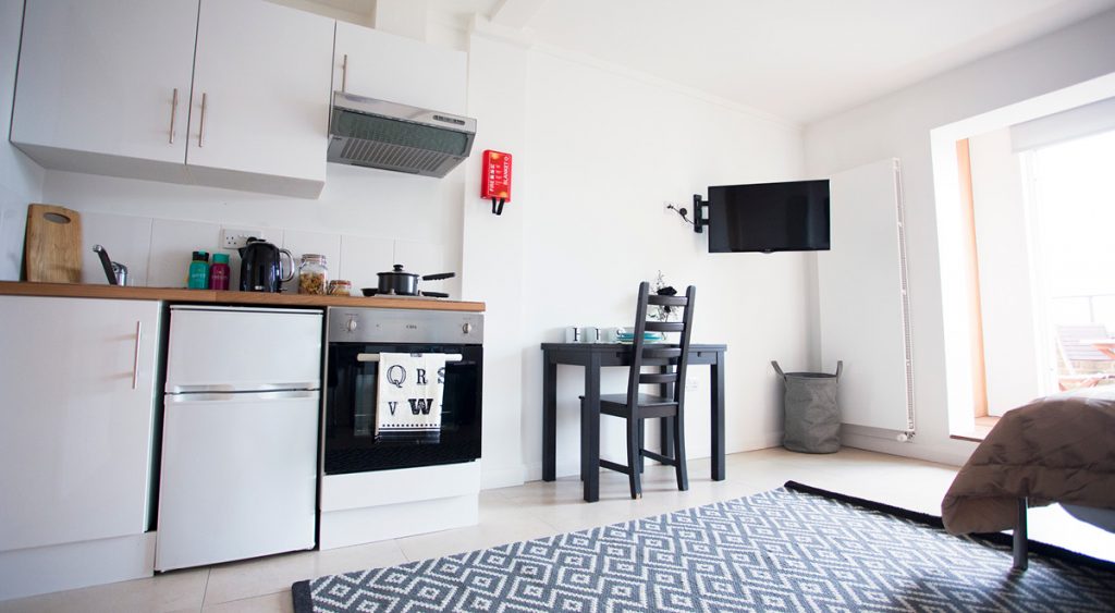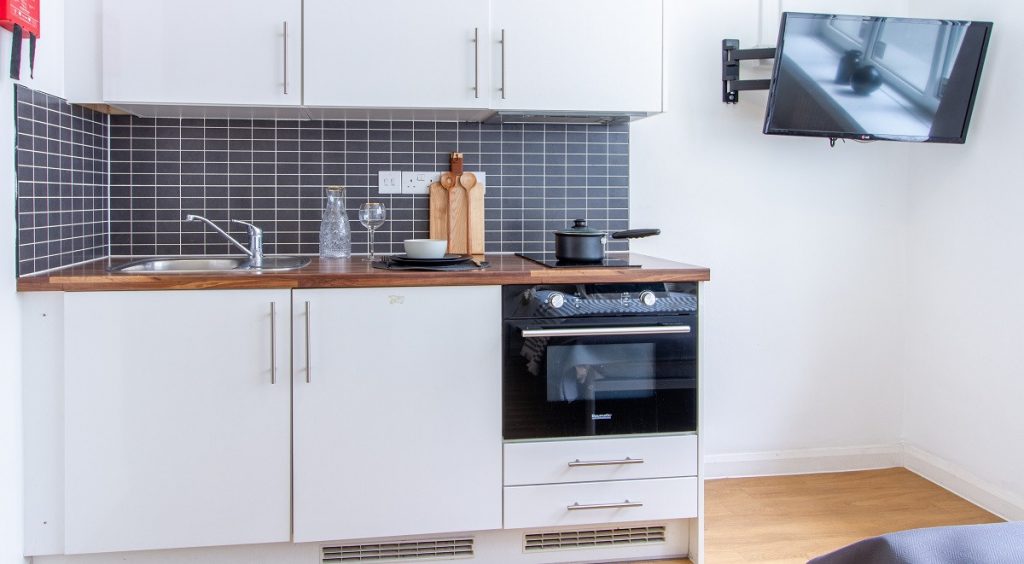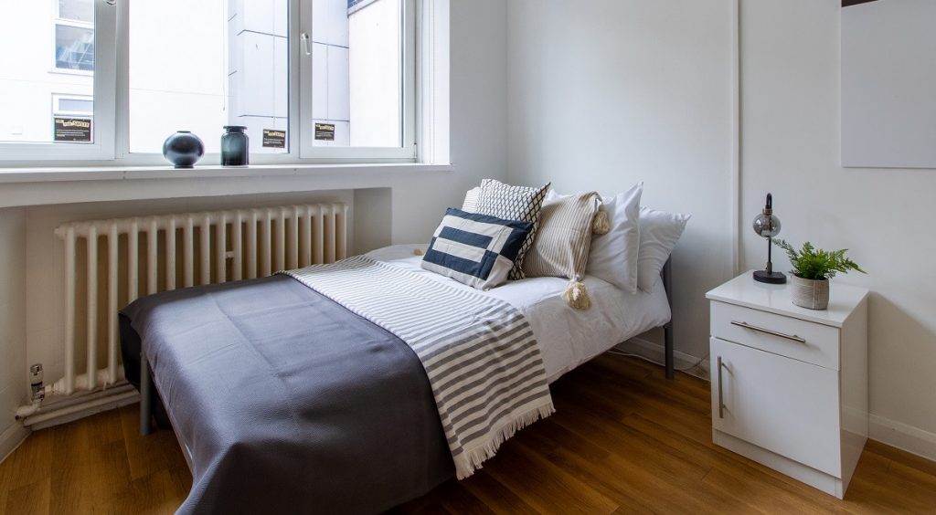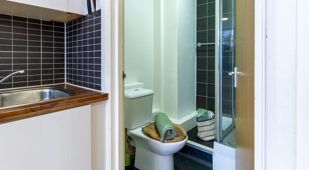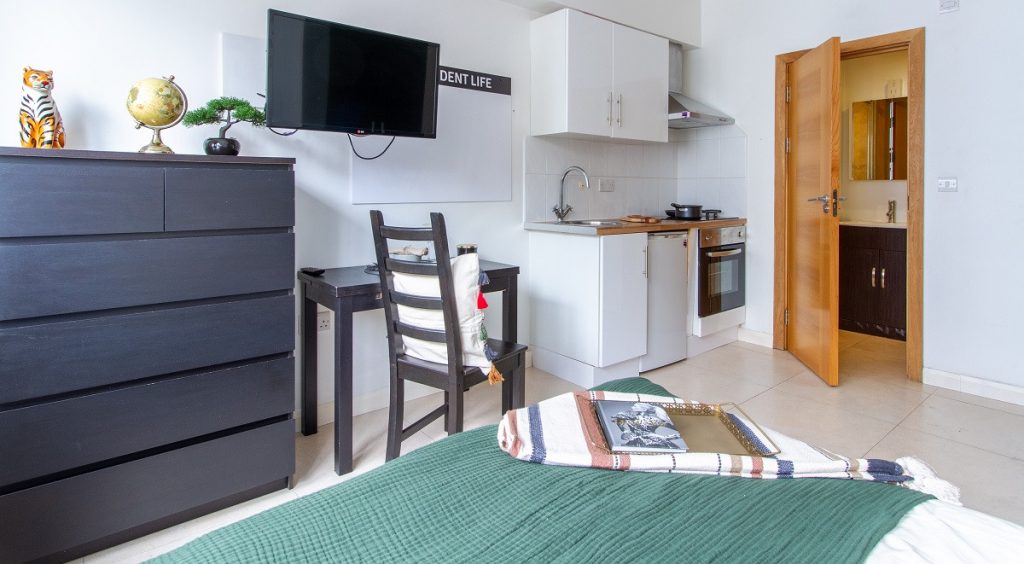 Want your own spacious studio with a comfy double bed? Then keep reading! Our self-contained studio measures around 15m² and comes with your very own personal en suite. With a fully fitted kitchenette, it’s time to cook yourself a delicious meal! Crack on in your quiet study area with no distractions and have a chilled Netflix binge afterwards on your 100Mpbs WIFI. The bright airy windows give your studio a spacious yet cosy feel, equipped with modern décor for that super cool aesthetic.