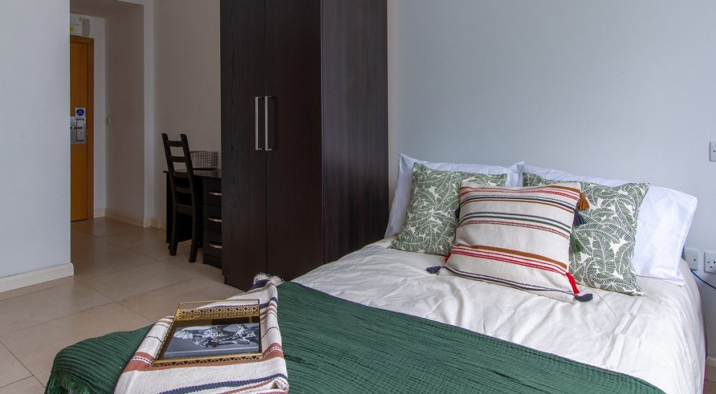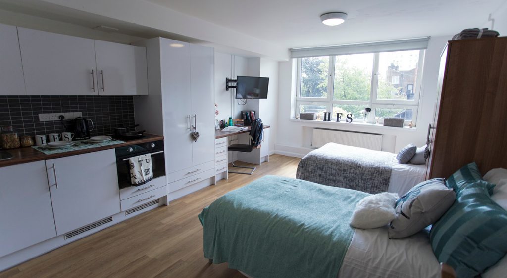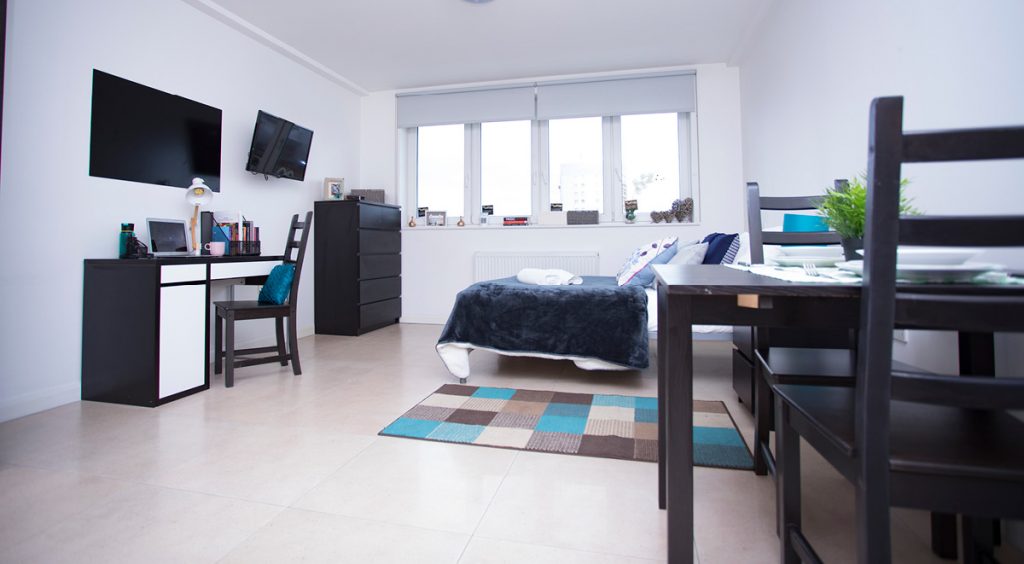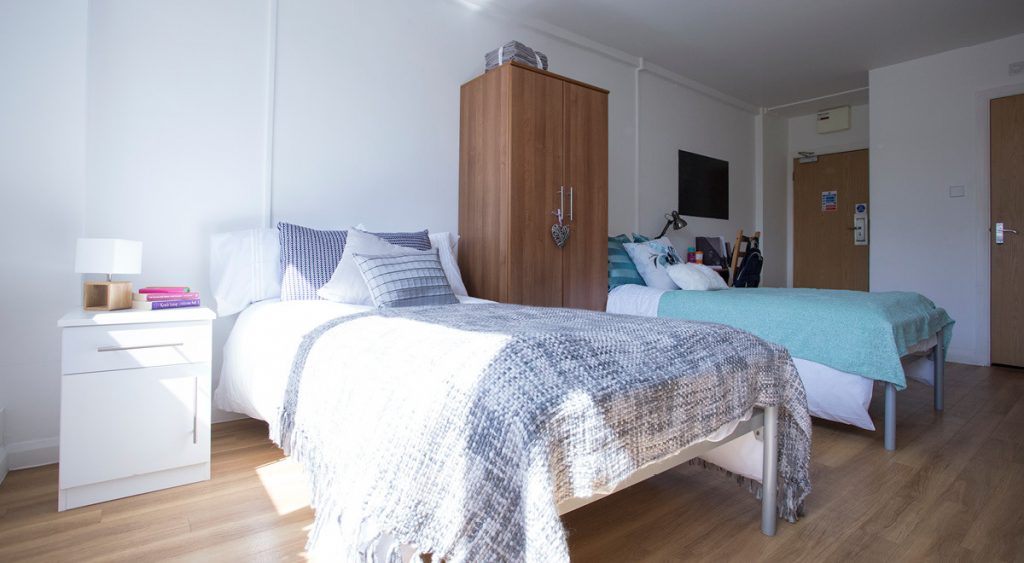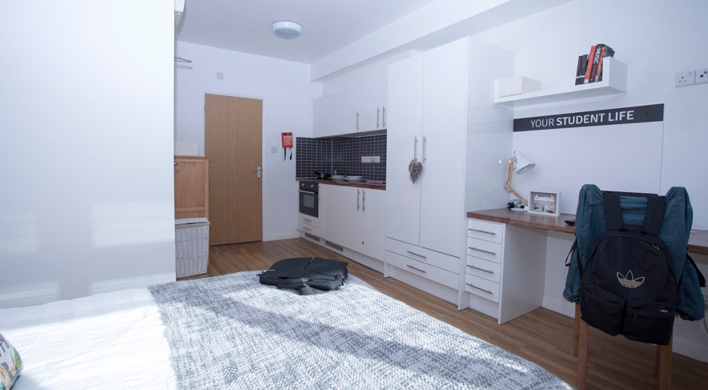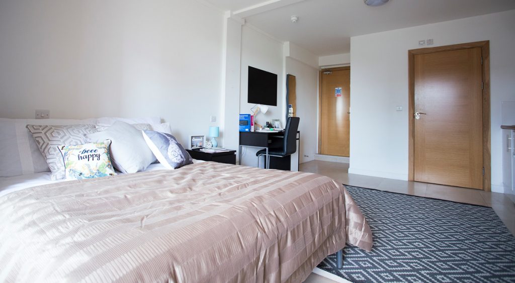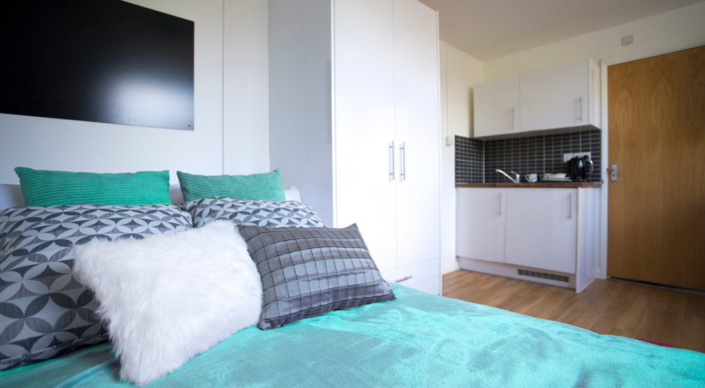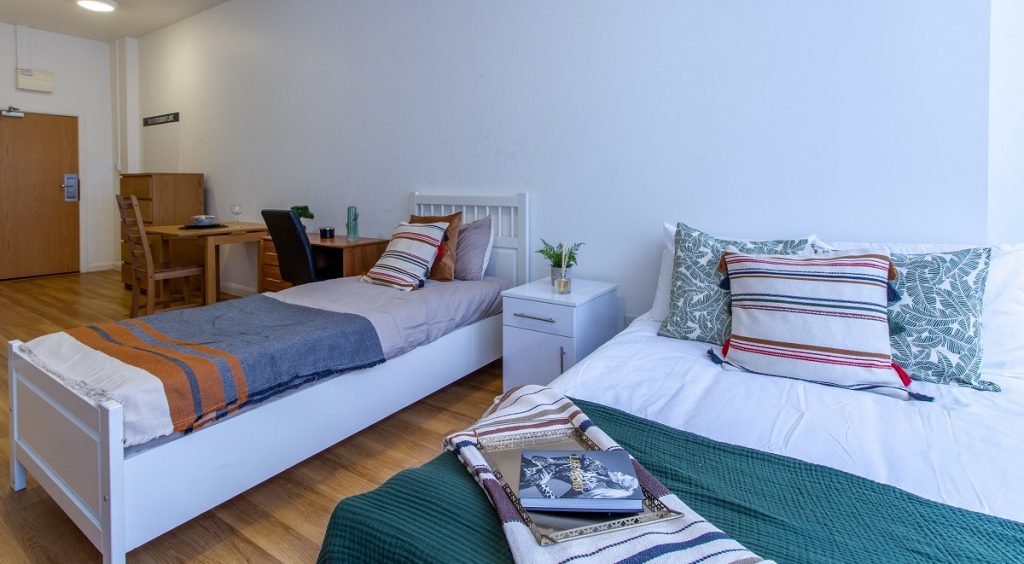 Want to live with that special pal? Our super spacious 2-bedroom studio apartment is perfect for just that! Chill out in our studio apartment rooms measuring 16m² with two comfy ¾ beds, perfect to sink into after a long day at uni. Want to impress your pal with your culinary skills? Get cooking in your very own kitchenette! When it’s time to focus, crack on in your study area and chill out with your 100Mbps WIFI afterwards. With a handy wardrobe you won’t be short of space, you even get the comfort of your own shared en suite bathroom.