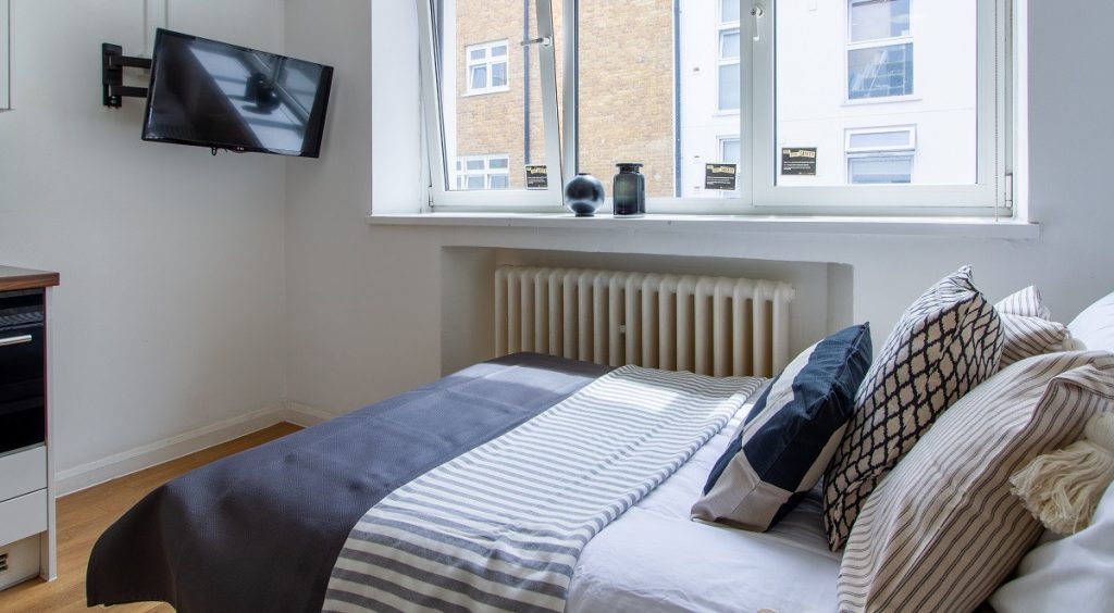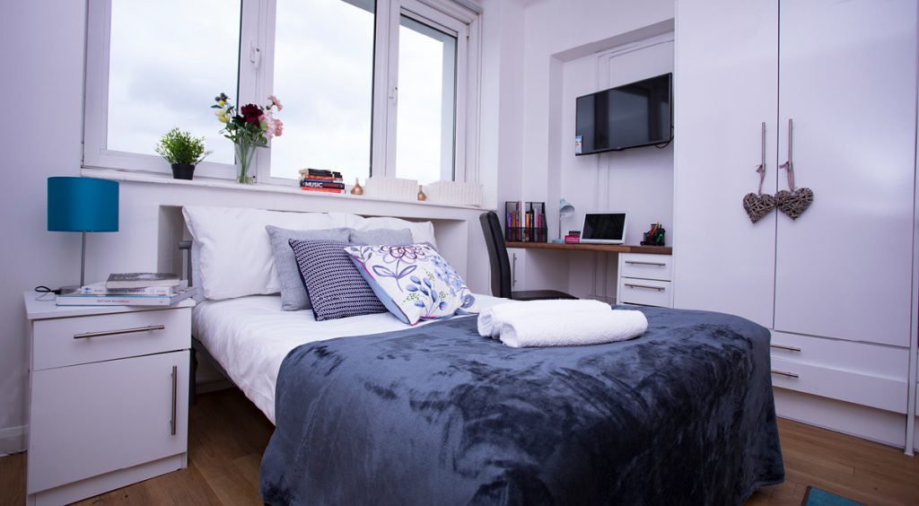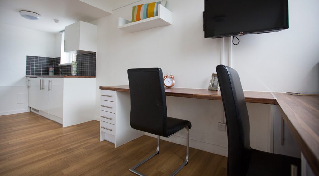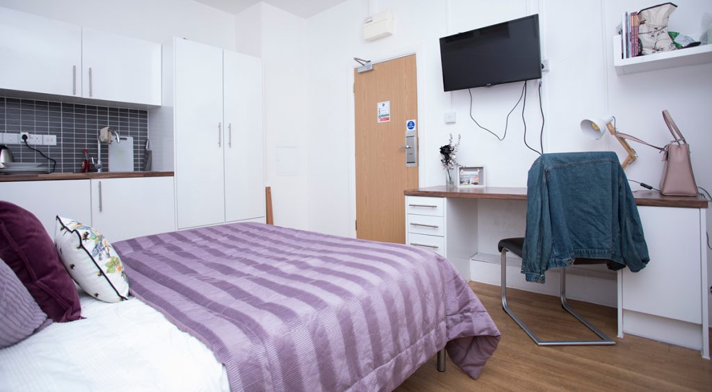 In need of a bit of extra space? Our fabulous 18m² Executive Plus studio comes with bags of it, and a comfy ¾ bed (which is great for naps!) Rustle up a yummy meal in your fully fitted kitchenette and take advantage of the 100Mbps WIFI when it’s time to chill. When you’re ready to crack on with uni work, sit at your very own study desk and work in peace. Once your studying is done, grab yourself some popcorn and enjoy a movie night on your very own telly! Our spacious studios are super light and airy with big windows giving you that fresh, cosy feeling.
