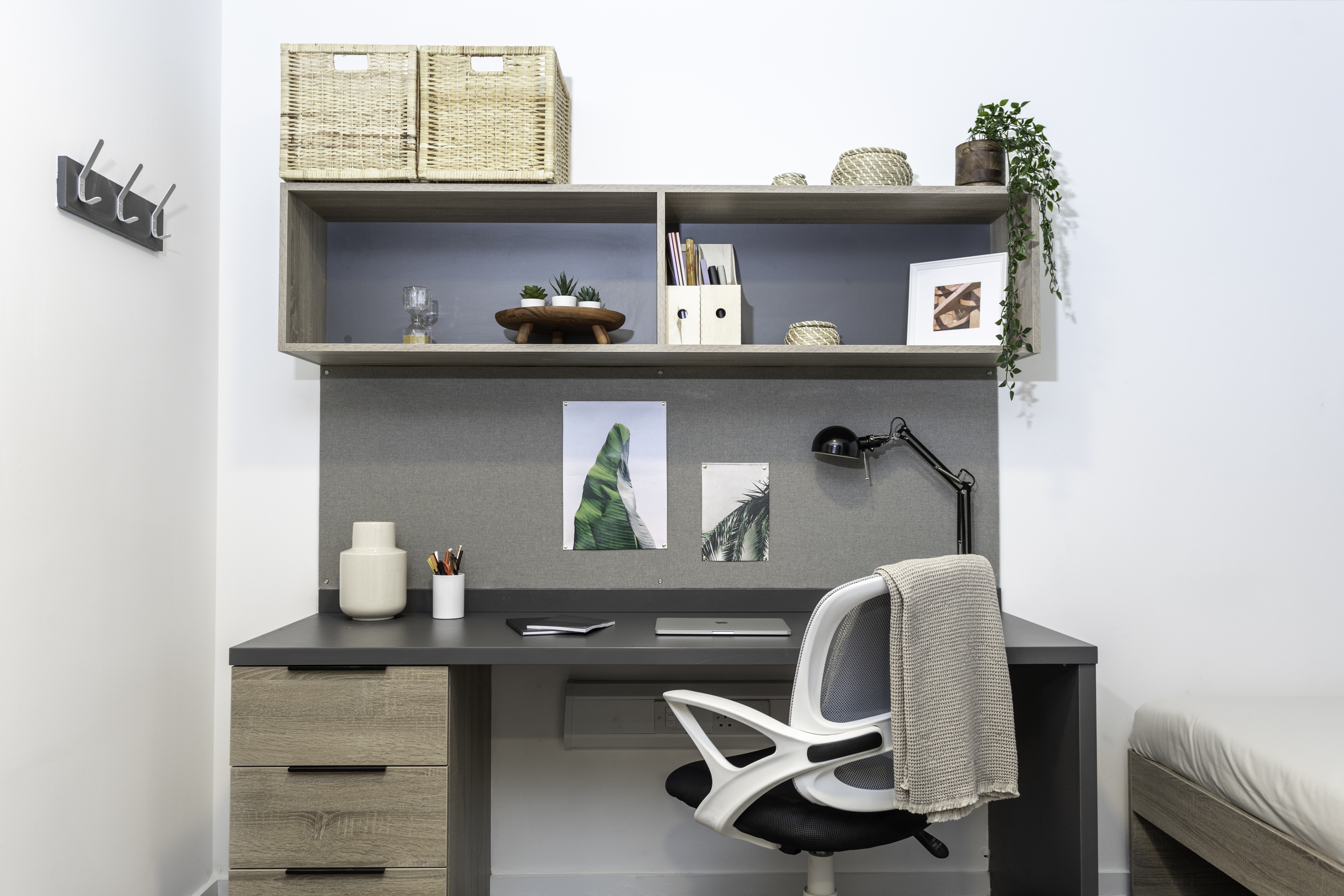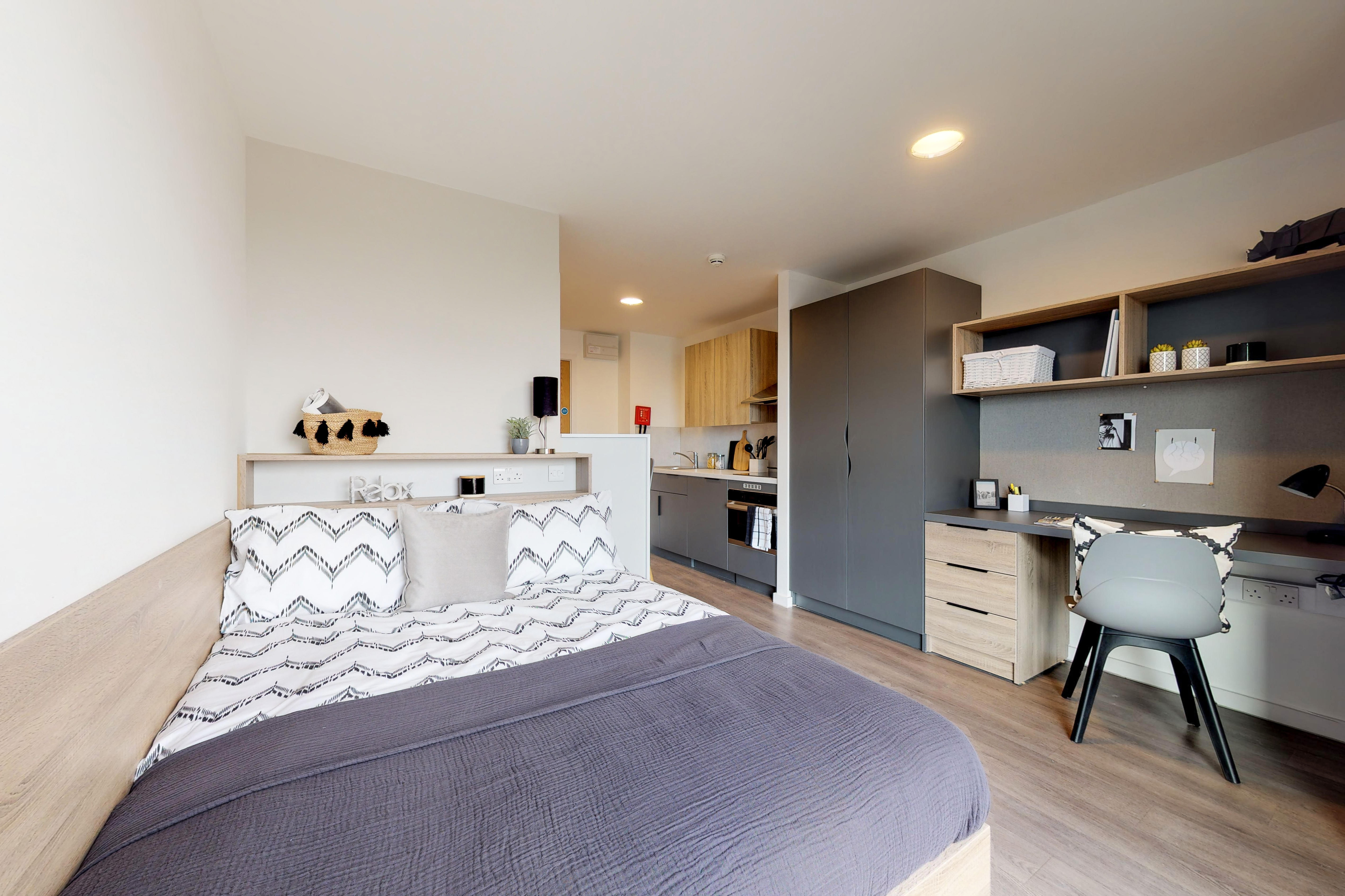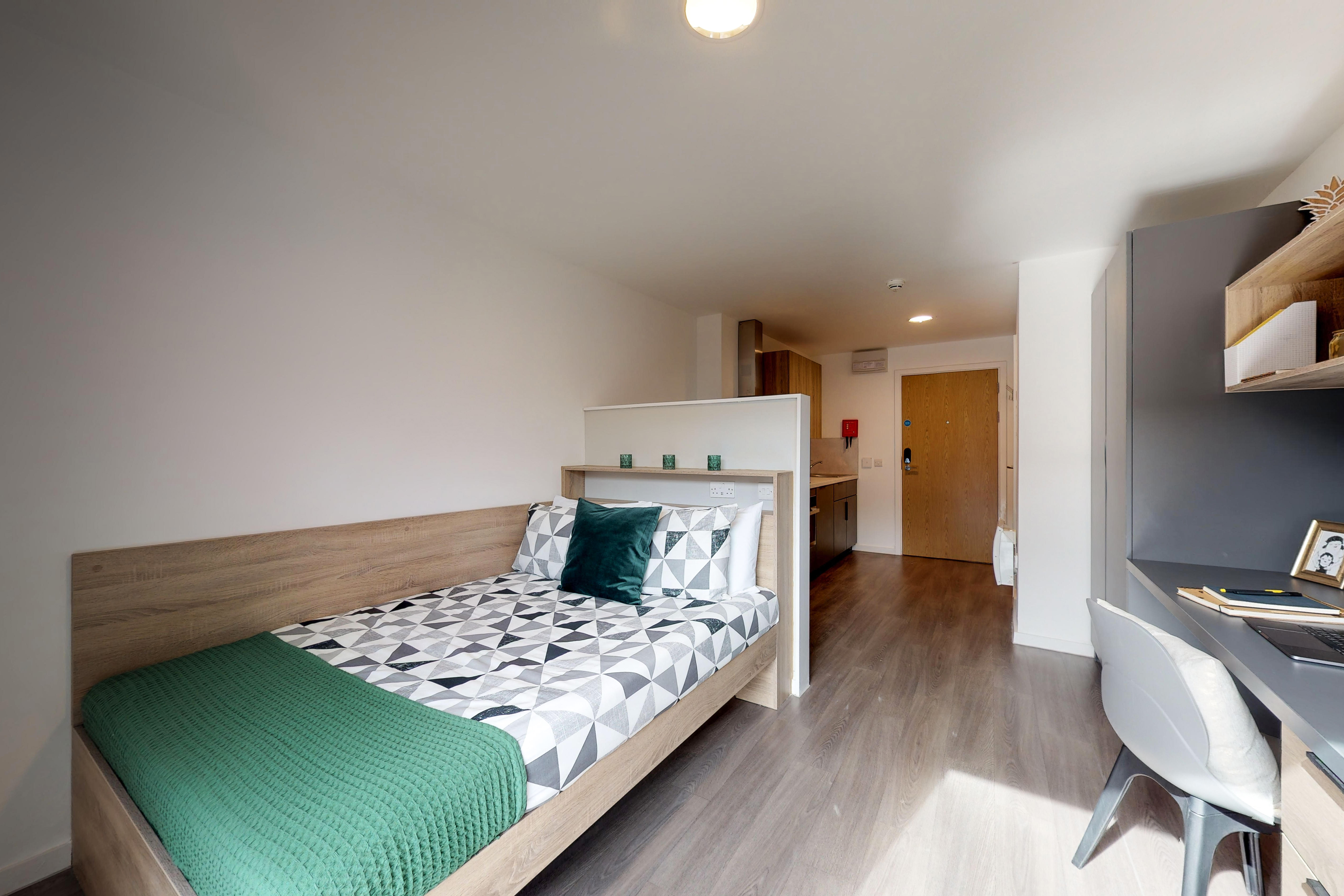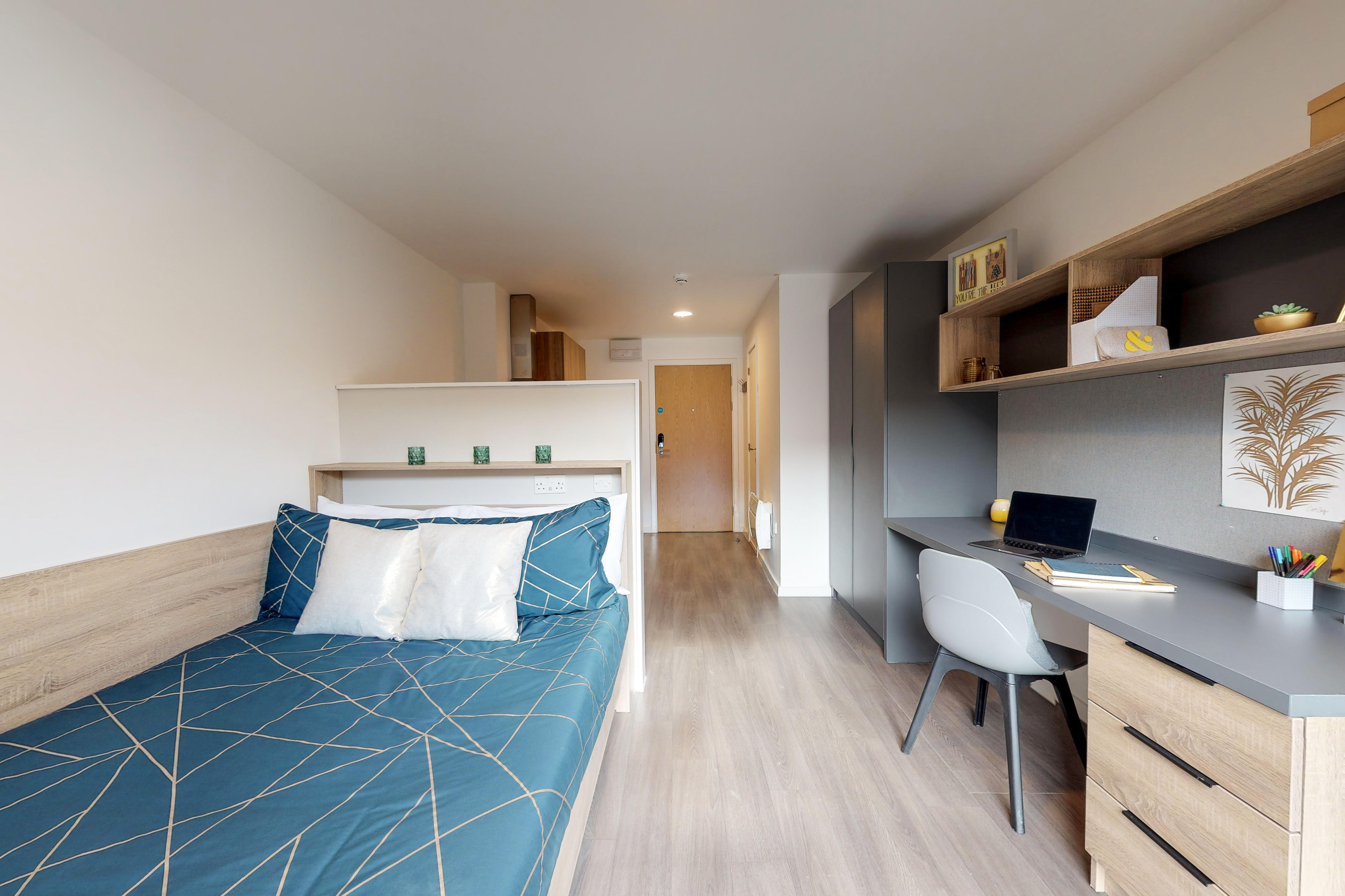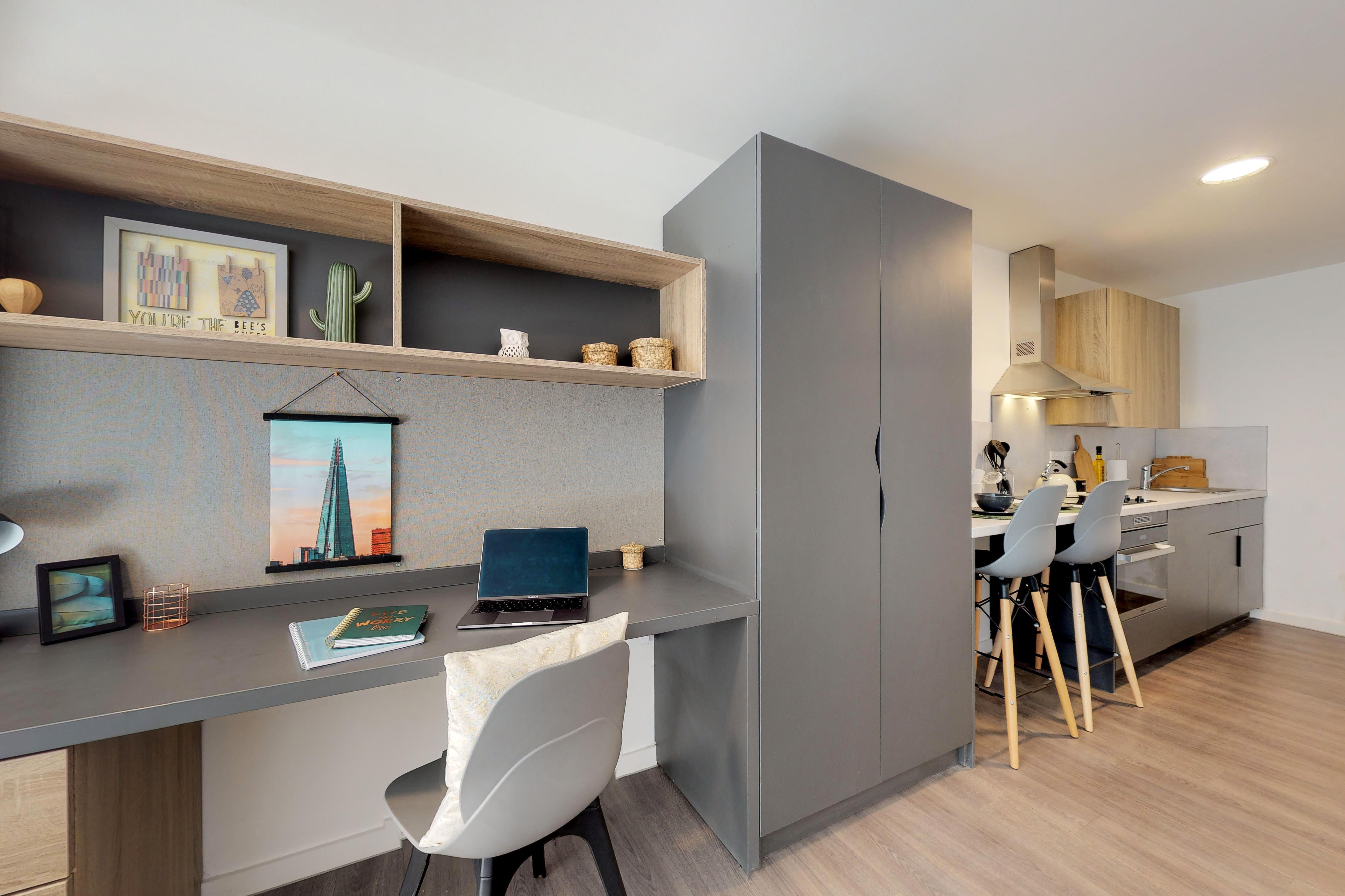 Select from a studio or ensuite-apartment at Nido Alliot House. Our studios are ideal for having your own space. Each studio comes with your own private ensuite bathroom, double bed, wardrobe storage, desk, chair plus breakfast bar and kitchenette.