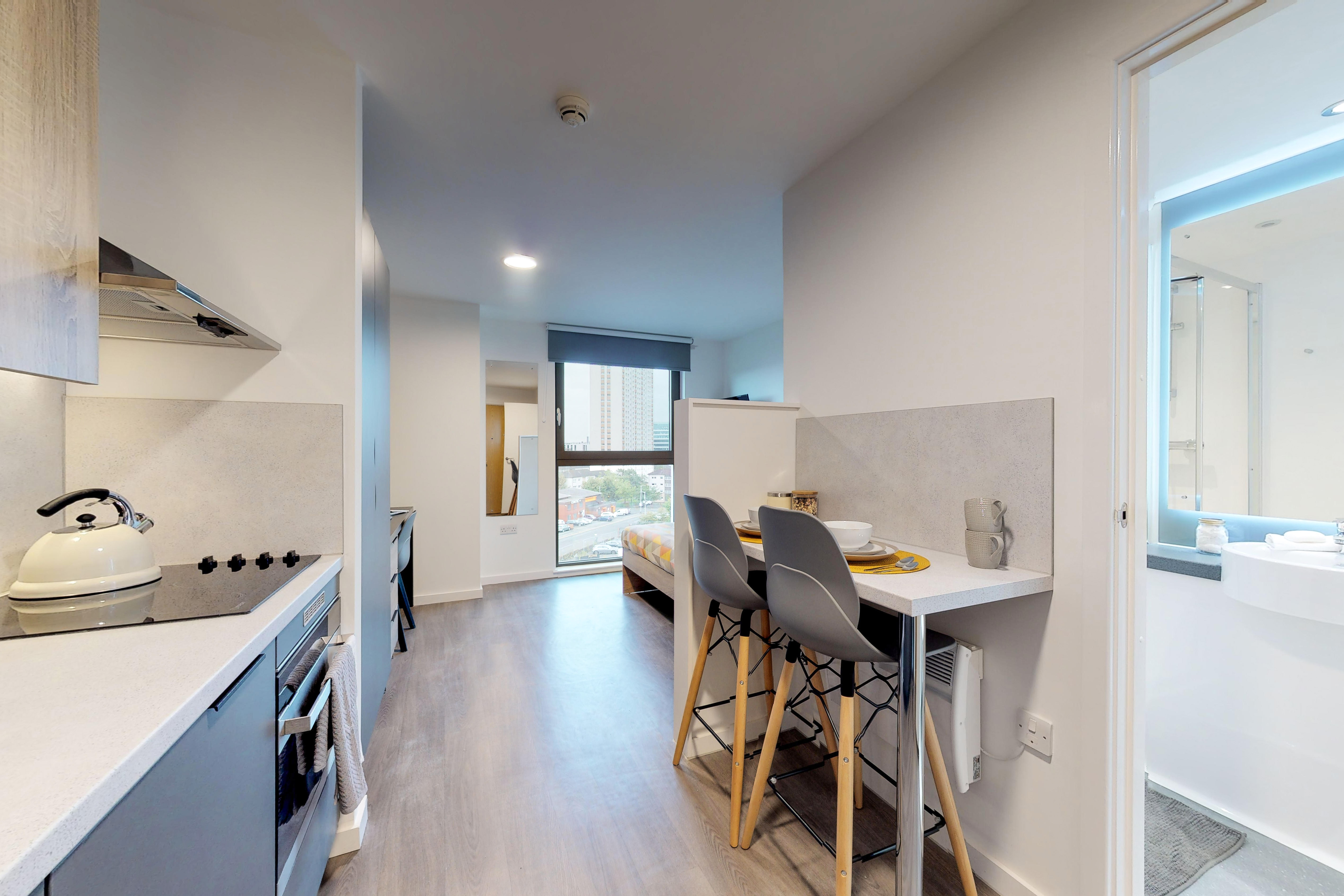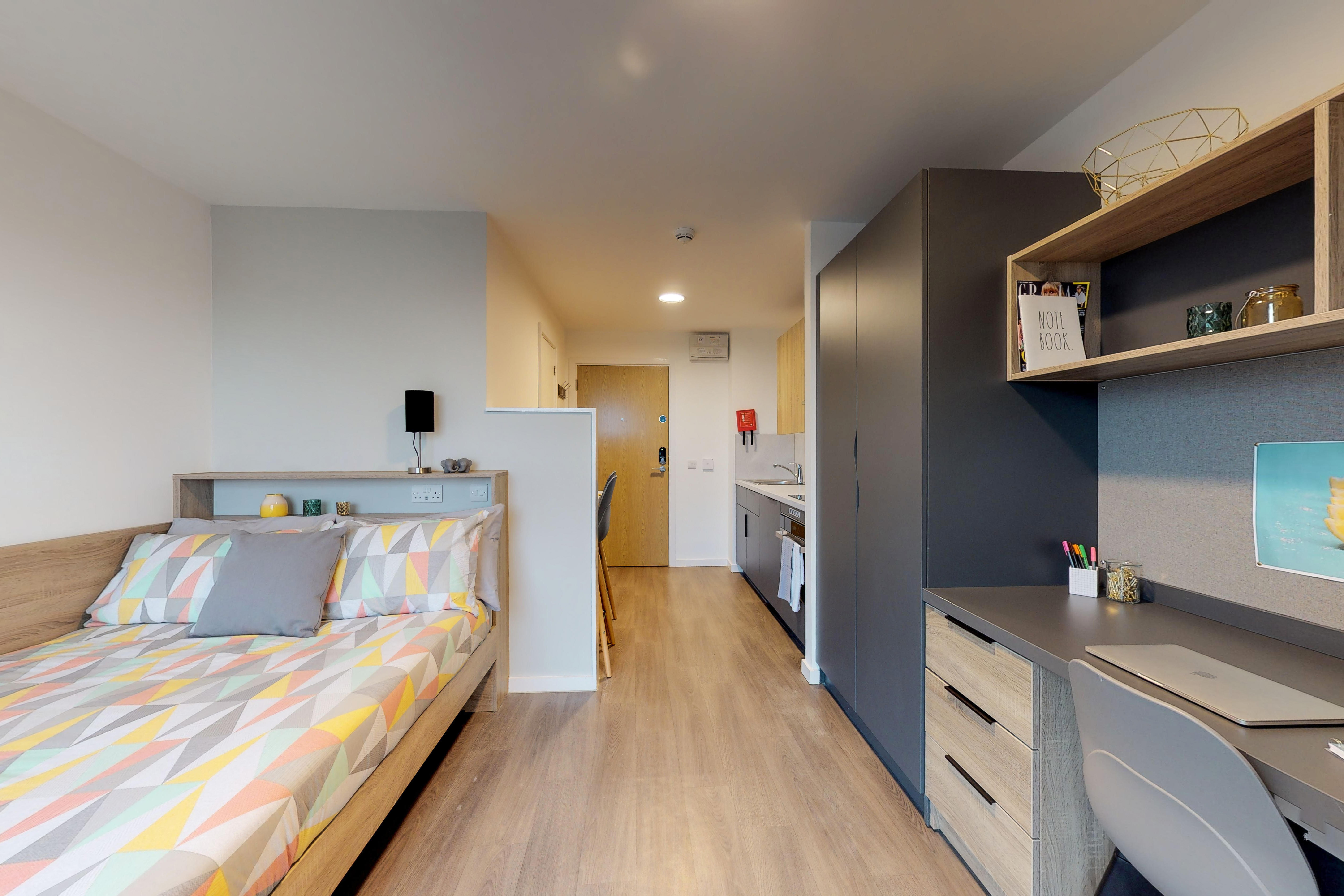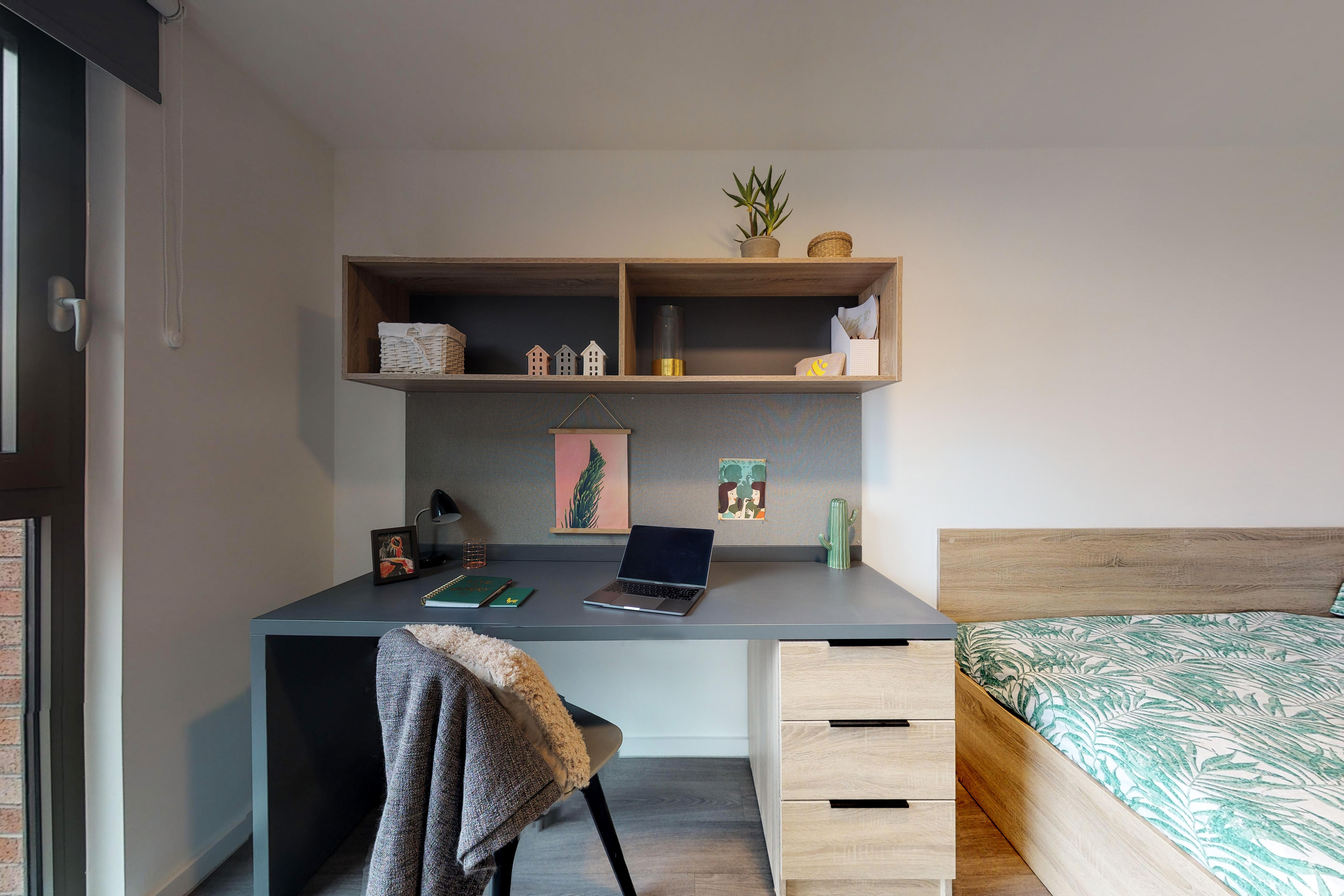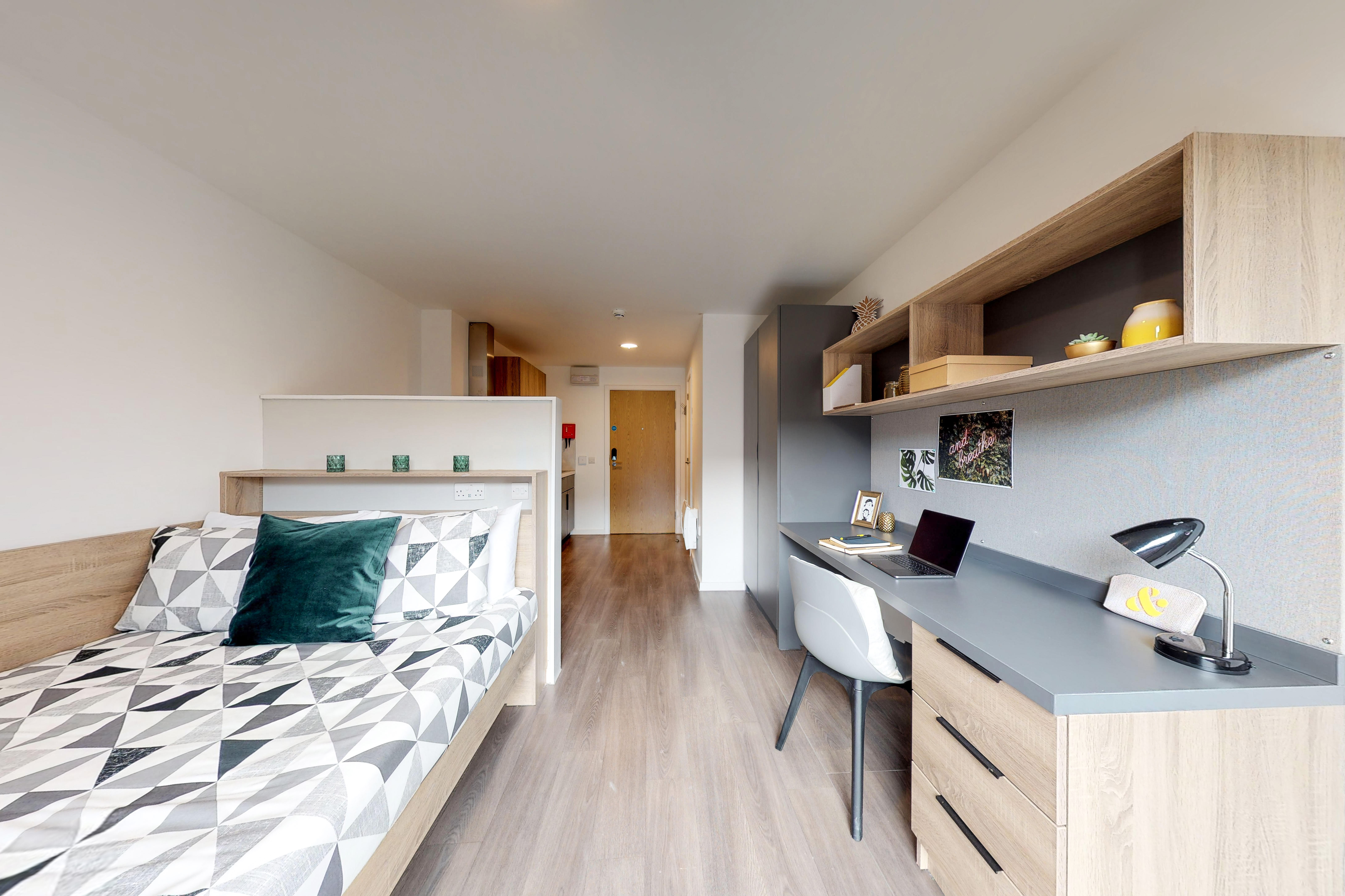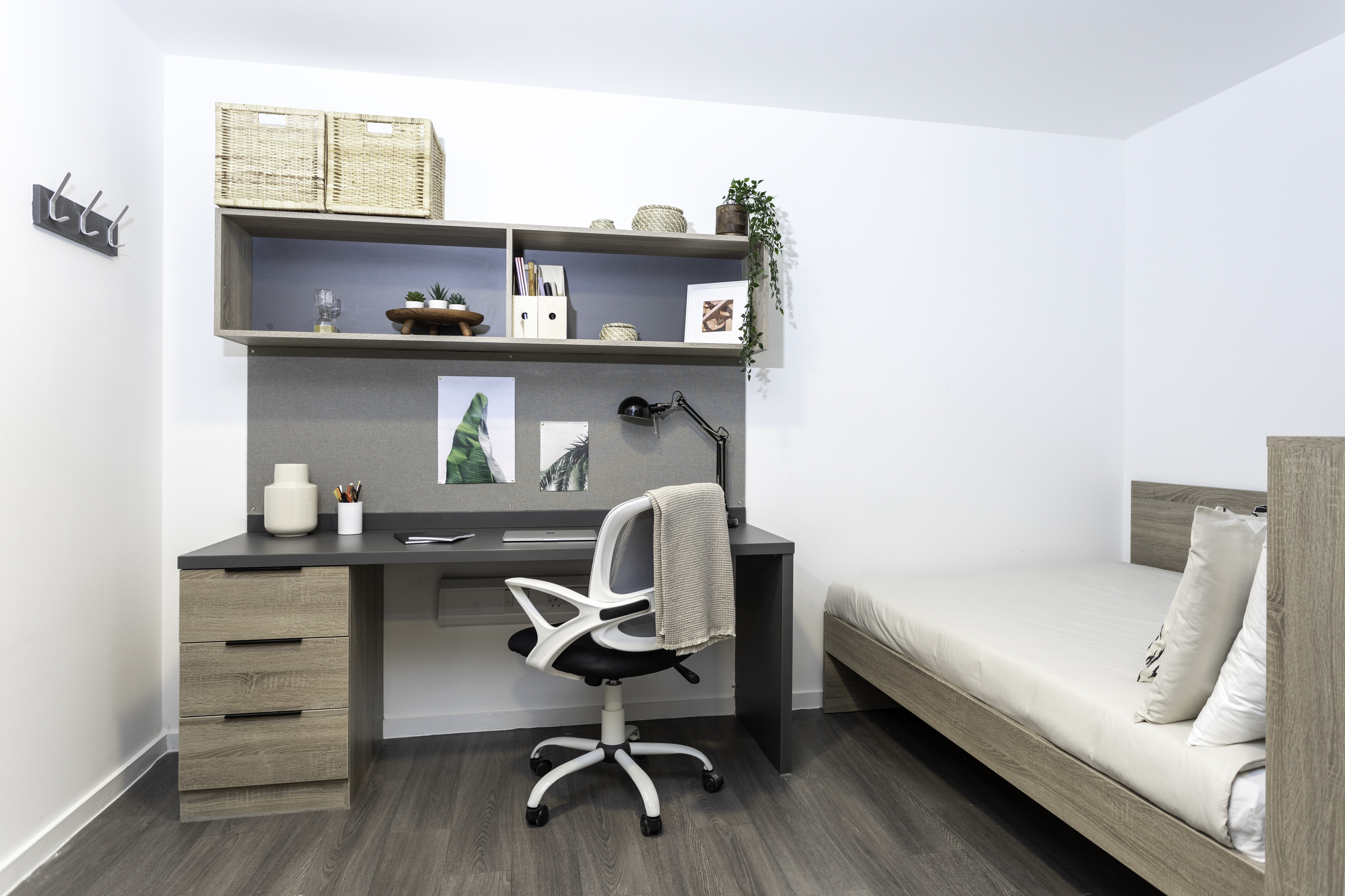 Select from a studio or ensuite-apartment at Nido Alliot House. Our studios are ideal for having your own space. Each studio comes with your own private ensuite bathroom, double bed, wardrobe storage, desk, chair plus breakfast bar and kitchenette.