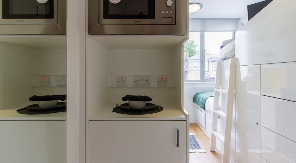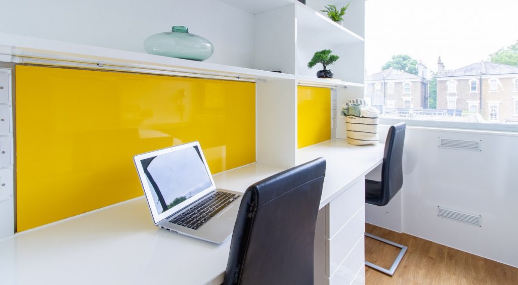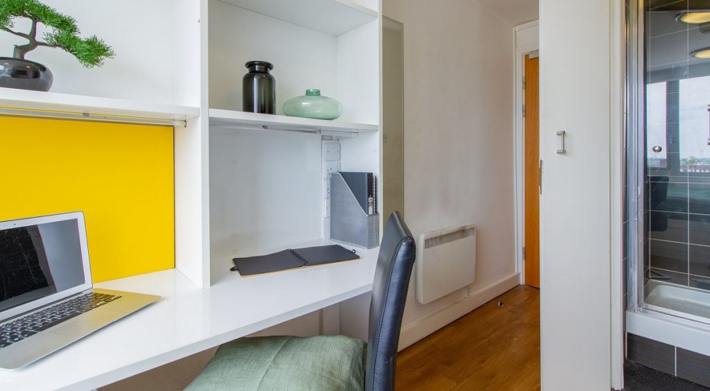 Fancy sharing your room with a pal? Our Chelsea Twin en suite bedroom measures around 12.5 m², with two comfy single beds and two wardrobes for all your bits and bobs. With two fitted study desks and chairs, you can crack on with your studying in peace! When it’s time to wind down, chill out and watch some TV or surf the web with your 100Mbps WIFI.