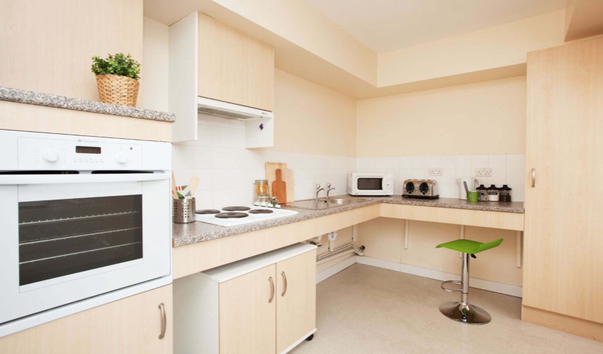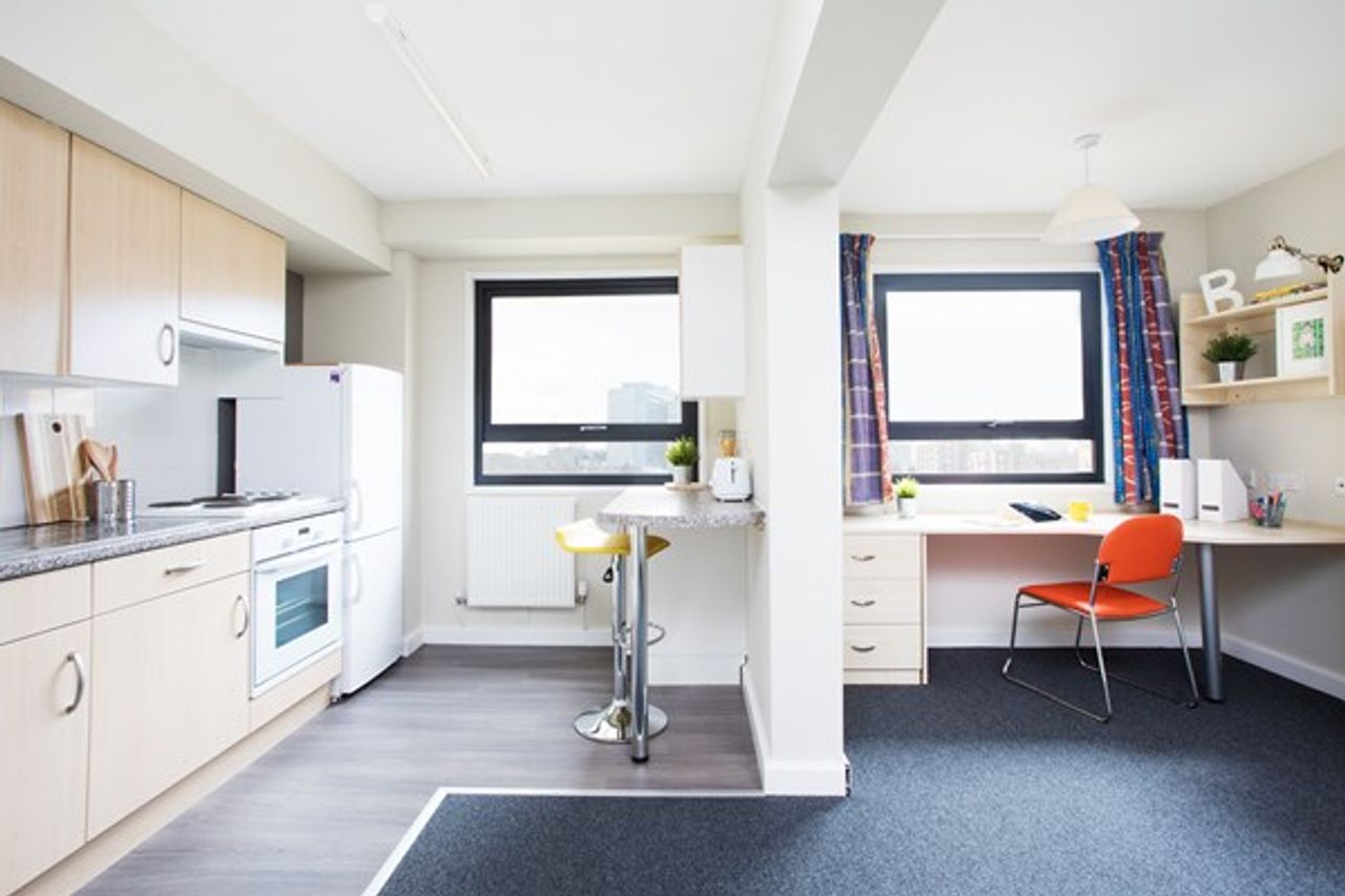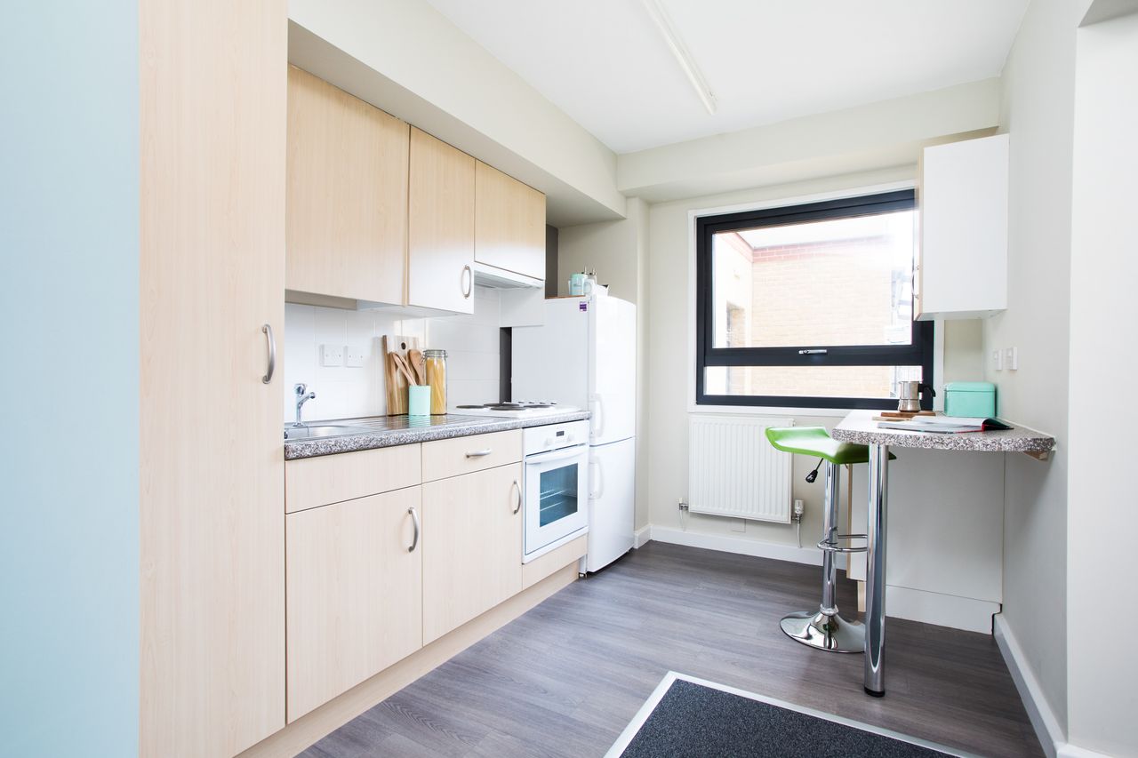 Our studio rooms are perfect for students looking for more privacy. You will have your own en-suite bathroom and fully fitted kitchen, as well as a comfortable bed, a wardrobe, plenty of additional storage for your belongings, and a Wi-Fi connected study space.