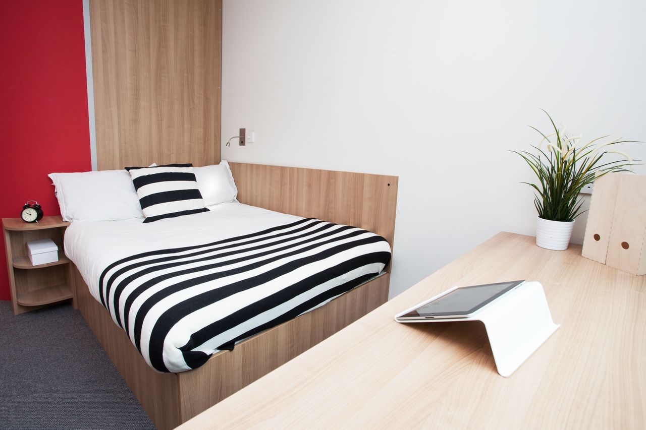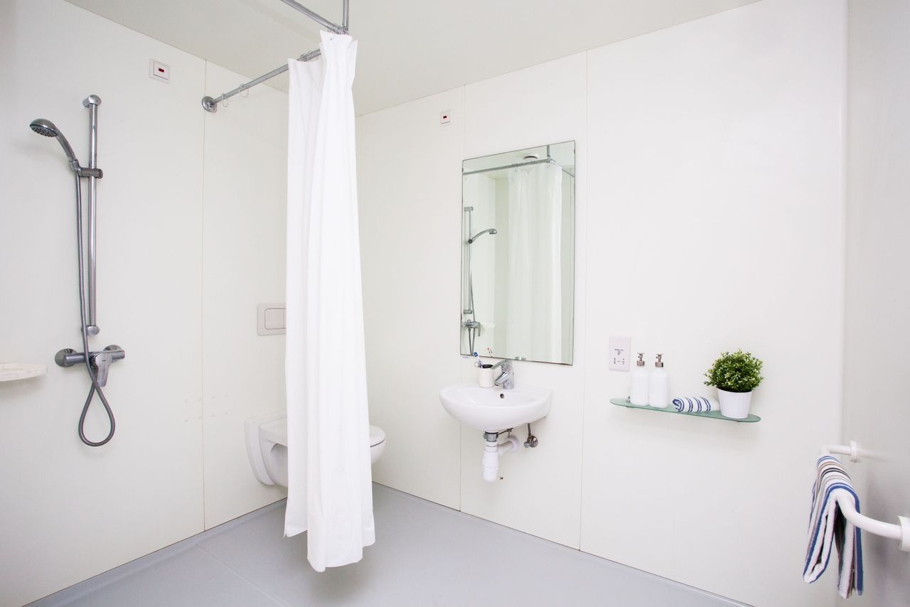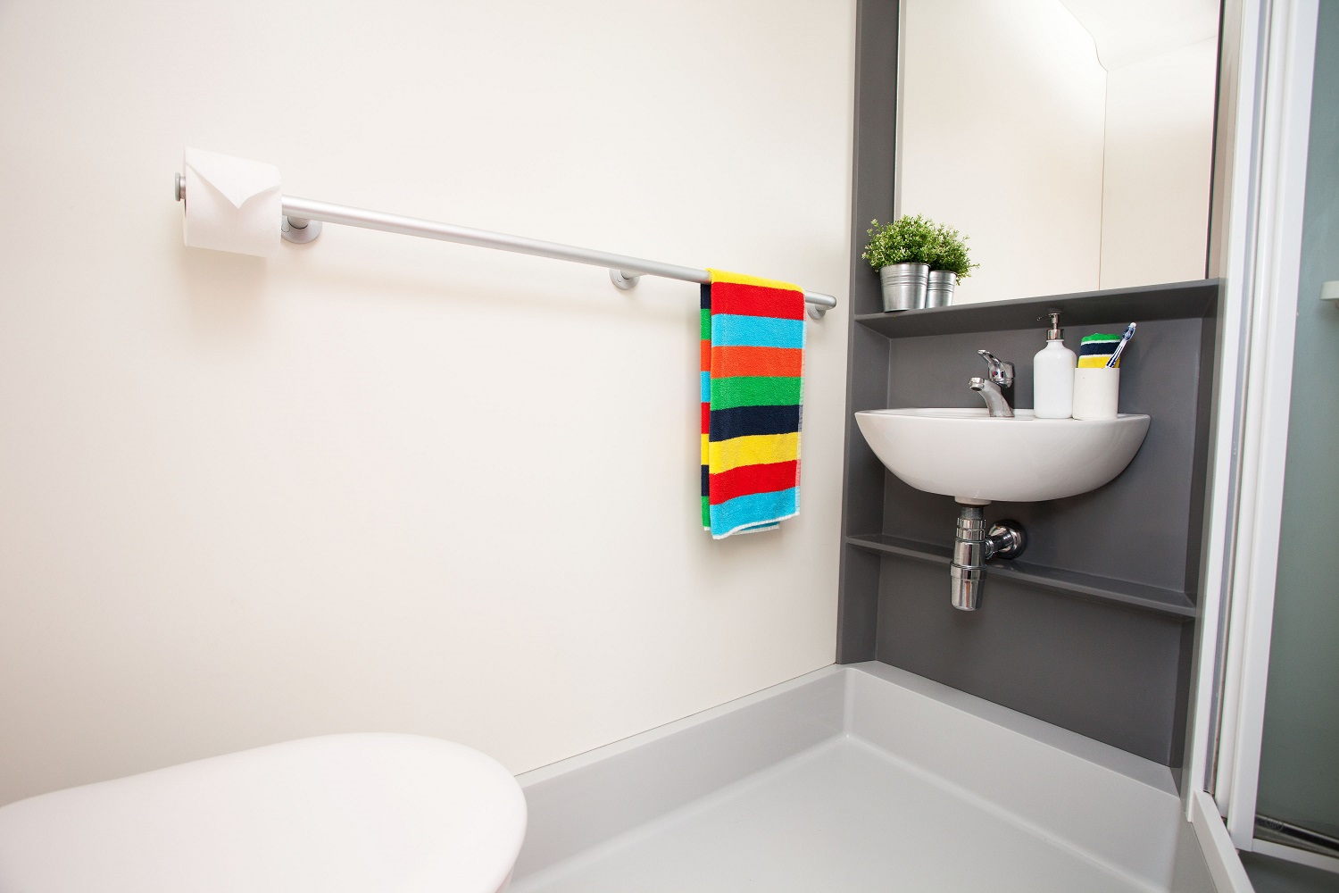 Our accessible rooms are designed for wheelchair users and students with limited mobility. You will have your own private bathroom, a comfortable bed, a wardrobe, plenty of additional storage for your belongings, and a Wi-Fi connected study space.