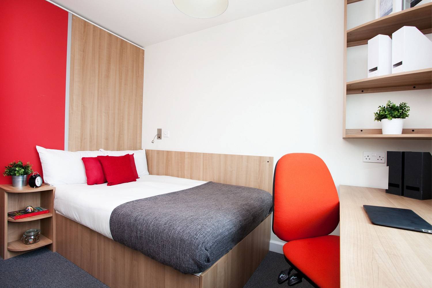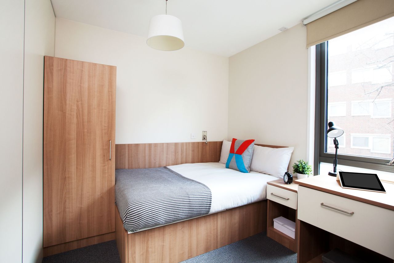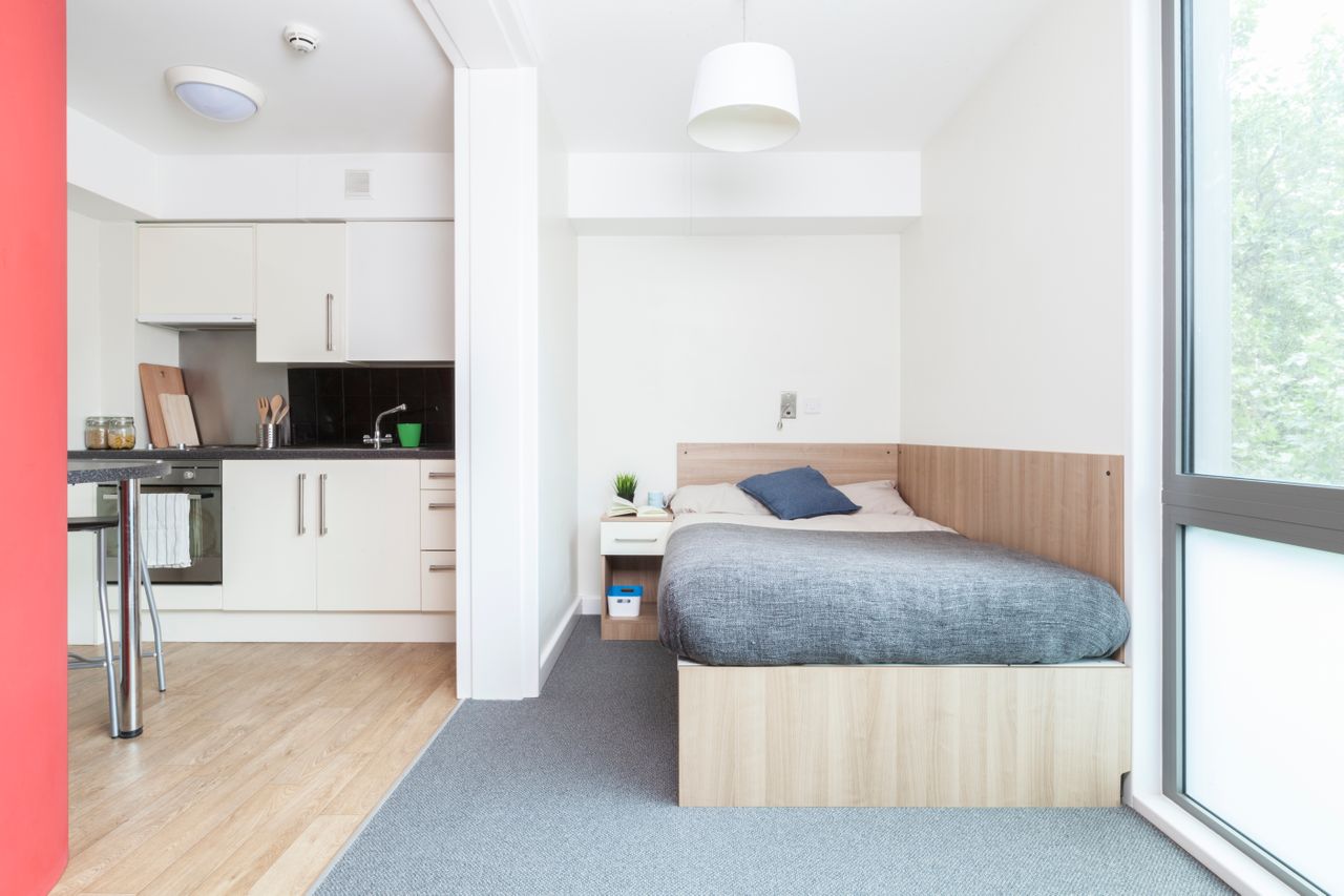 Our studio rooms are perfect for students looking for more privacy. You will have your own en-suite bathroom and fully fitted kitchen, as well as a comfortable bed, a wardrobe, plenty of additional storage for your belongings, and a Wi-Fi connected study space