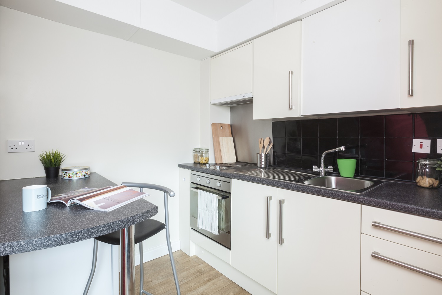 Feel at home in your en-suite room, which has a private shower room with sink and toilet, a comfortable bed and a large Wi-Fi connected study area. As well as a wardrobe, you'll find storage space under your bed and shelves and drawers to store your belongings. Your shared fitted kitchen and living area is an ideal space to relax with your flatmates.