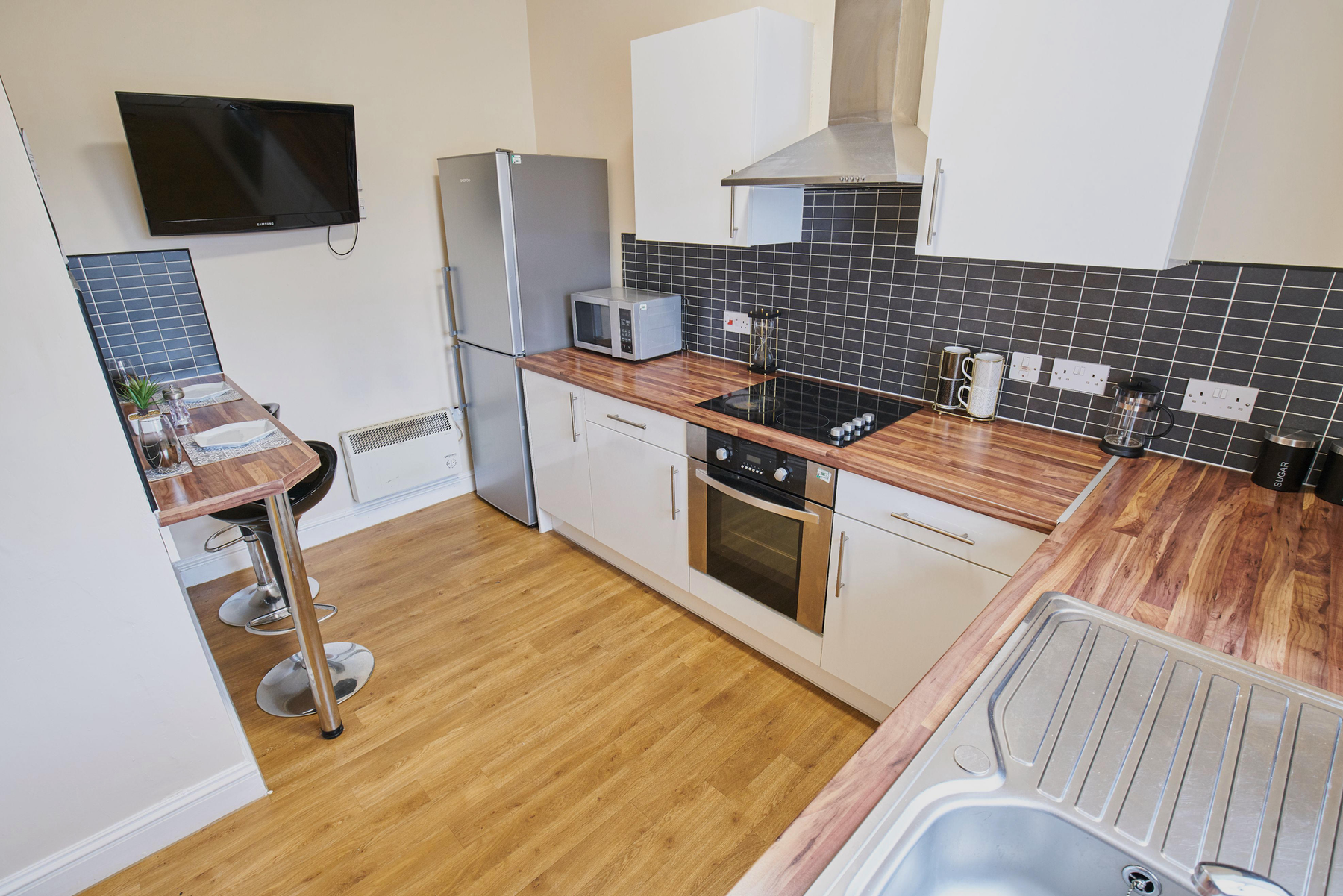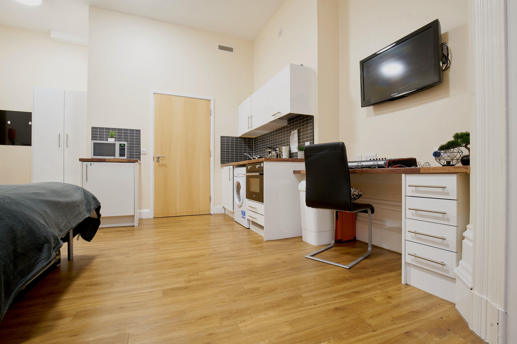 Self-contained private apartment measuring 23m² with a ¾ double bed, wardrobe, study area, en-suite shower facilities, personal kitchen with integrated modern appliances, a TV and up to 100Mbps WIFI throughout.
