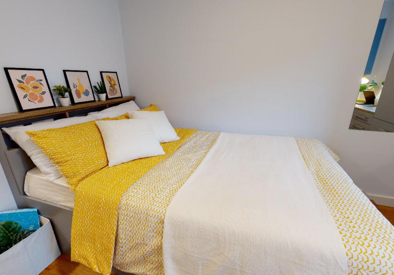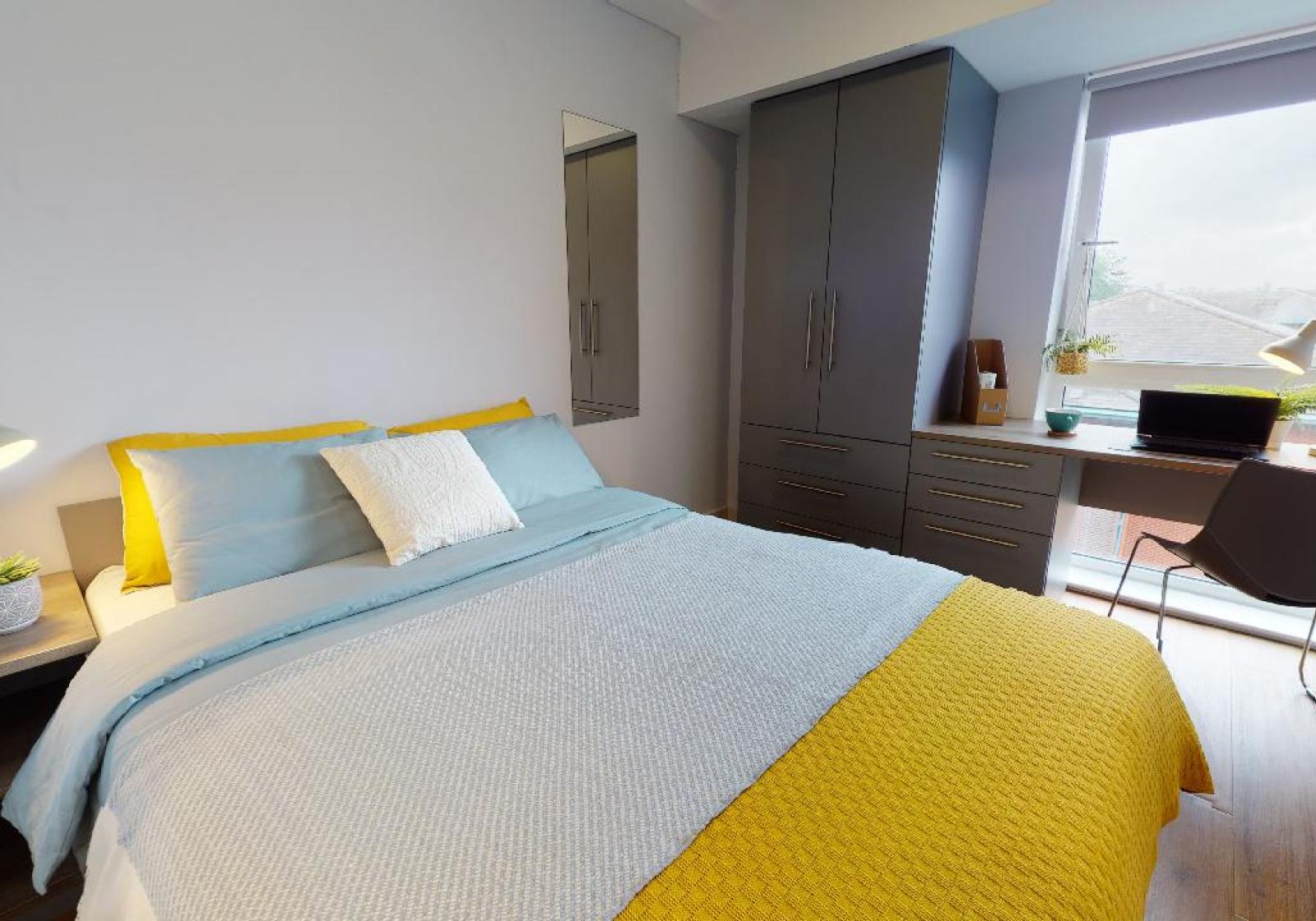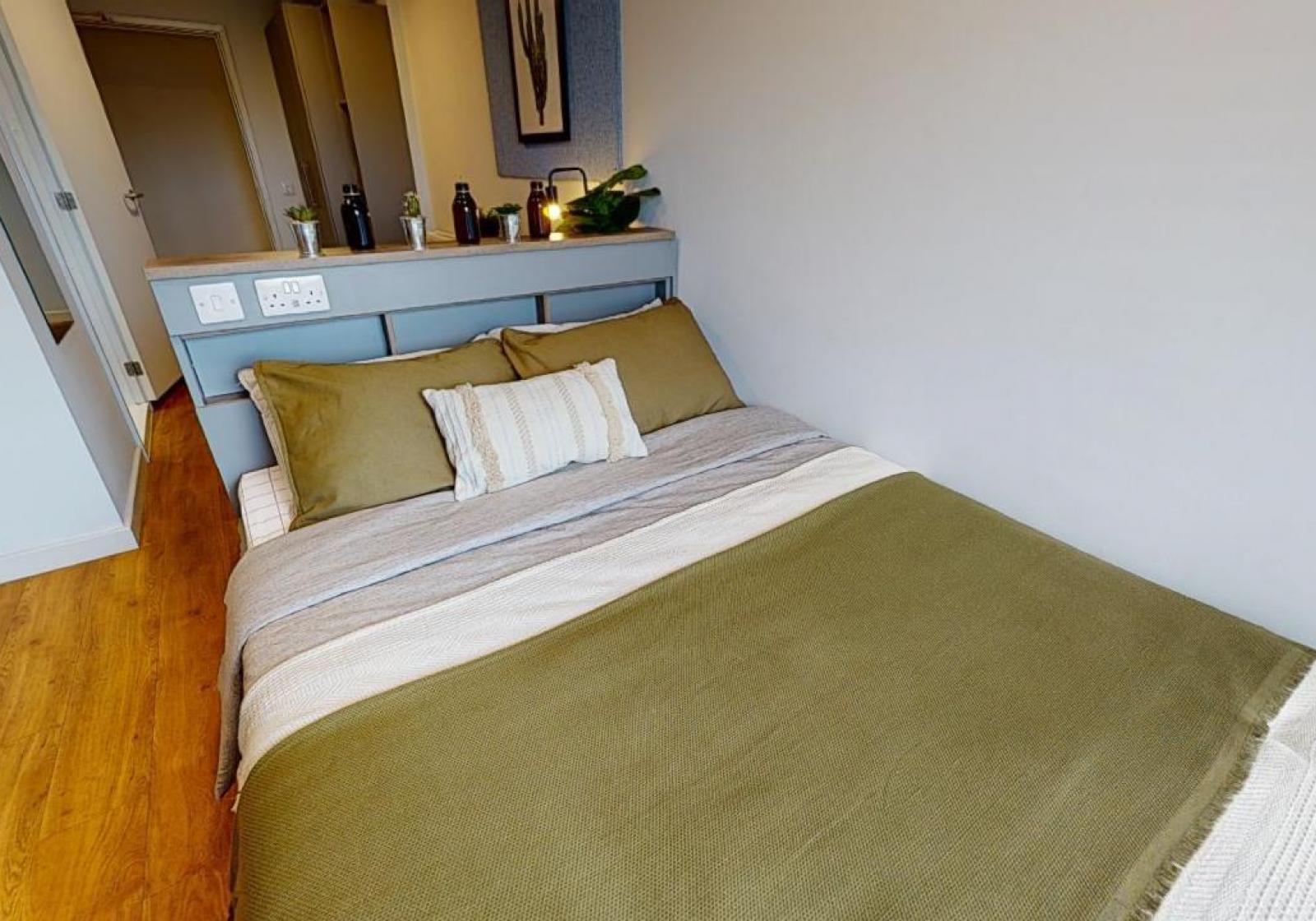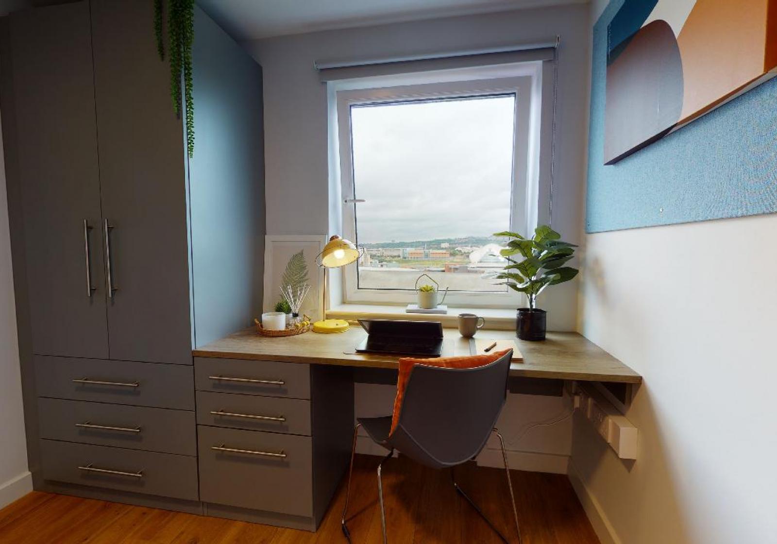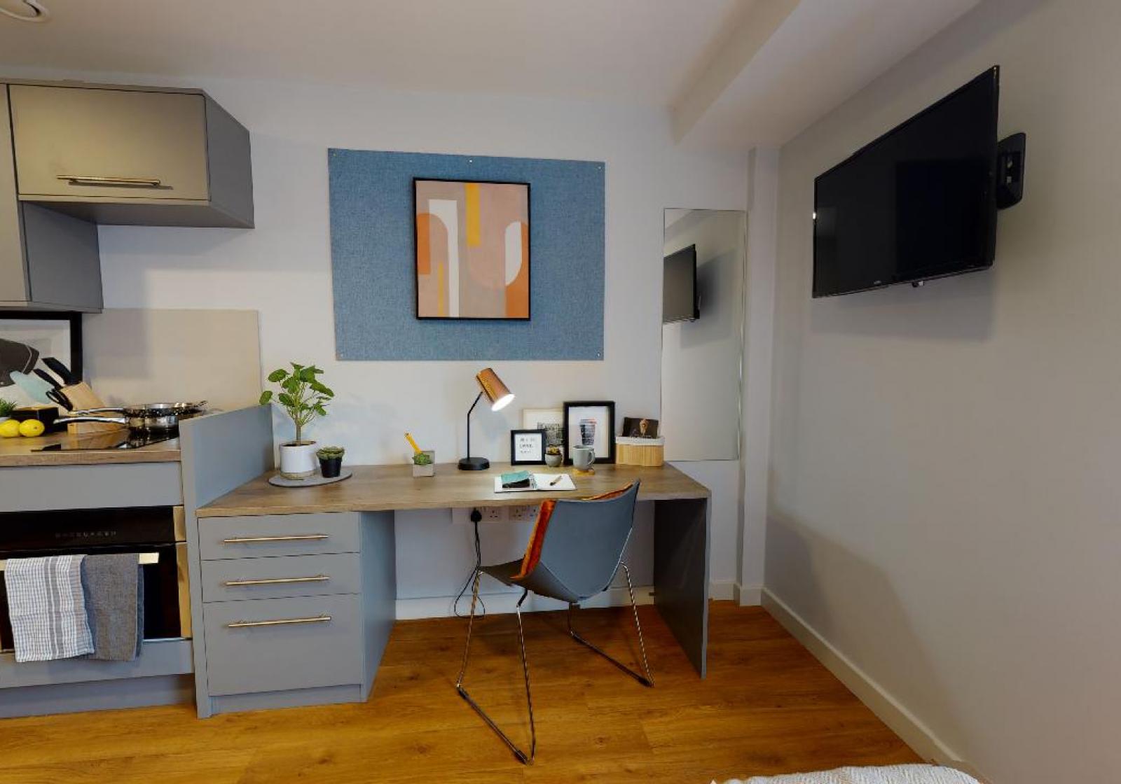These huge top floor studios come with full-size double bed, private bathroom, 32” Smart TV, lots of storage, fully kitted kitchen, stylish furniture and study area. With a cinema, gym, games room and additional shared roof terrace, this building has superb perks too.