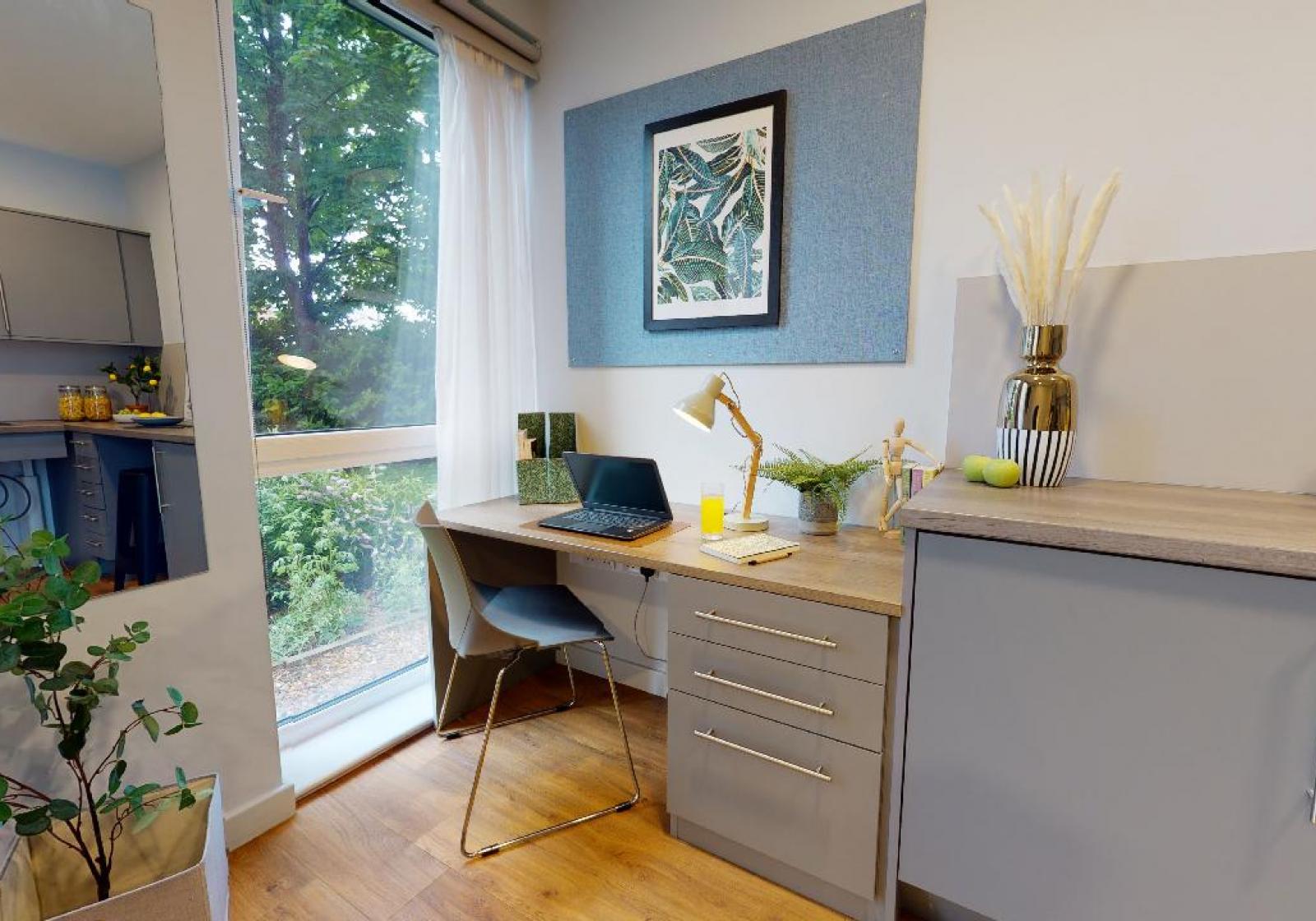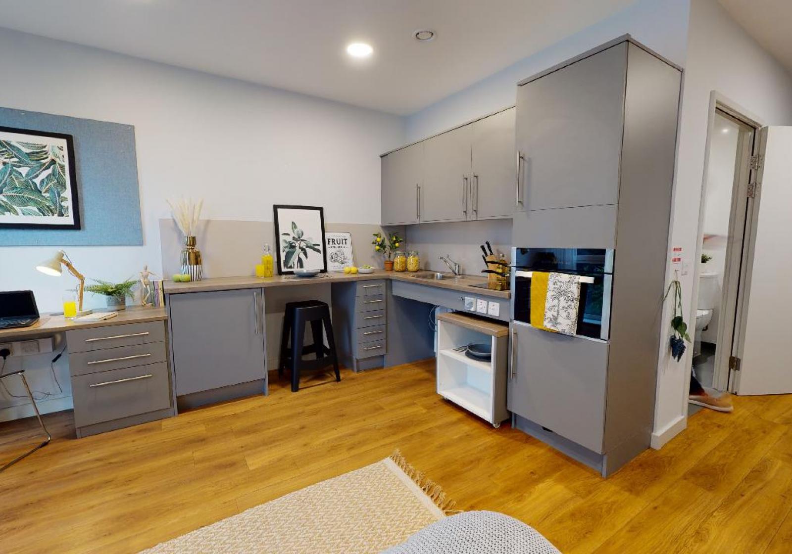 These massive ground floor studios come with full-size double bed, private bathroom, 32” Smart TV, lots of storage, fully kitted kitchen, stylish furniture and study area. With a cinema, gym, games room and additional shared roof terrace, this building has superb perks too.