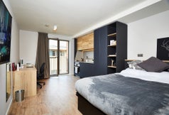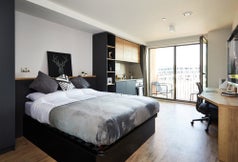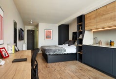 The classic Vita Student studio with double bed, ensuite bathroom, desk area and kitchen.