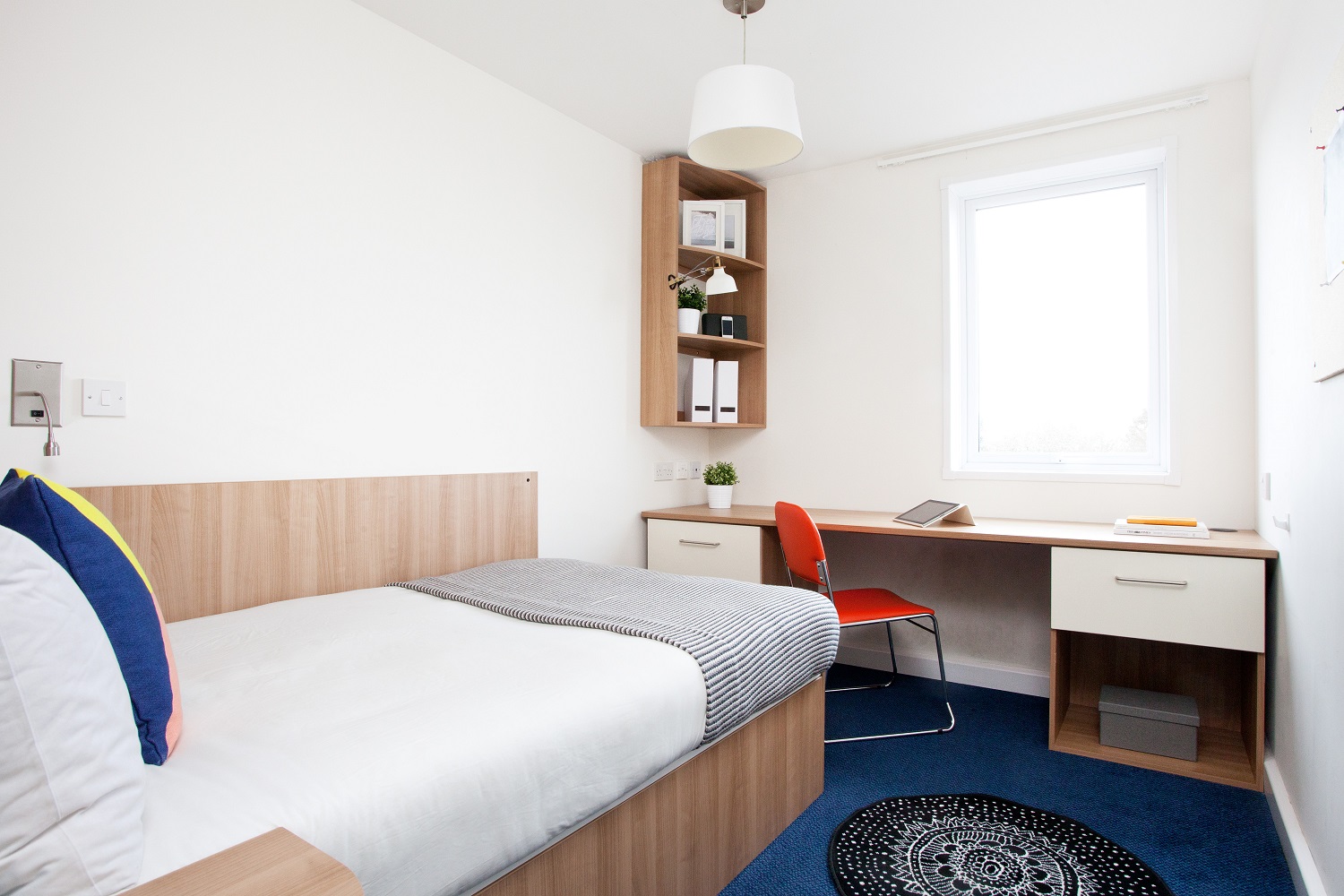 Feel at home in your en-suite room, which has a private shower room with sink and toilet, a comfortable bed and a large Wi-Fi connected study area. As well as a wardrobe, you'll find storage space under your bed and shelves and drawers to store your belongings. Your shared fitted kitchen and living area is an ideal space to relax with your flatmates.