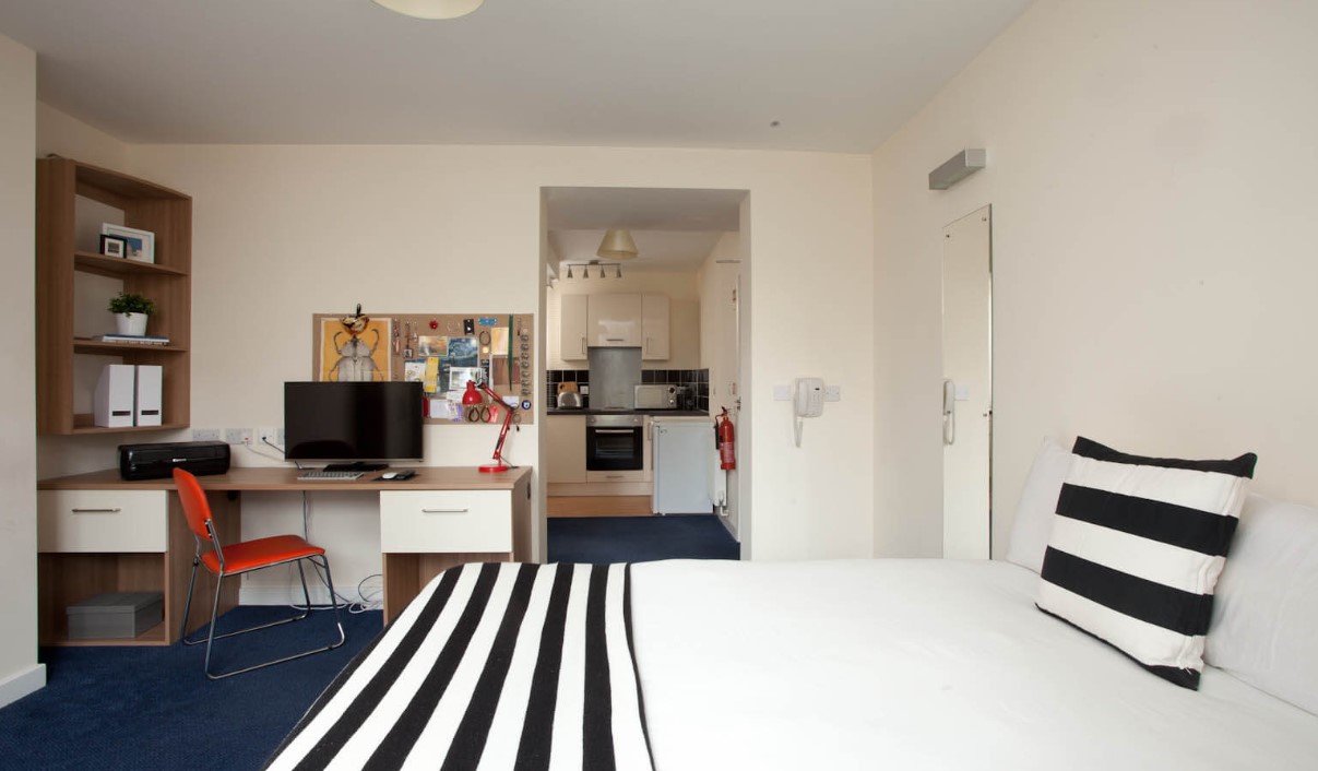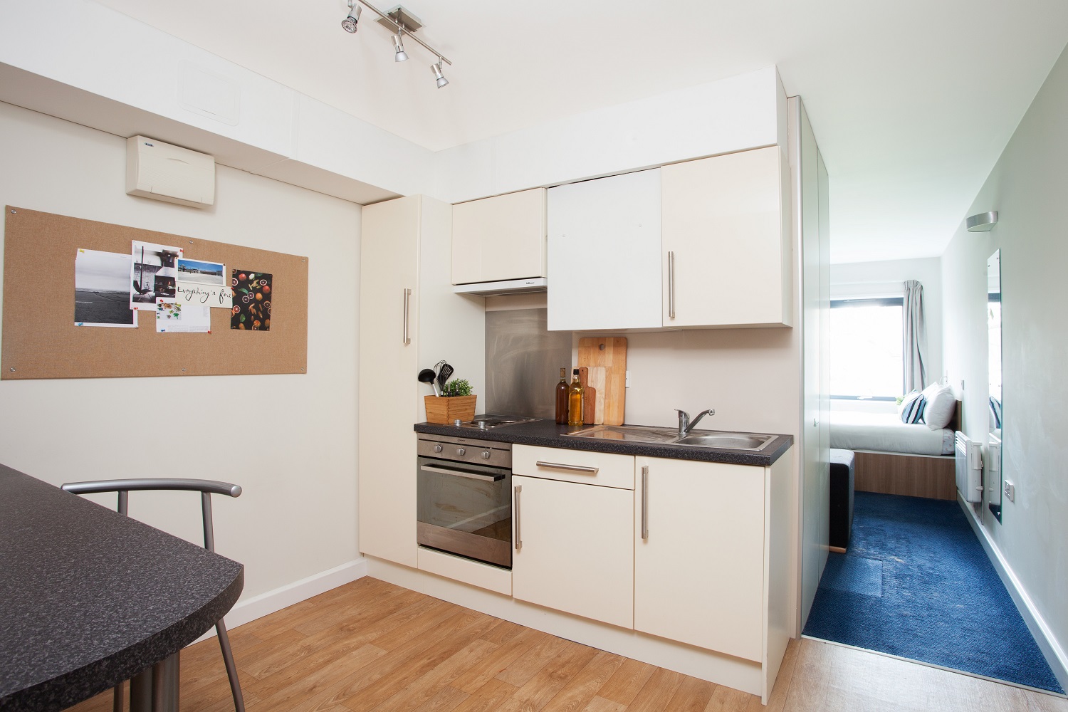 Our studio rooms are perfect for students looking for more privacy. You will have your own en-suite bathroom and fully fitted kitchen, as well as a comfortable bed, a wardrobe, plenty of additional storage for your belongings, and a Wi-Fi connected study space.