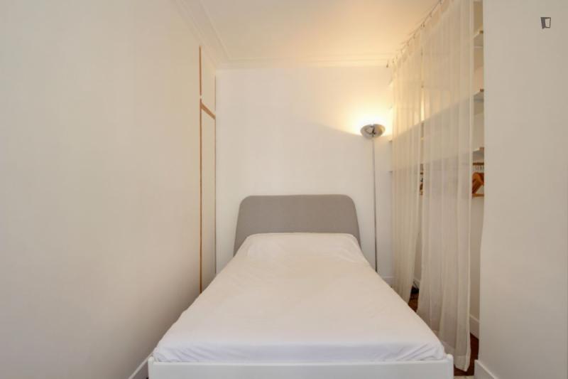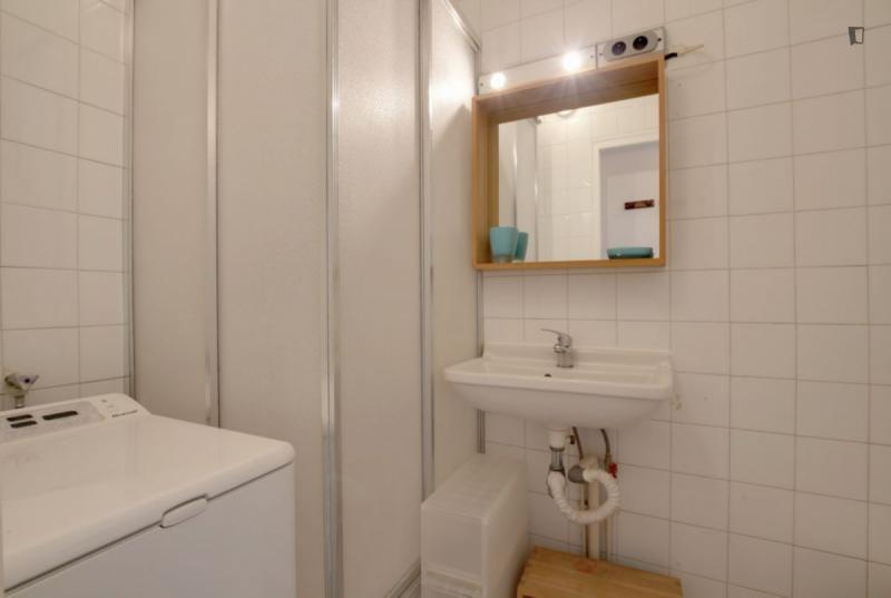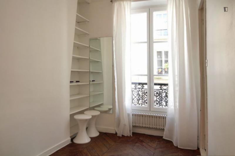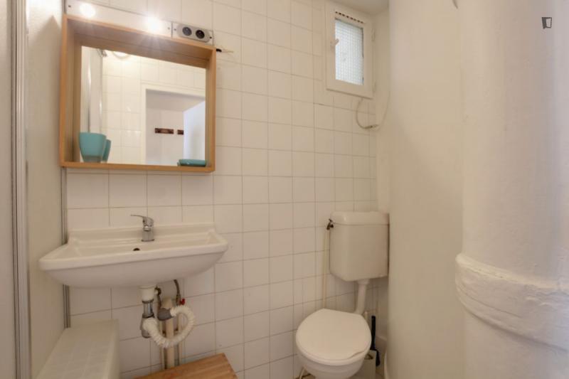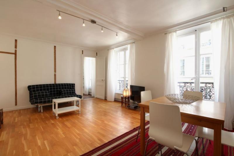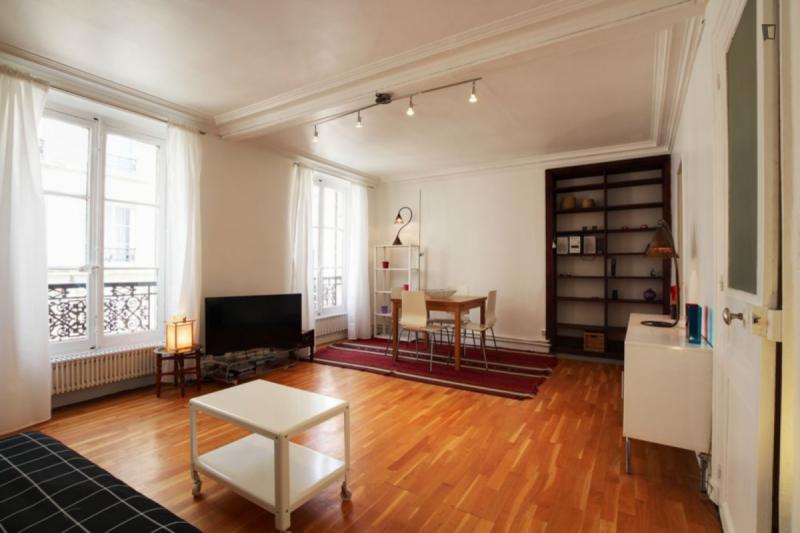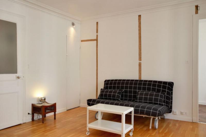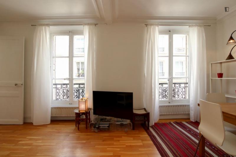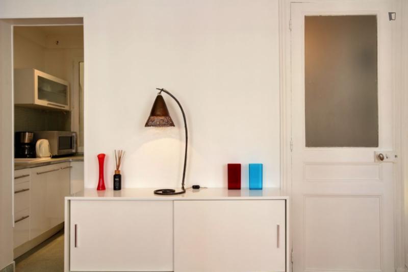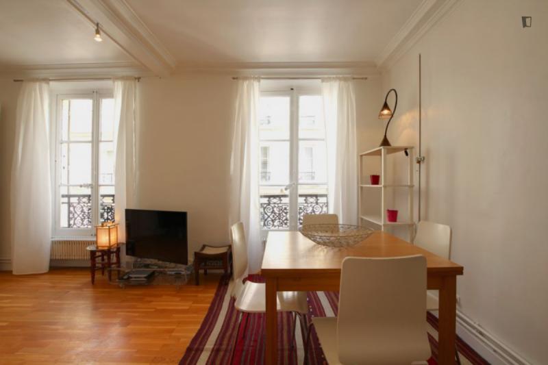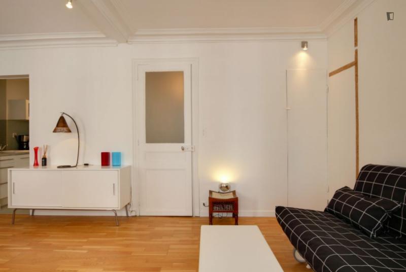 This 45 sqm approx 500 sqft one bedroom apartement is located in the 11th arrondissement near Place de la République on the 3rd French floor without elevator. It offers a living/dining room with a sofa bed, a seperated kitchen, a bathroom, a bedroom equipPed with a double bed. The apartment is luminous and bright, the decoration is cosy. It can welcome up to 4 people, ideally 2. The nearest metro station is Filles du calvaire Unlimited internet access WiFi, tv, refrigerator, freezer, cooking plate, coffee machine, kettle, toaster, hair dryer, household linen, towels, clothes rack, iron, ironing board, heating, fan, vacuum cleaner, please no smoking, no pets Eligible to mobility lease, under conditions contact us