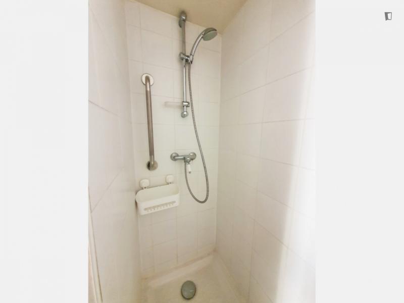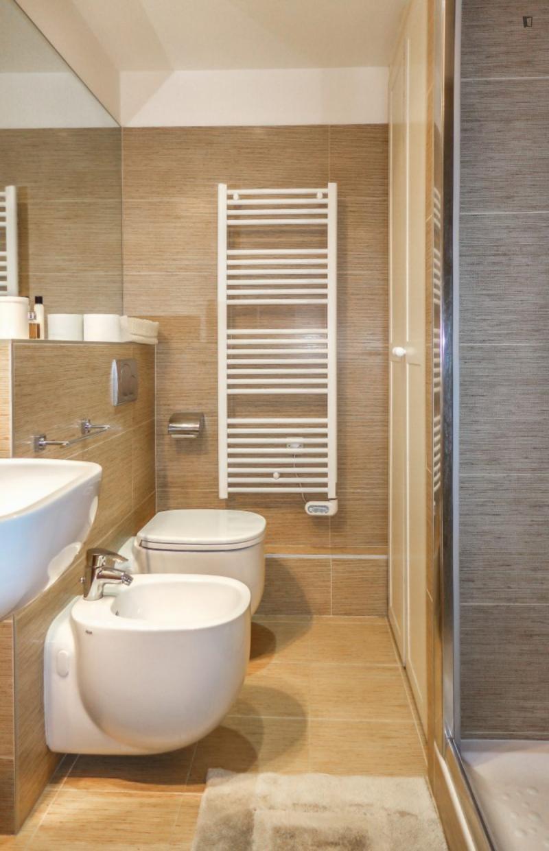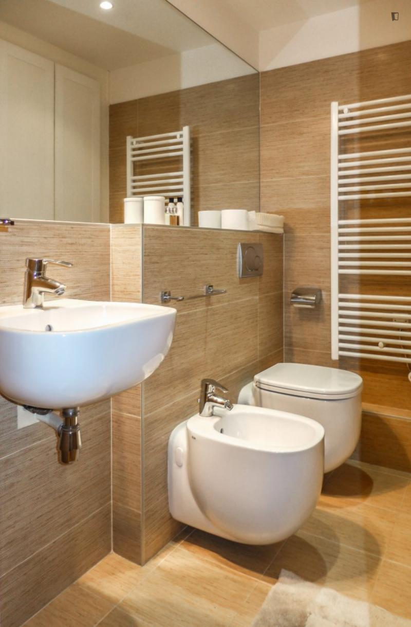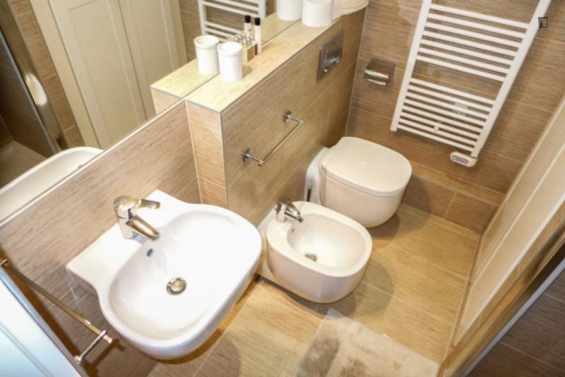 In the corridor is a modern bathroom with an Italian style shower cabin, toilets, bidet, and corner for the washing machine. The bedroom overlooking a nice courtyard is equipped with a double bed, a dressing and shelves.