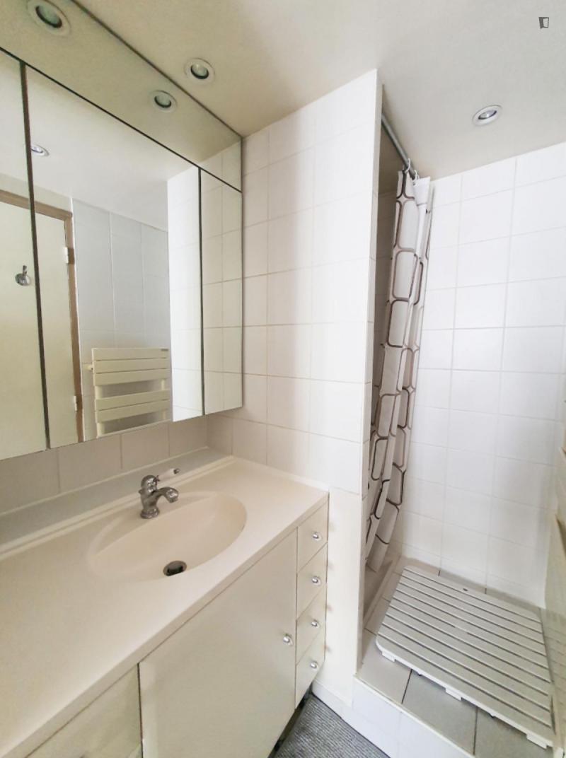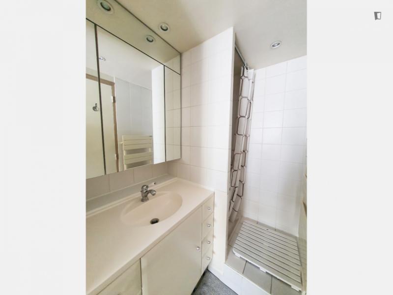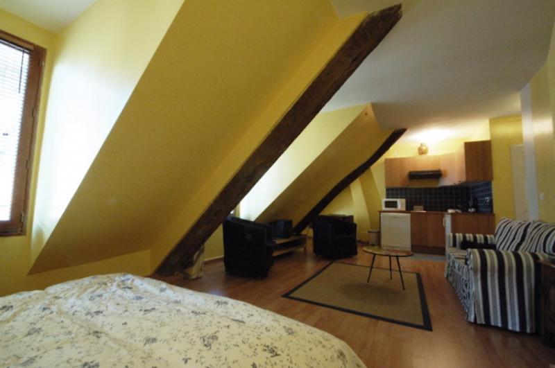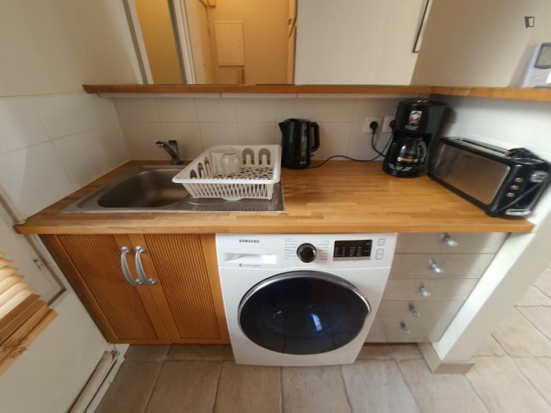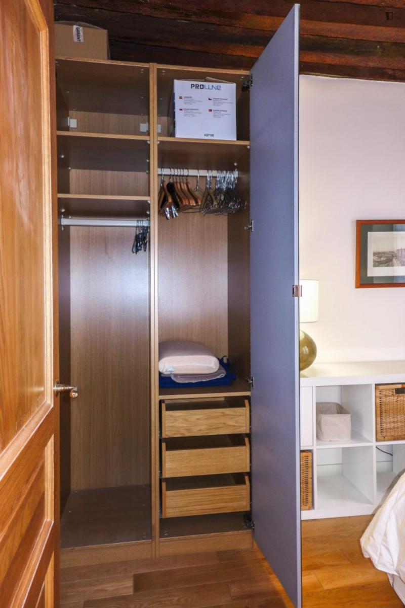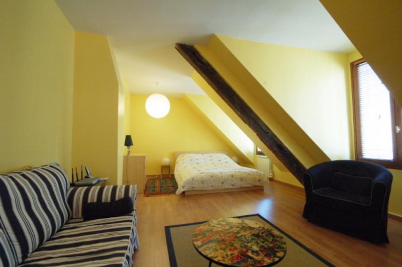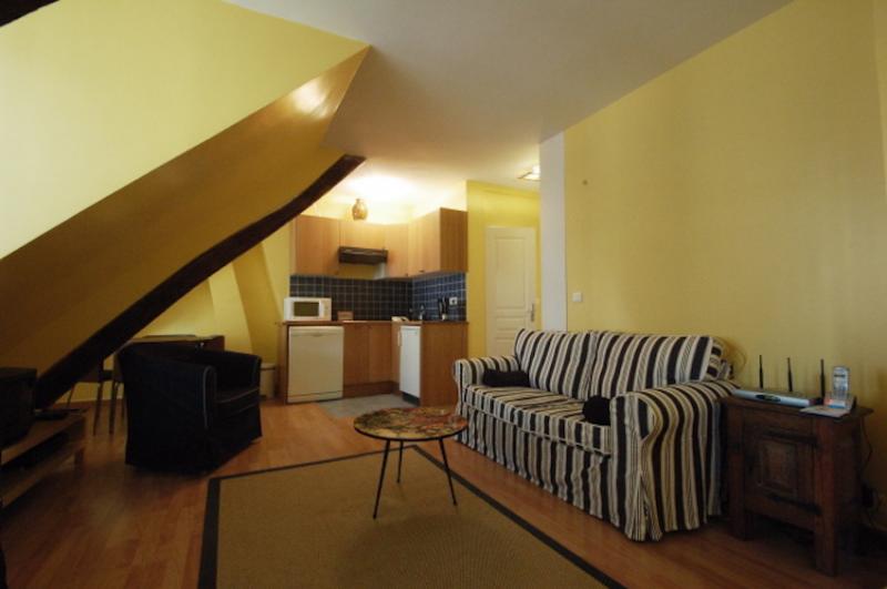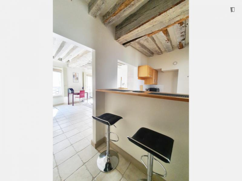 Charm and Character of typical Marais buildings, with beautiful authentic visible beams and hardwood floor. Recently renewed the flat features a lovely living room with a convertible sofabed. A dining table with 4 chairs, a TV corner, an open equipped kitchen fully equipped with oven, stoves, dishwasher, fridge, and freezer part.