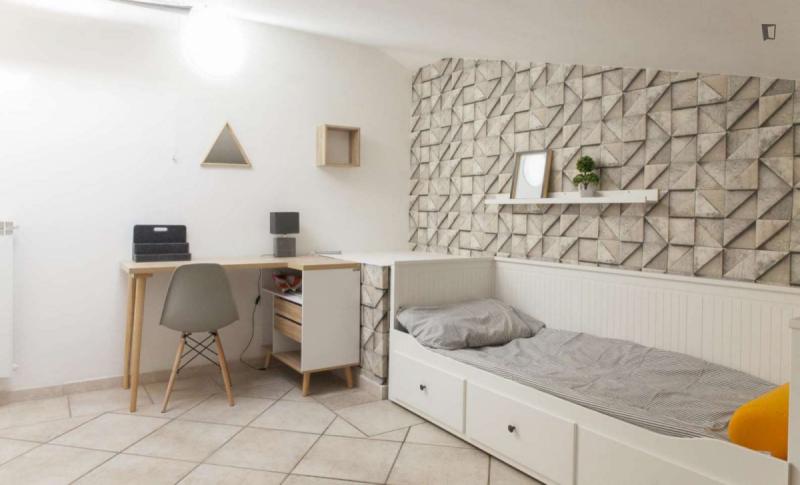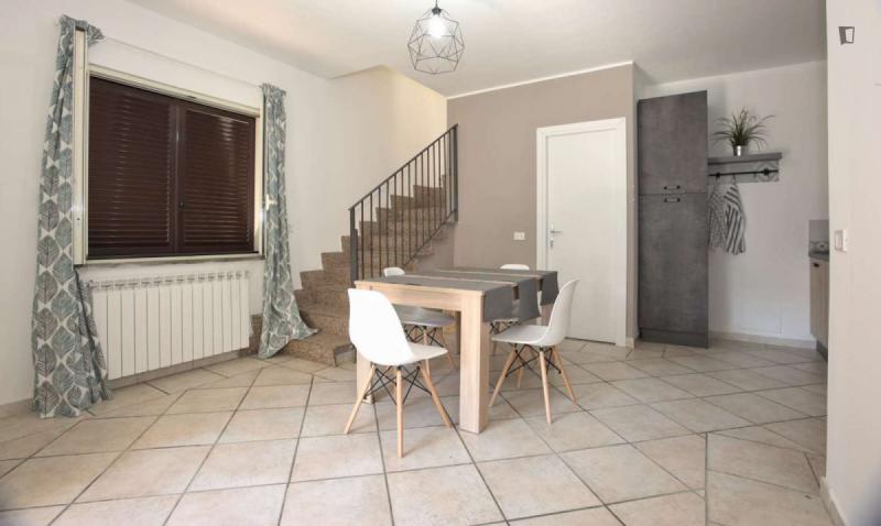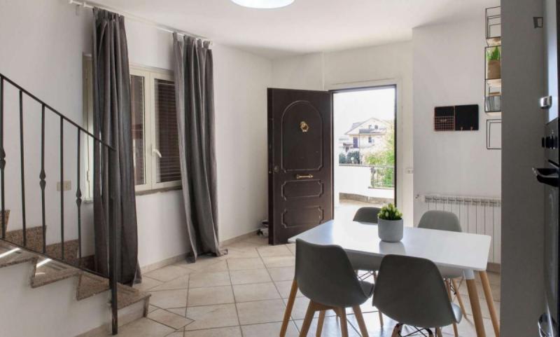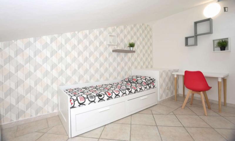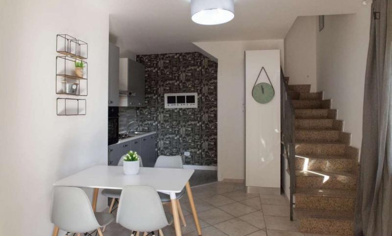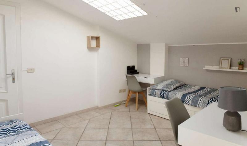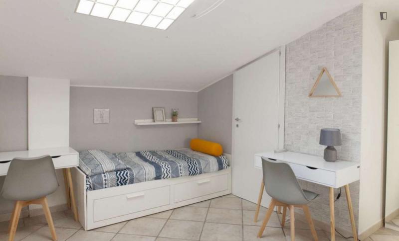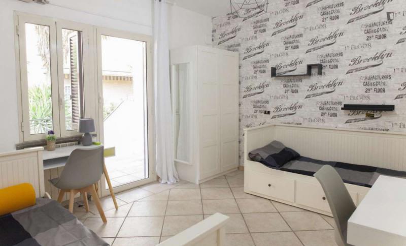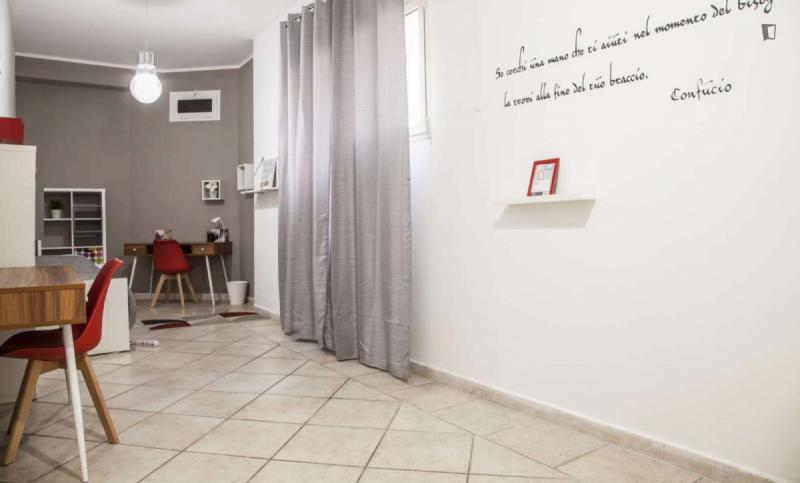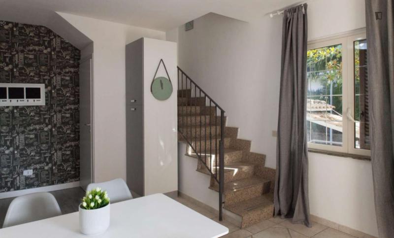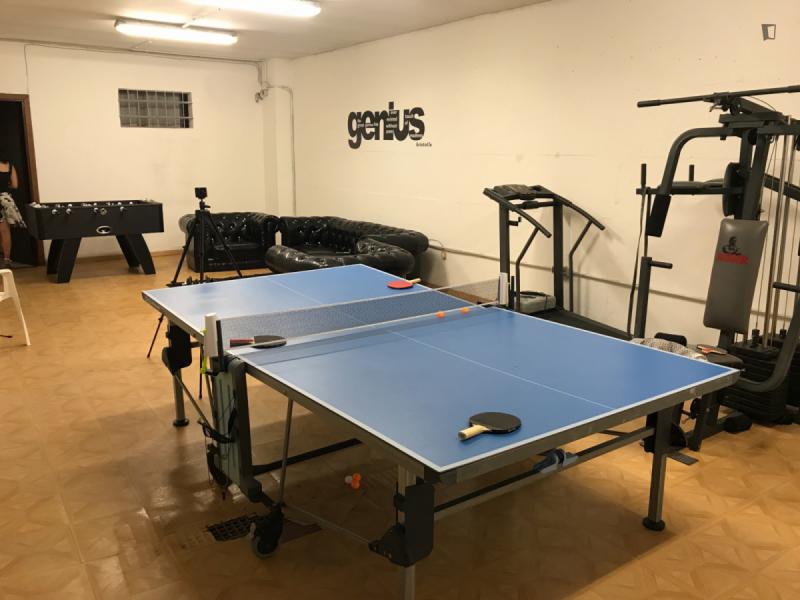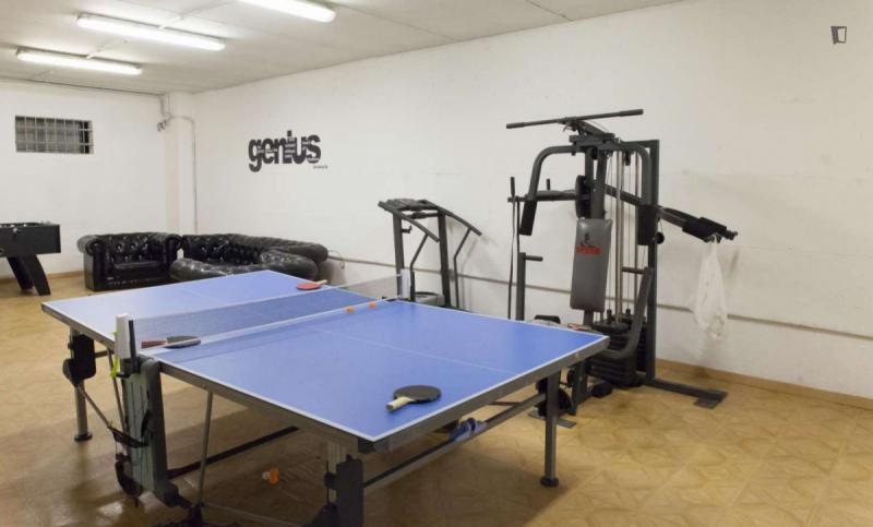 beautiful villa used as a university campus. Our idea has always been to create an environment that could put the student at the center, providing him with all the comforts and the possibility of creating a small community already inside the villa. The villa is very large, we have bedrooms, bathrooms, kitchen, hobby room, gym, study rooms, laundry. the added value is the common spaces both inside and outside, they offer a nice comfort, the common area with Ping-pong, table football, gym and cinema room, WIFI in the whole building, study room, in addition to the outdoor area with balconies, garden, parking for scooters and outdoor gazebo. The structure is just newly renovated in Nordic style. It is within walking distance of the supermarket, bar, post office and other useful commercial activities. At 50 meters from the bus stop and 500 meters from the FontaCandida metro station that connects the hotel directly to San Giovanni