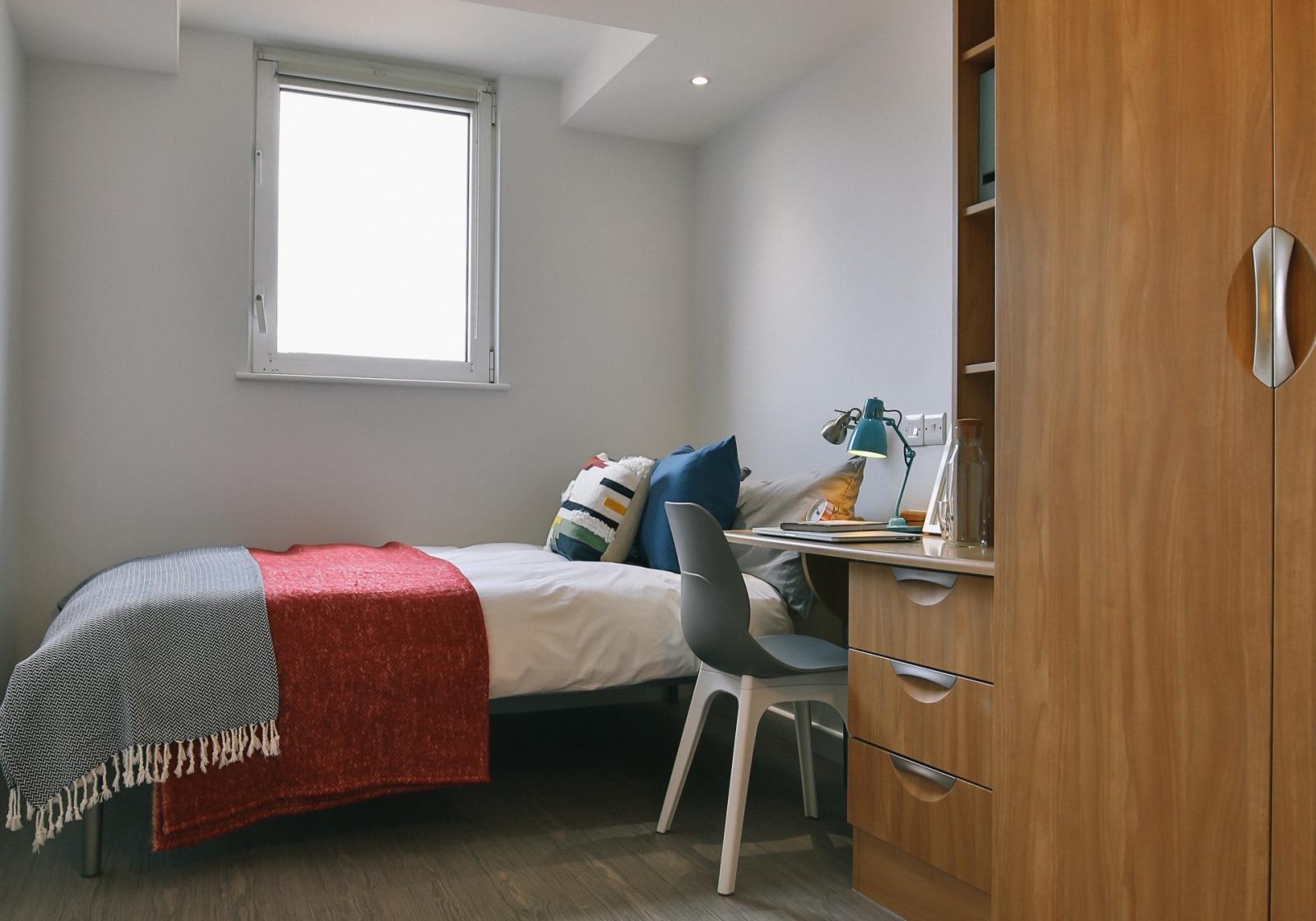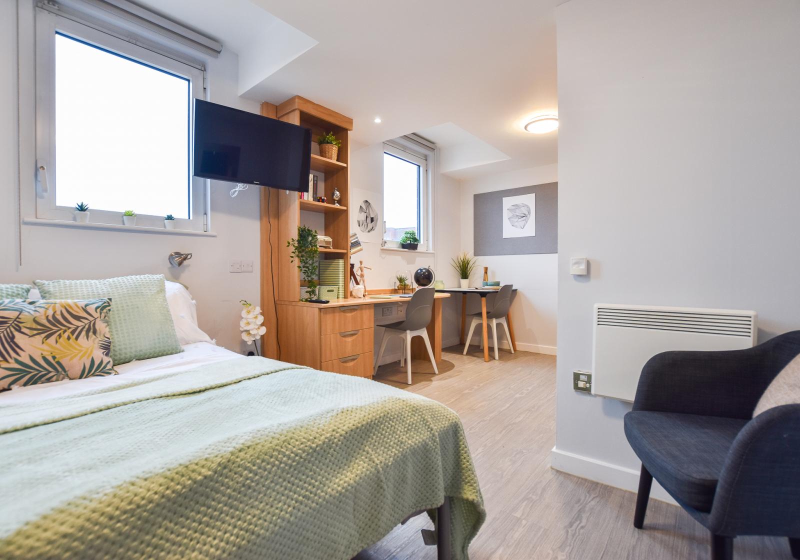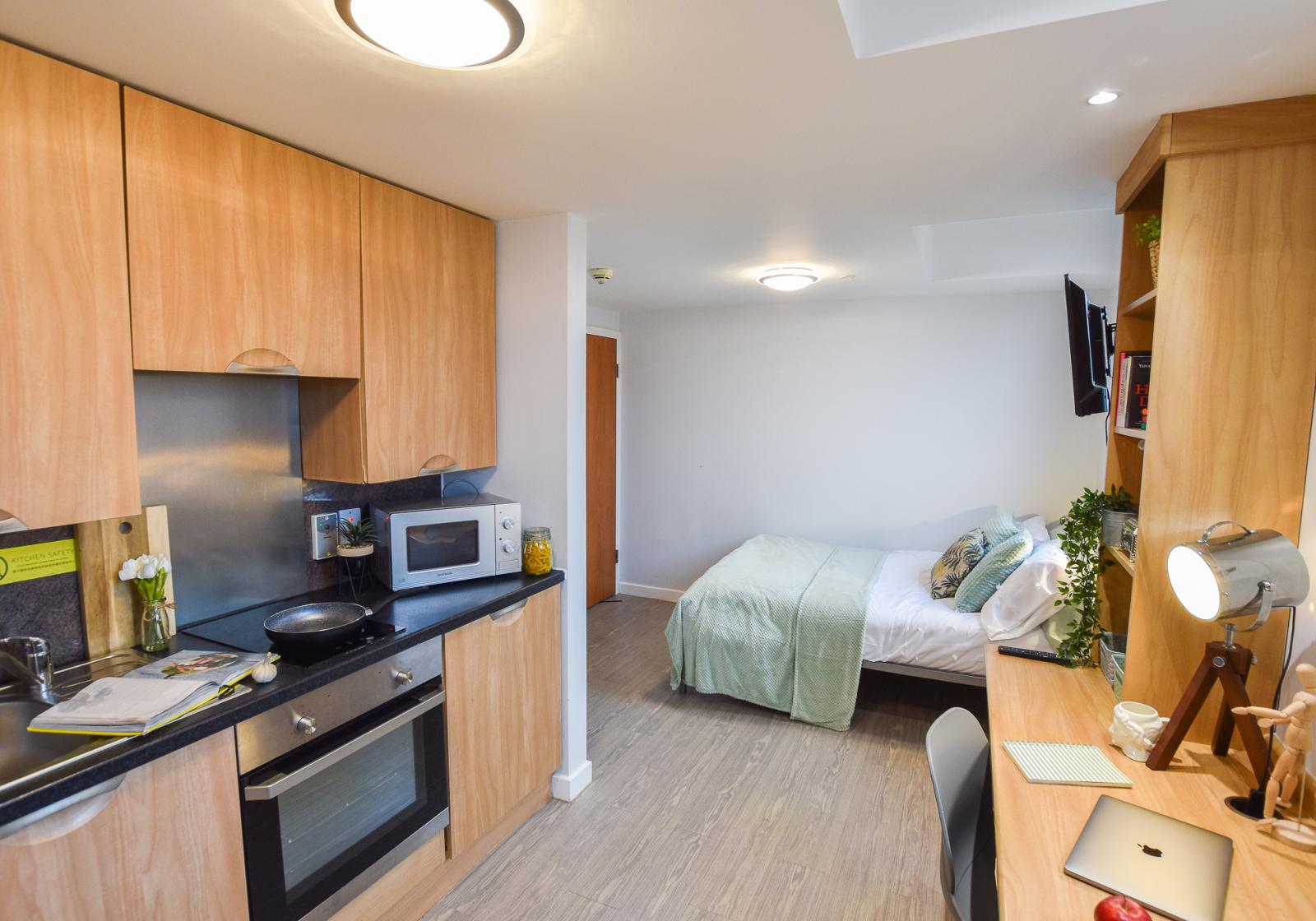 These studios have everything you need, with great facilities, lots of storage, study space and all the privacy you could want. They come with a private bathroom, kitchenette and full-size double bed as standard. You’ll also benefit from the building’s social spaces and laundry.