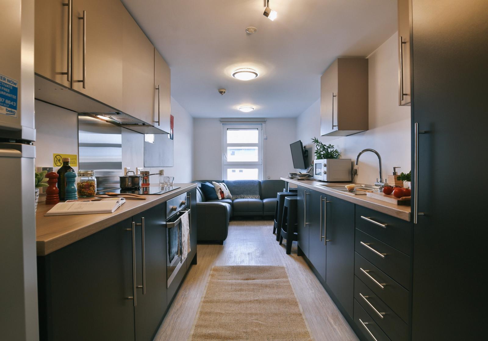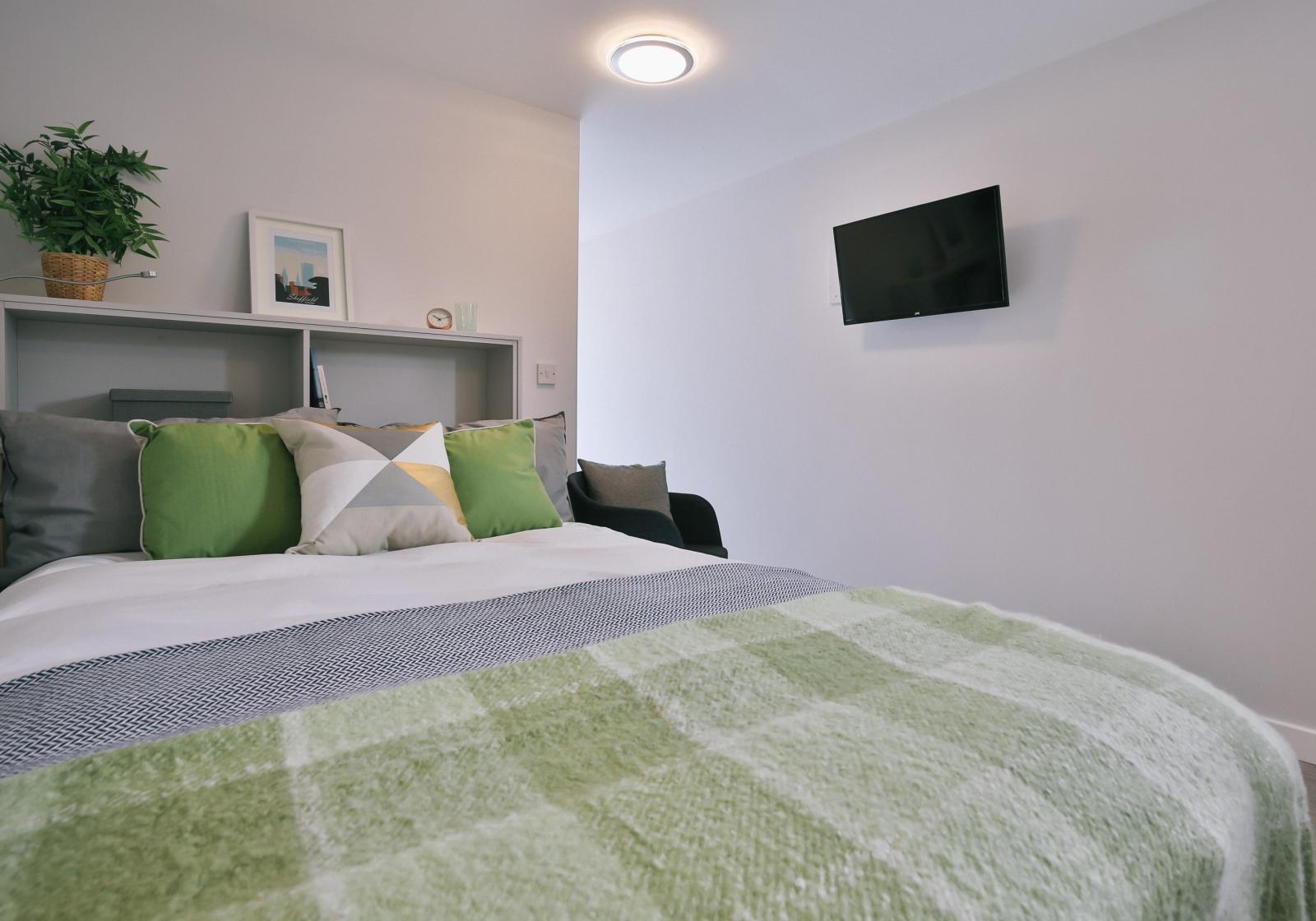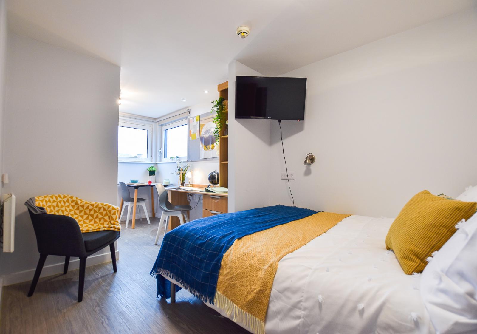 These modern-feel studios have everything you need, with great facilities, lots of storage, study space and all the privacy you could want. They come with private bathroom, kitchenette and full-size double bed as standard. You’ll also benefit from the building’s social spaces and laundry.