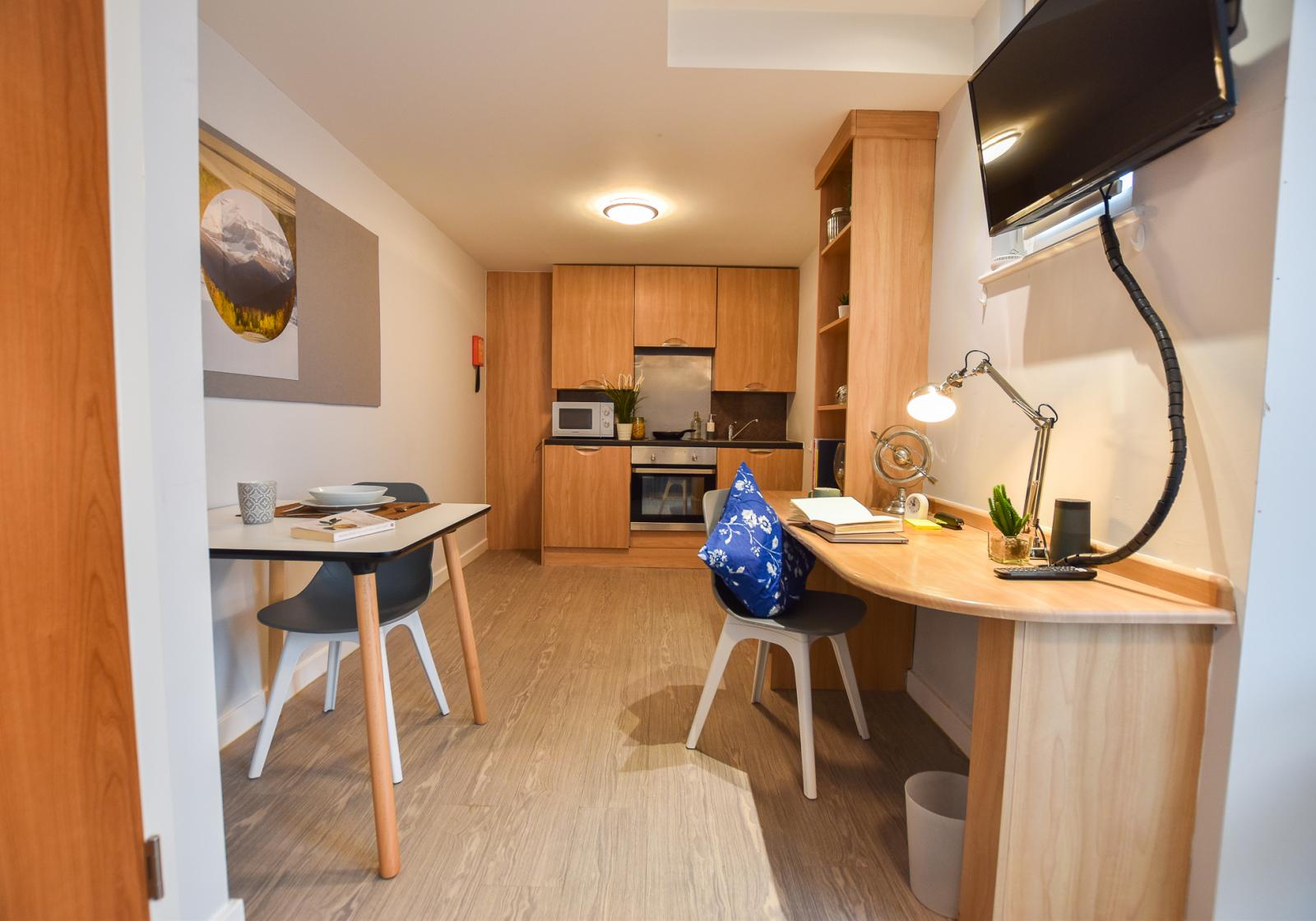These modern studios have everything you need, with great facilities, lots of storage, study space and all the privacy you could want. They come with a private bathroom, kitchenette and full-size double bed as standard. You’ll also benefit from the building’s social spaces and laundry.