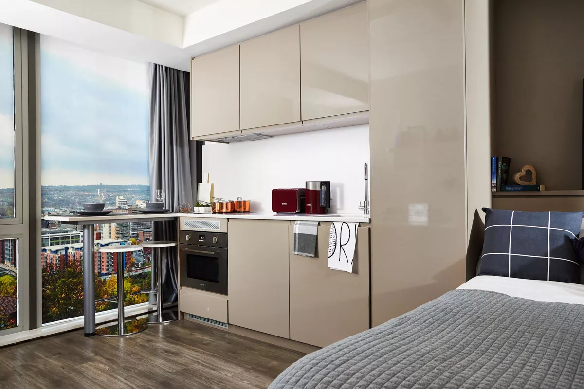 With just 12 min walk from Sheffield Hallam University and 14 min bus ride from the University of Sheffield, Cosmos student accommodation is the perfect place for students to live in Sheffield. There are both spacious ensuites with private bathrooms as well as private studios available to manage students’ every need. The facility includes amenities like an onsite gym, rooftop terrace, free wifi, a common courtyard, and a game room. All bills are included in the rent of Cosmos accommodation.
