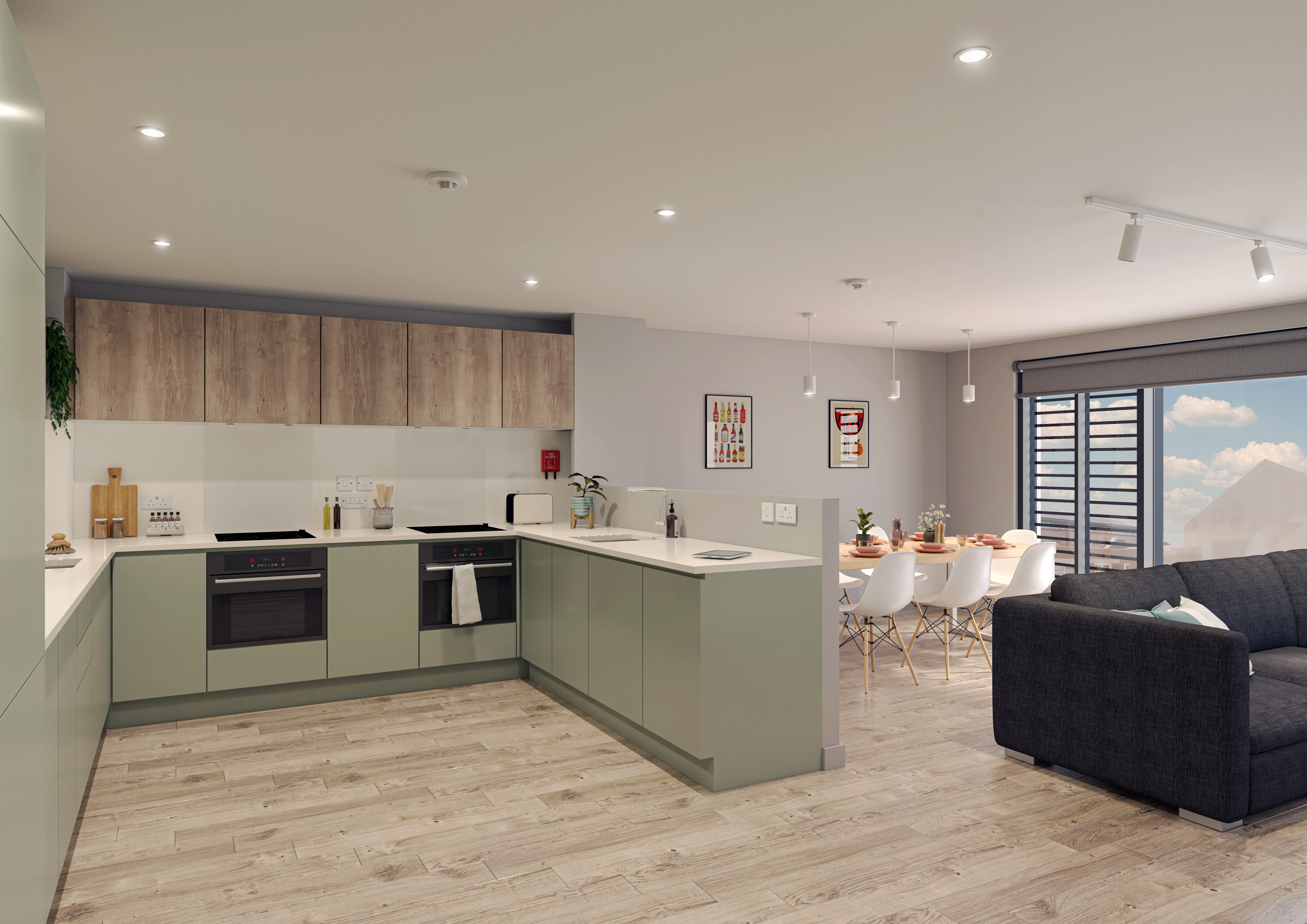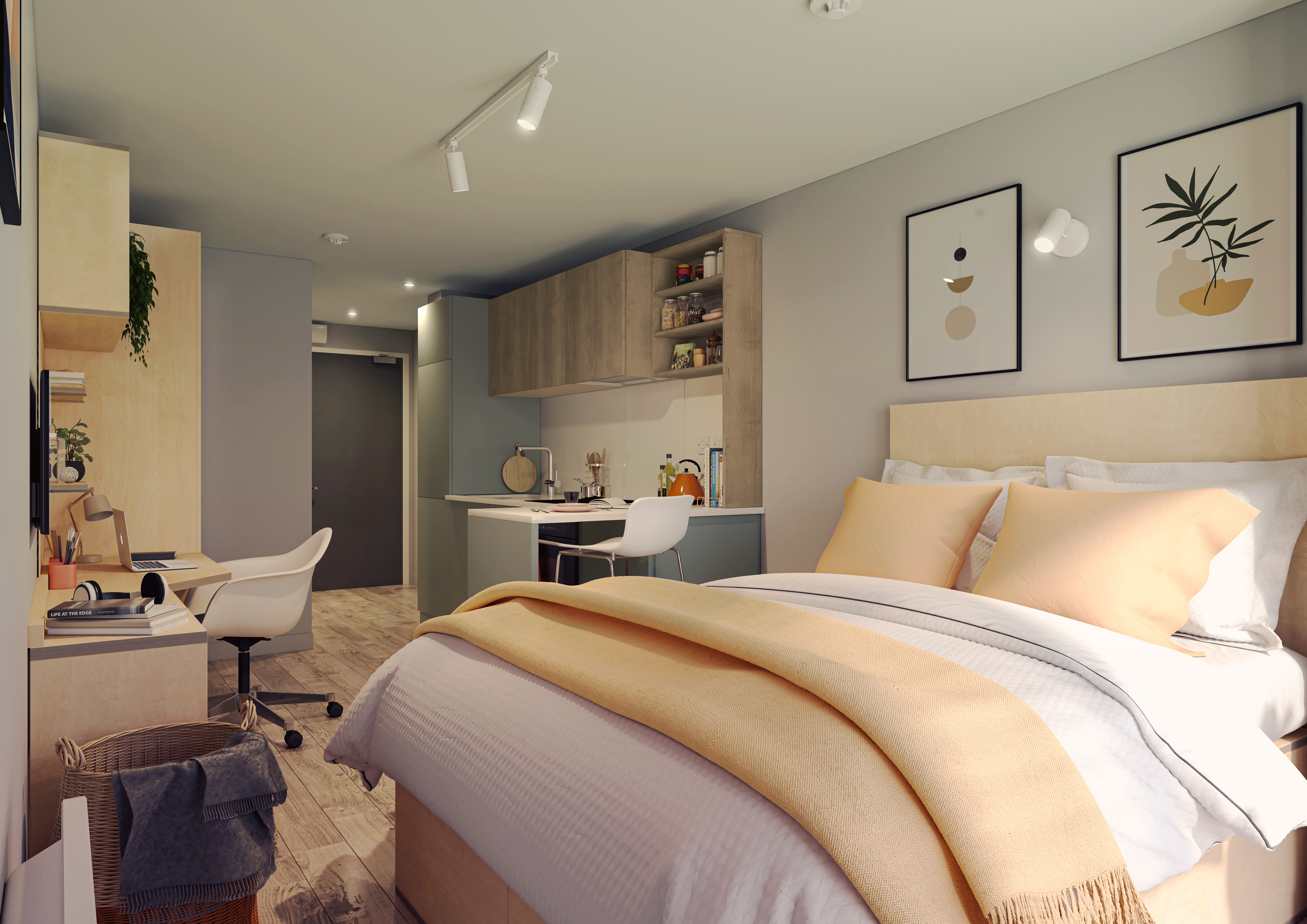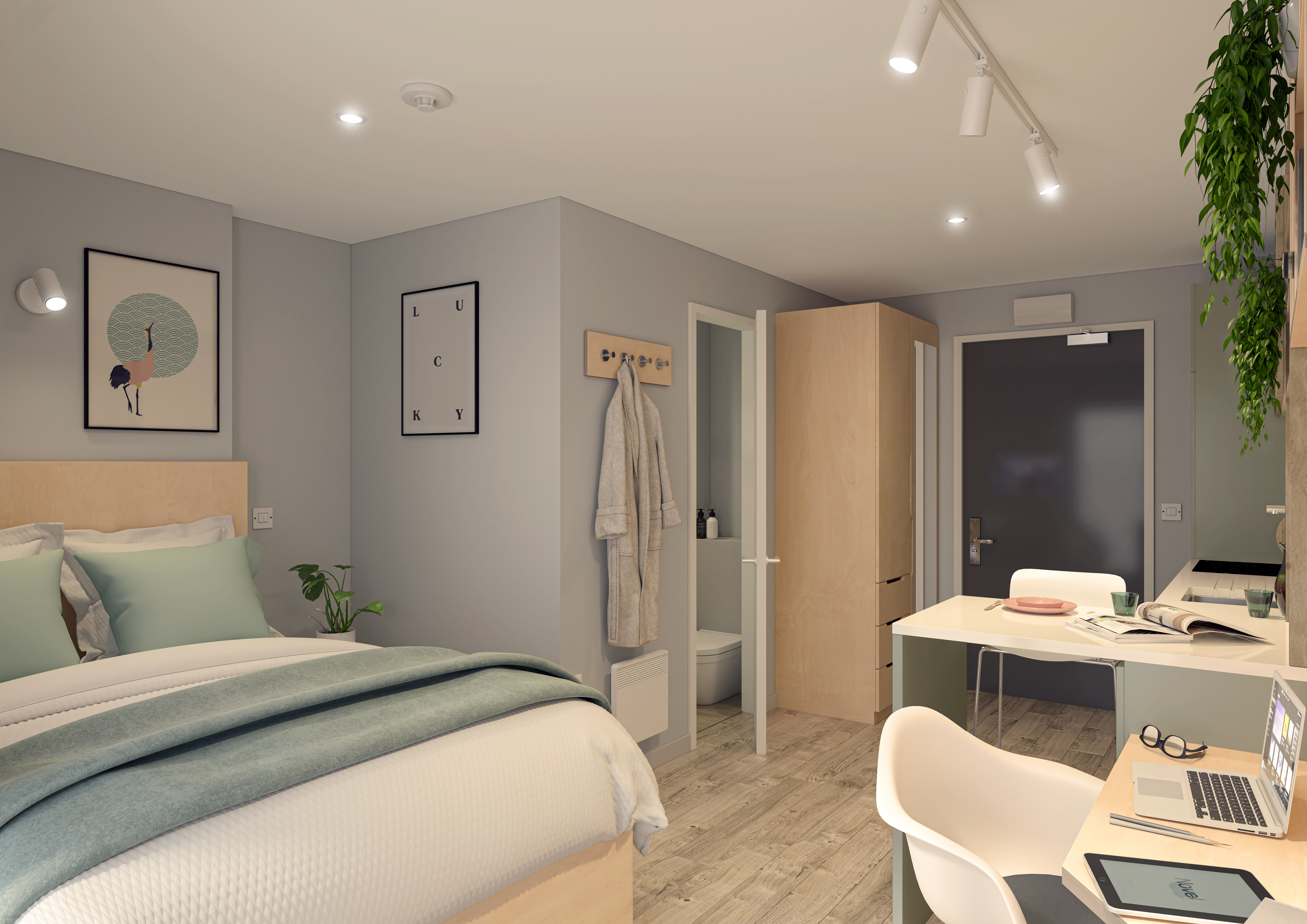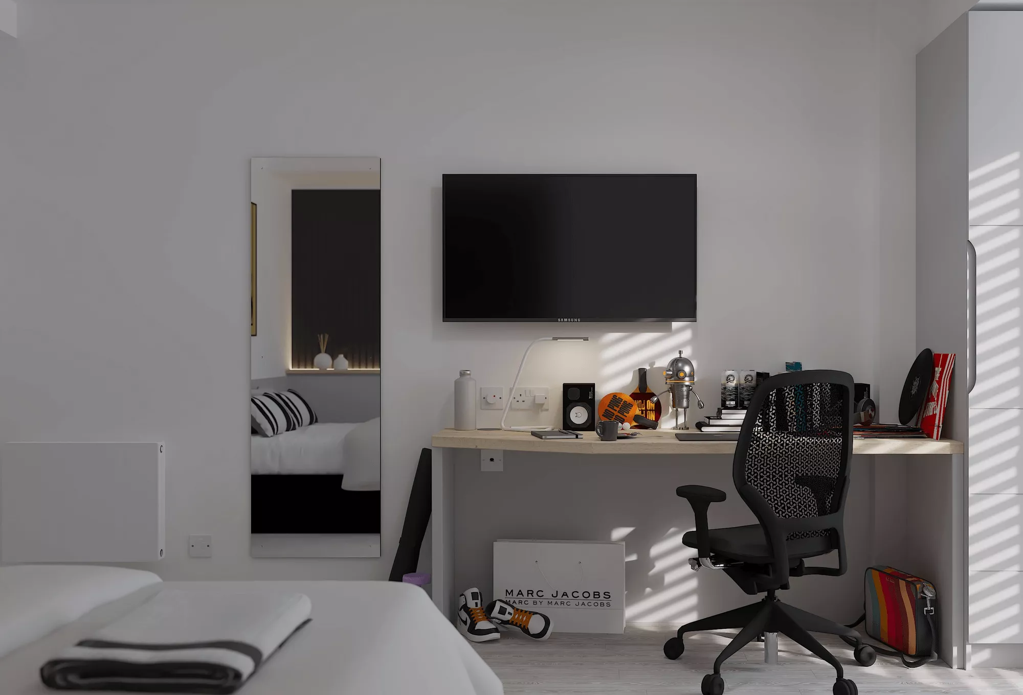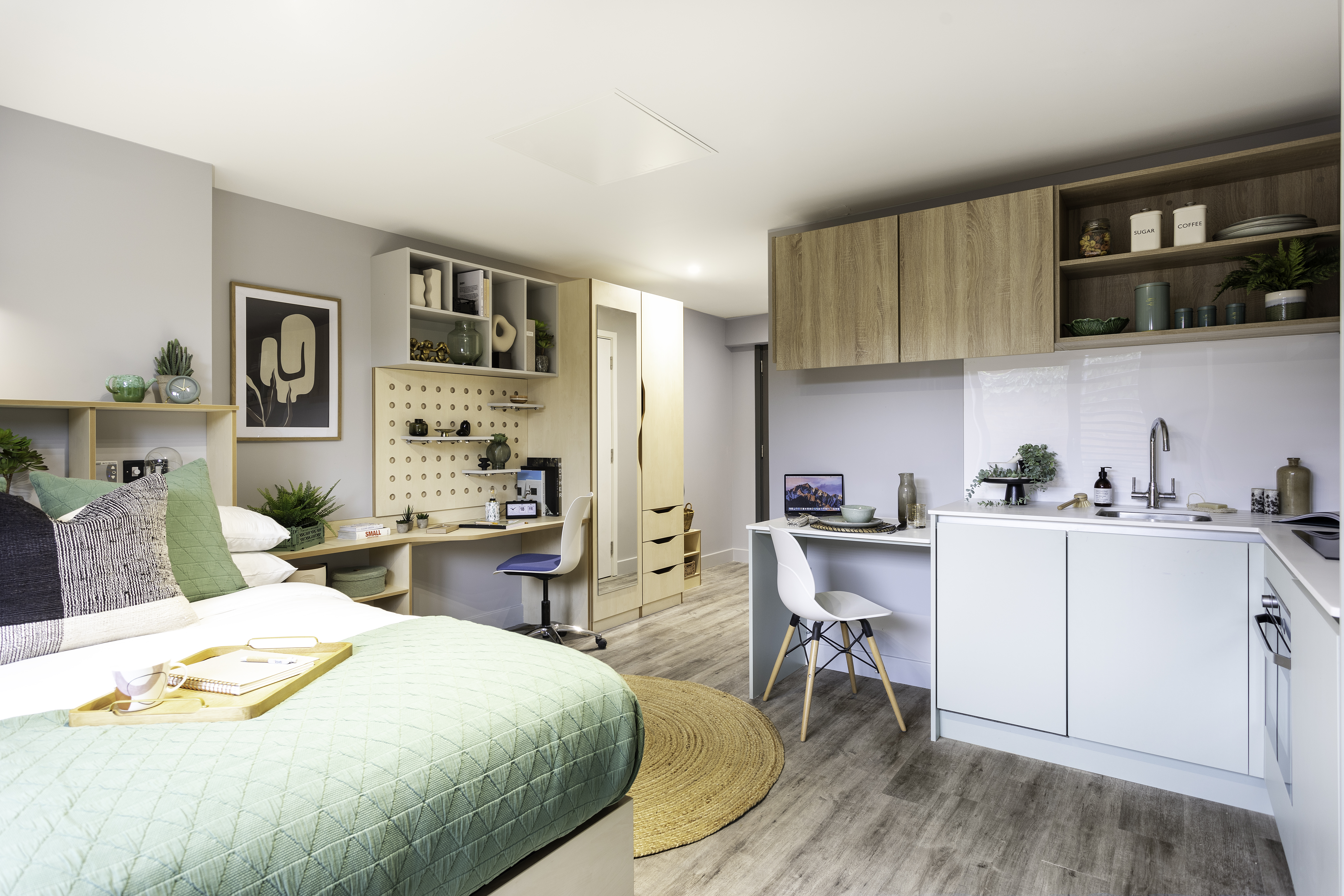 The apartments at Alma Place are self-contained, perfect if you want extra privacy, have their own bathrooms and have lots of storage. The en-suite apartments offer a communal living area with a sofa and 50-inch Smart TV, a dining area, a fully equipped kitchenette, and washer-dryers for people wishing to share with friends or meet new flatmates.