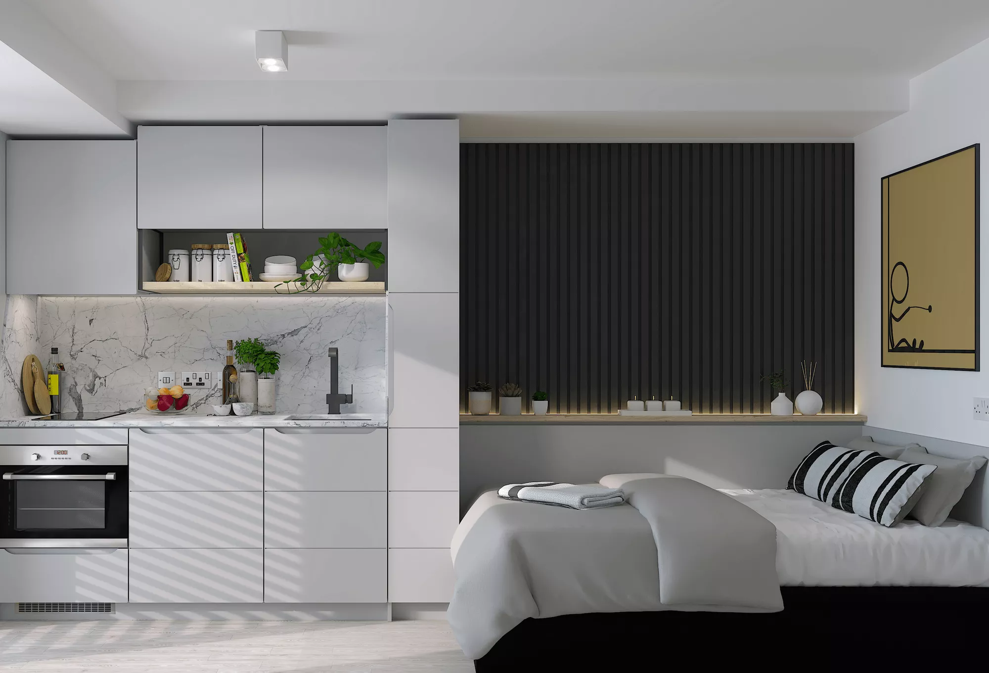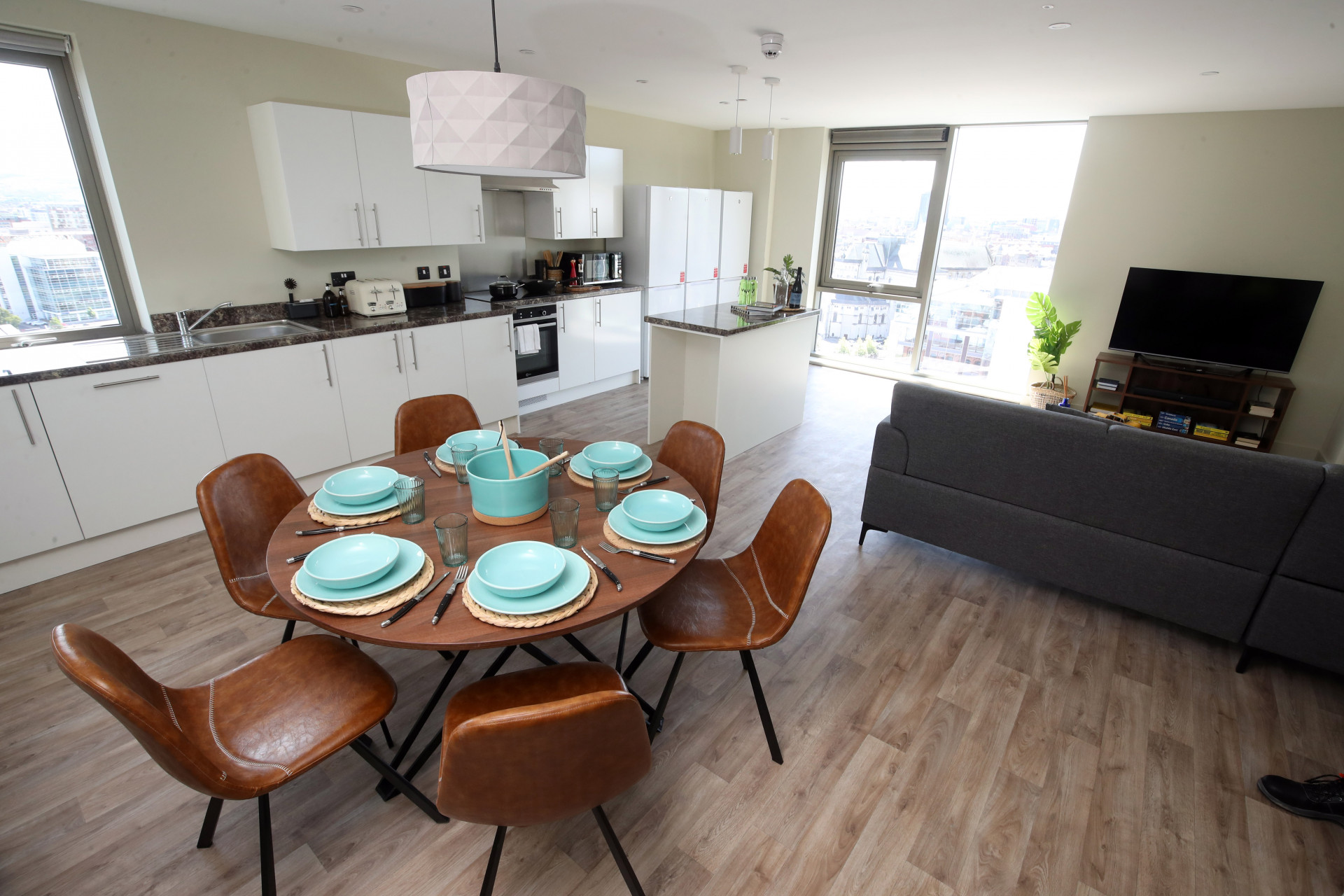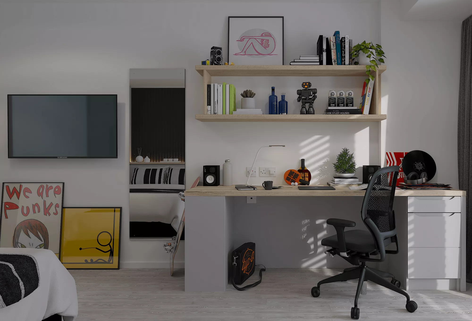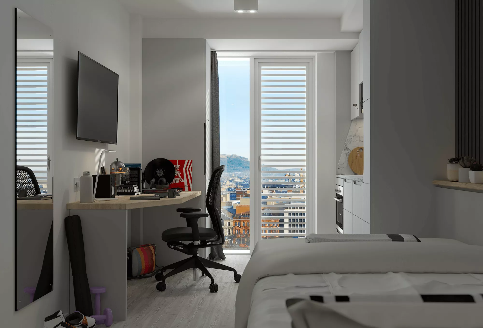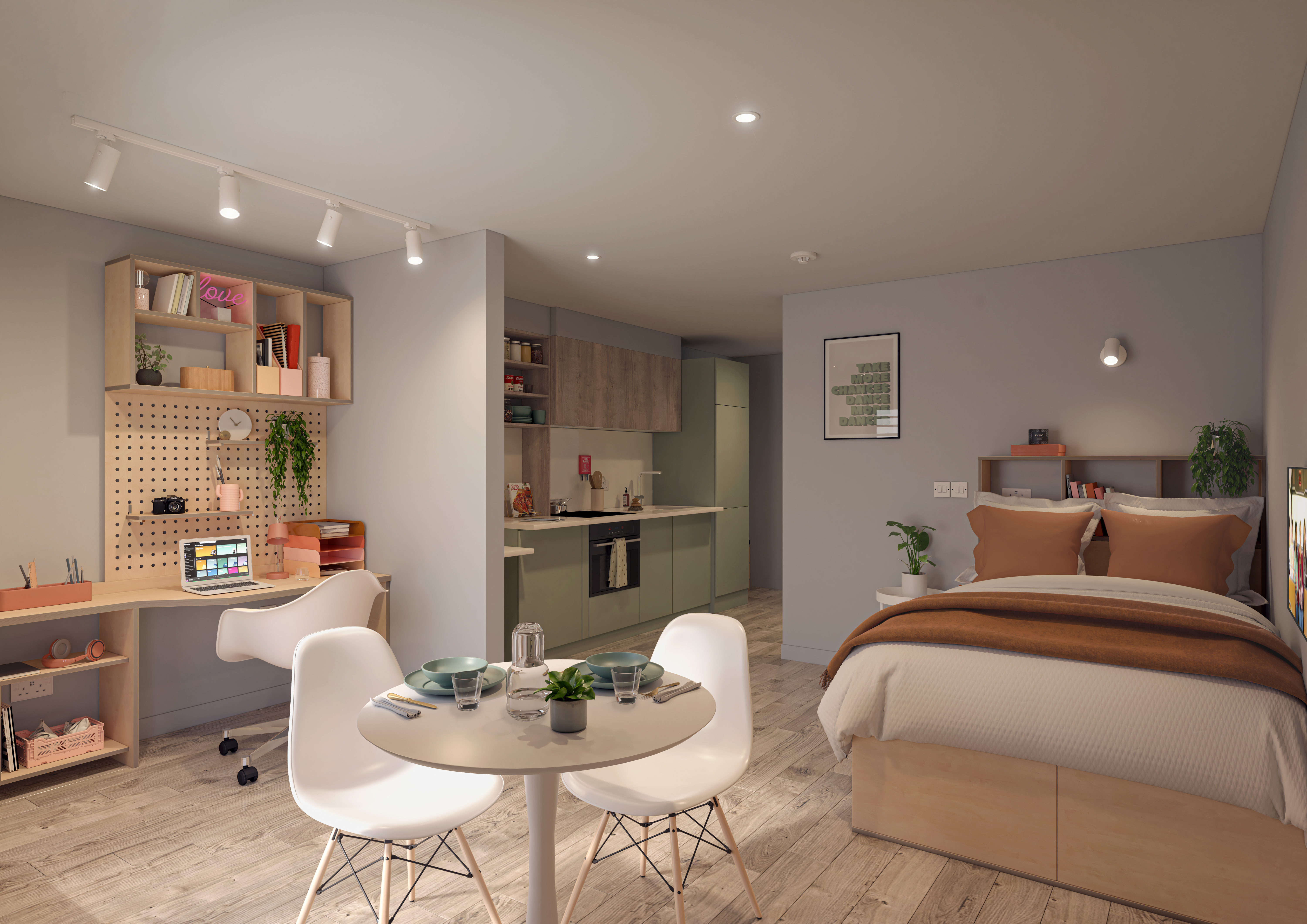 The apartments at Alma Place are self-contained, perfect if you want extra privacy, have their own bathrooms and have lots of storage. The en-suite apartments offer a communal living area with a sofa and 50-inch Smart TV, a dining area, a fully equipped kitchenette, and washer-dryers for people wishing to share with friends or meet new flatmates.