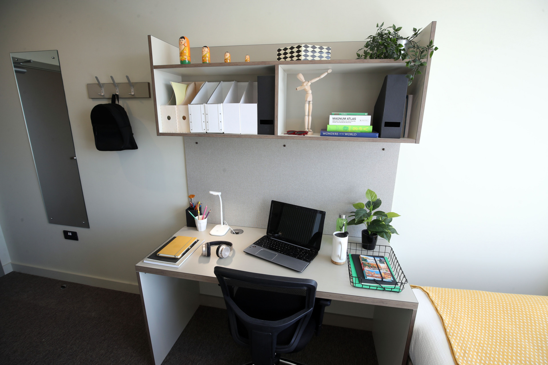 The amenities typically included in student rooms in Belfast include air conditioning, hot water, a bed, Dishwasher, a microwave, Electric Stove, Internet, Fridge, Bookshelf, and a desk.